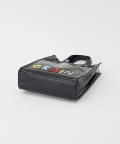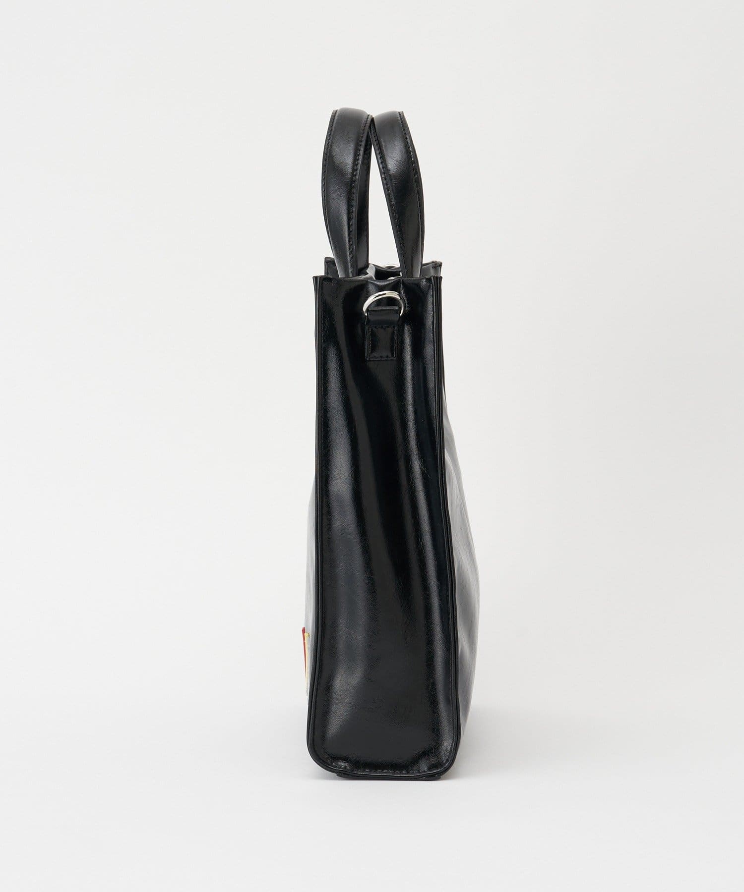 艶のあるフェイクレザーにカラーロゴをあしらった、遊び心漂うトートバッグ。