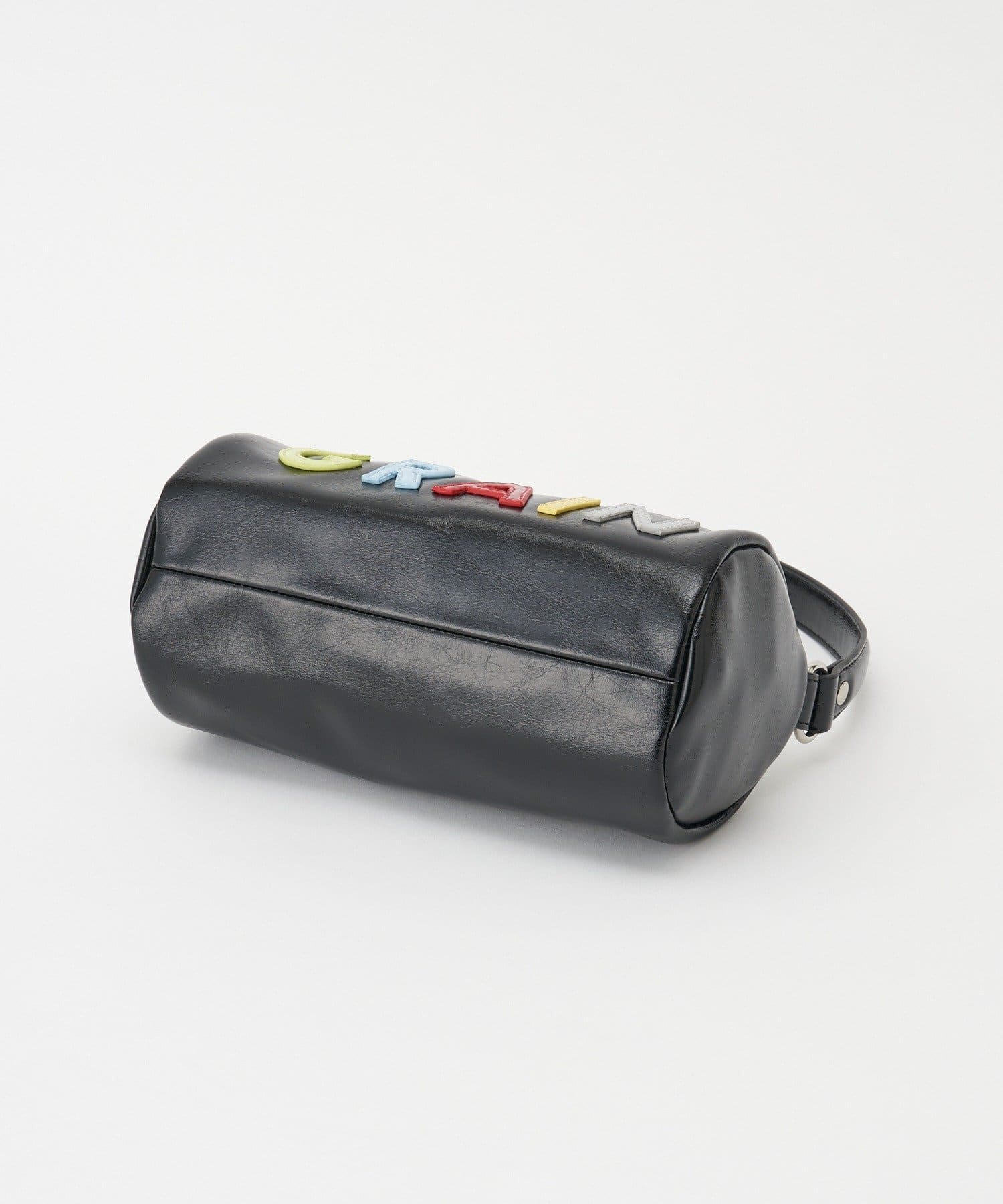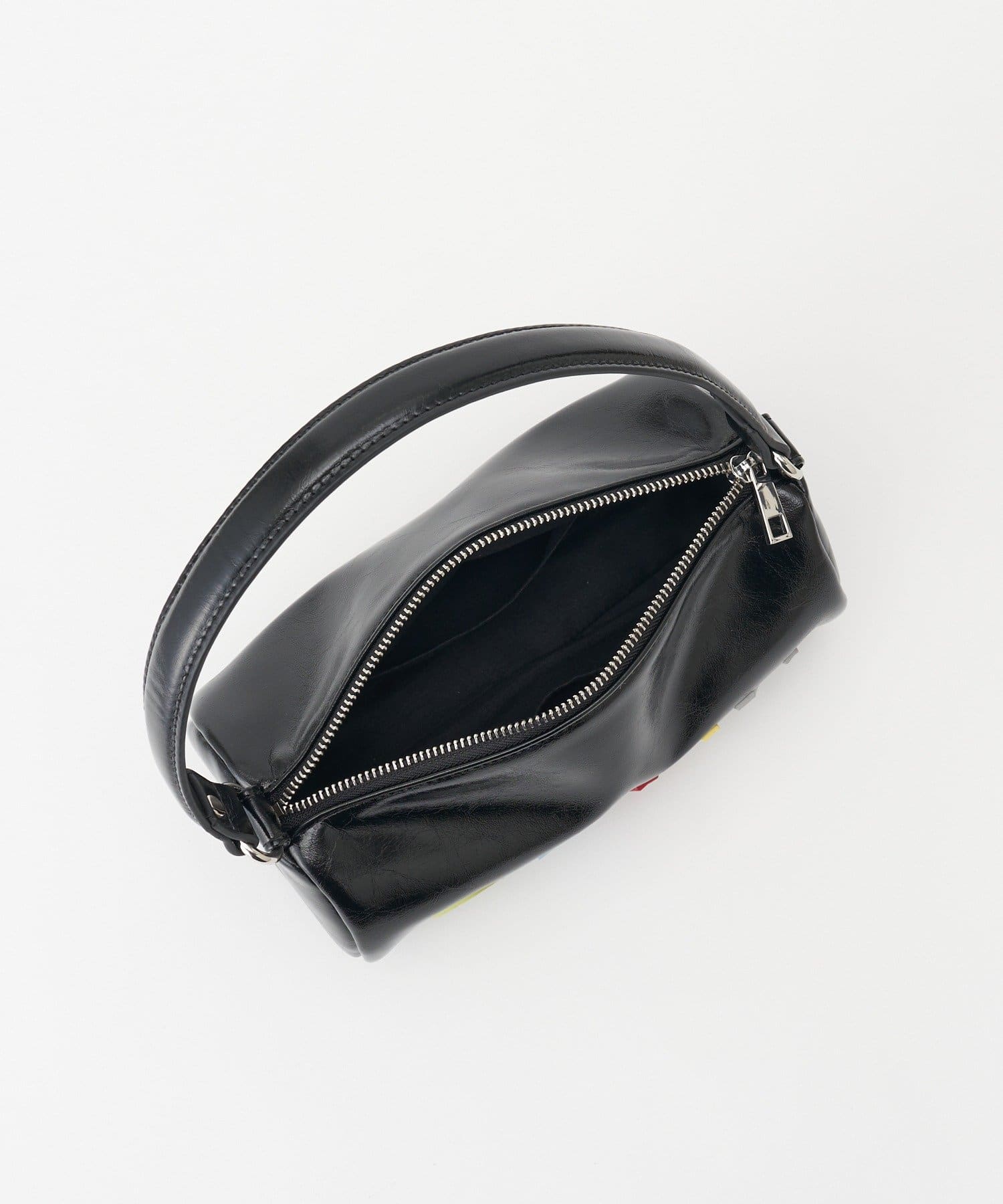 艶のあるフェイクレザーに、カラフルなロゴワッペンを大胆にあしらったワンショルダーバッグ。