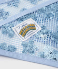 この製品に使用しているスパンコール刺繍は、強い摩擦や衝撃を加えると取れる恐れがあり、縫い付けた糸が切れると修理、復元が困難ですので糸切れにご注意ください。