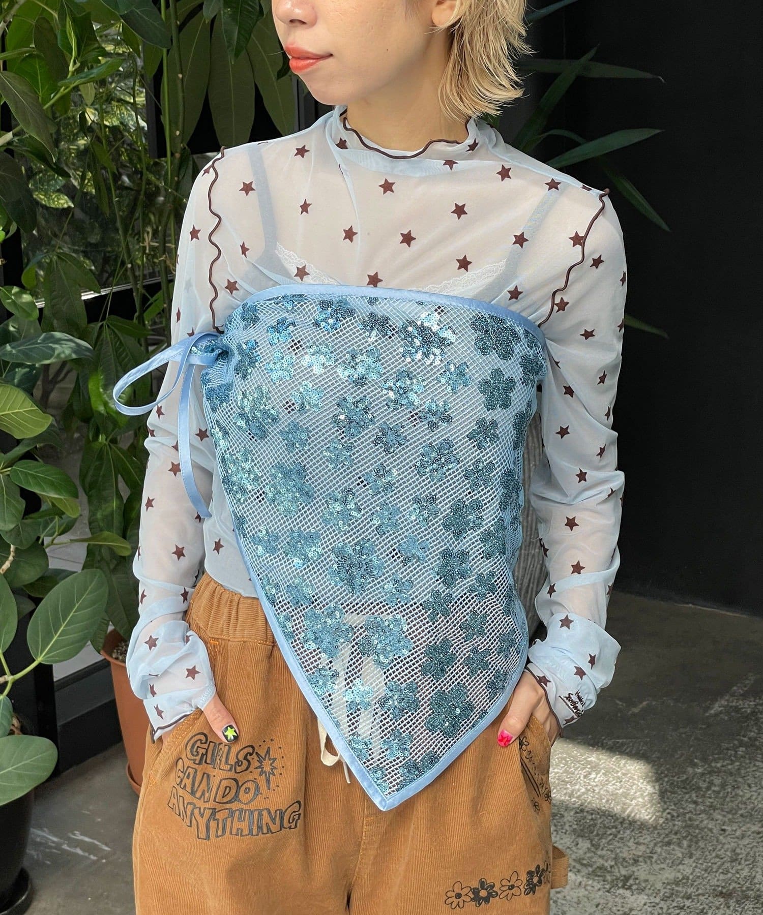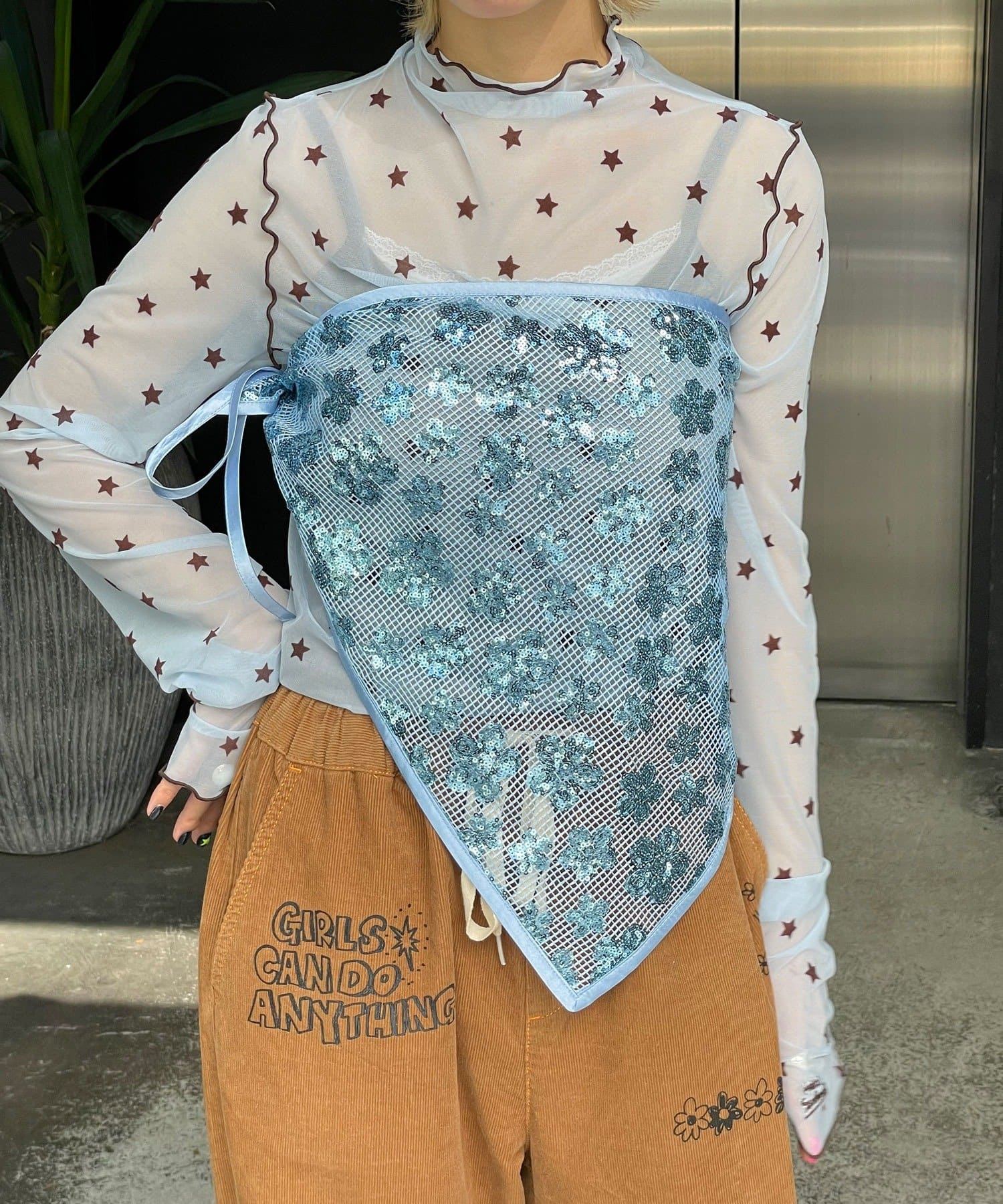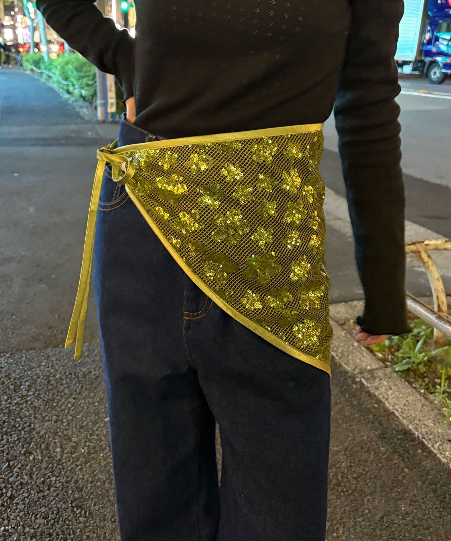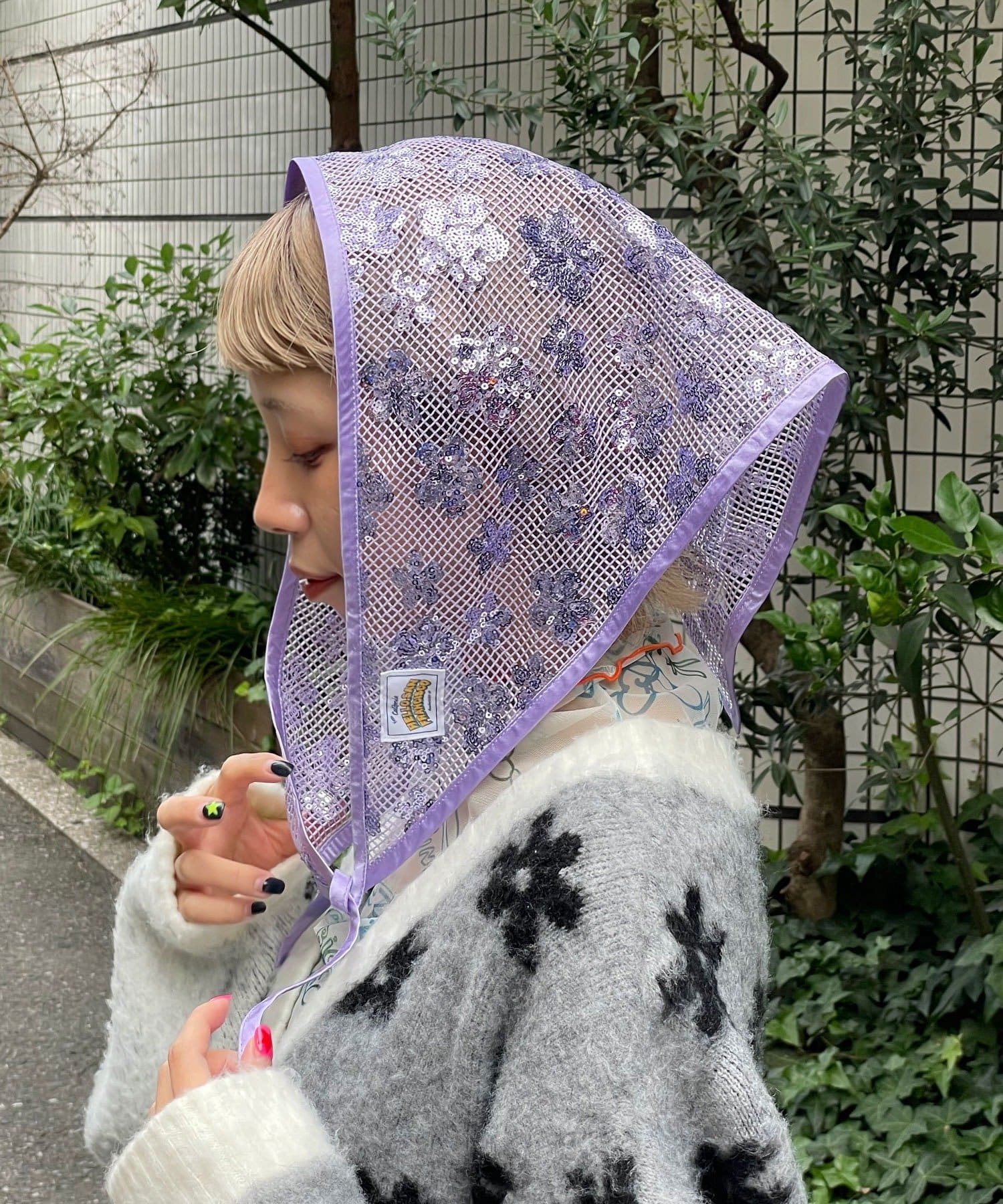 キラキラのスパンコールが目を惹く三角スカーフ。
