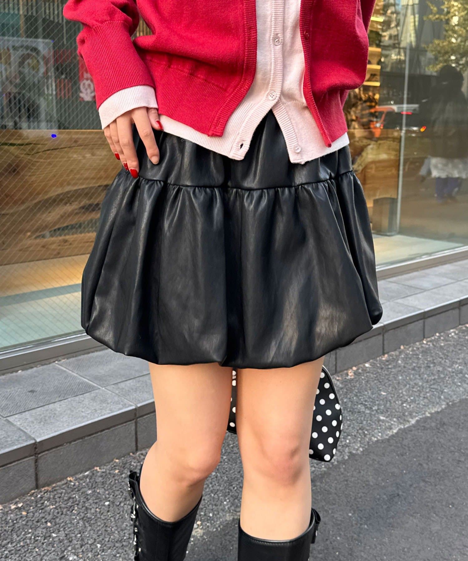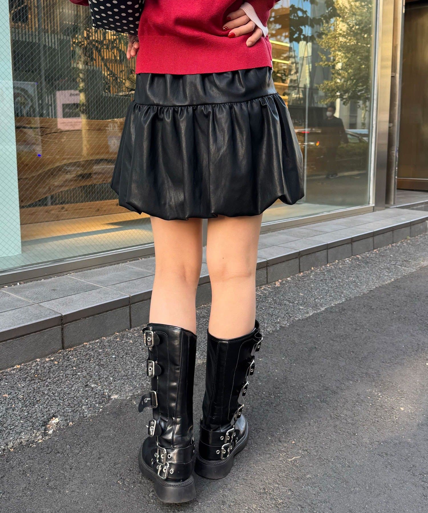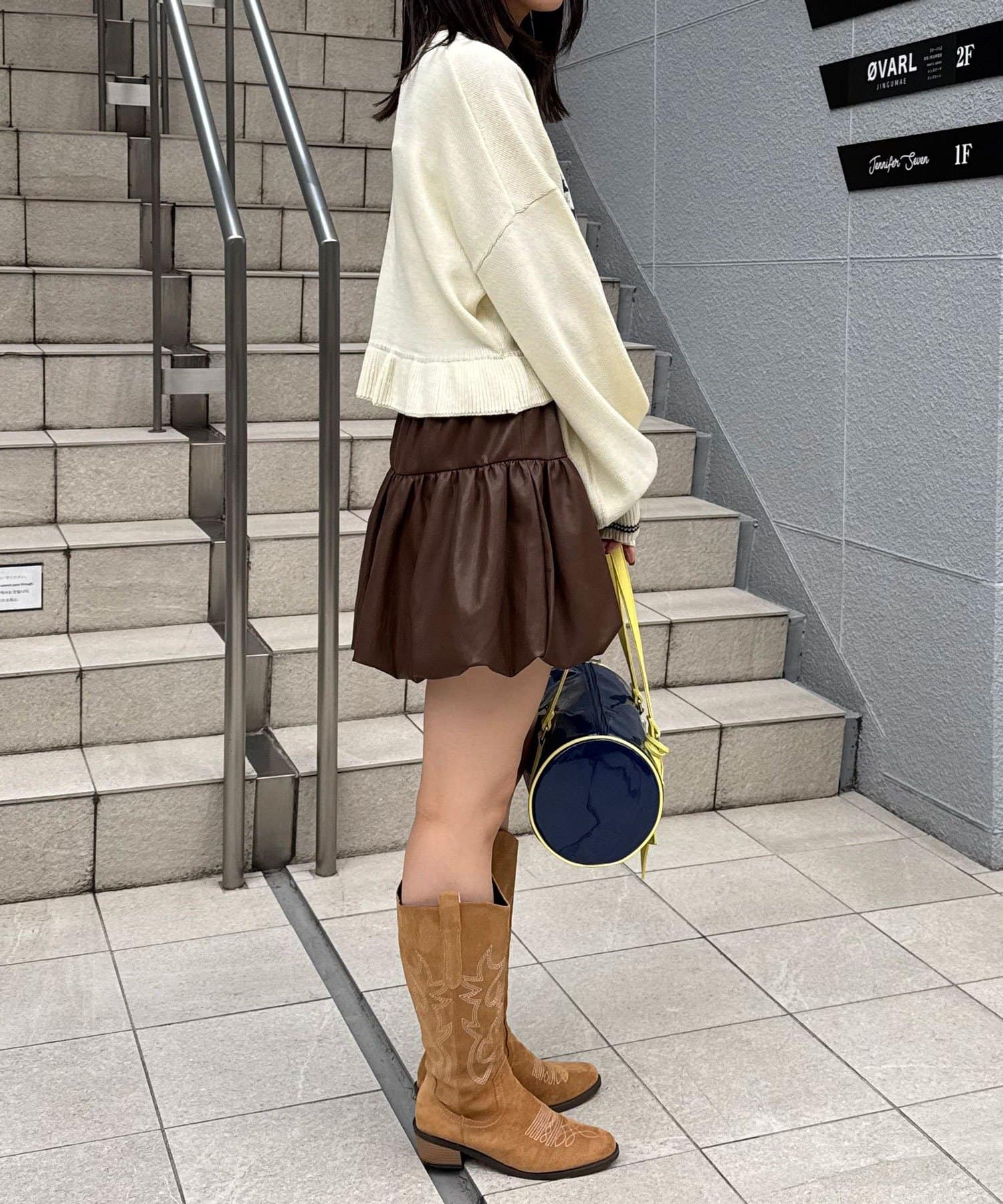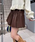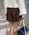 バルーンシルエットで立体感を出したフェイクレザースカート。