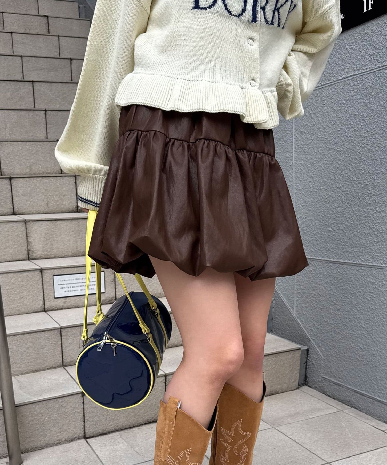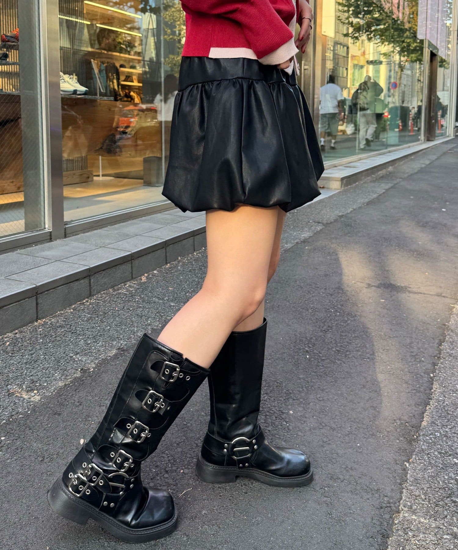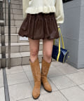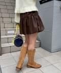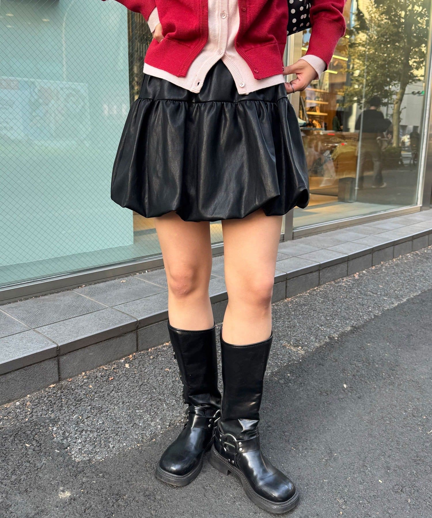 バルーンシルエットで立体感を出したフェイクレザースカート。