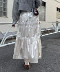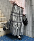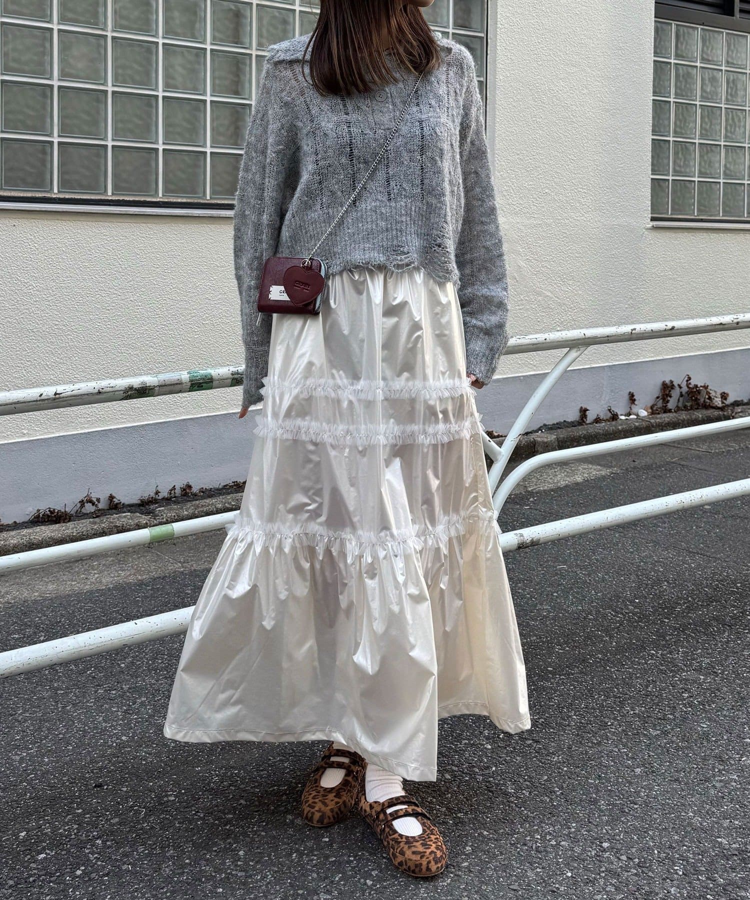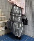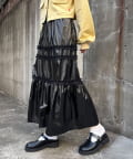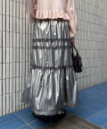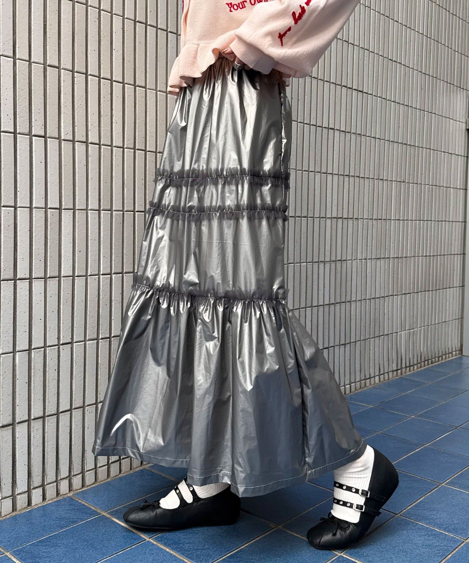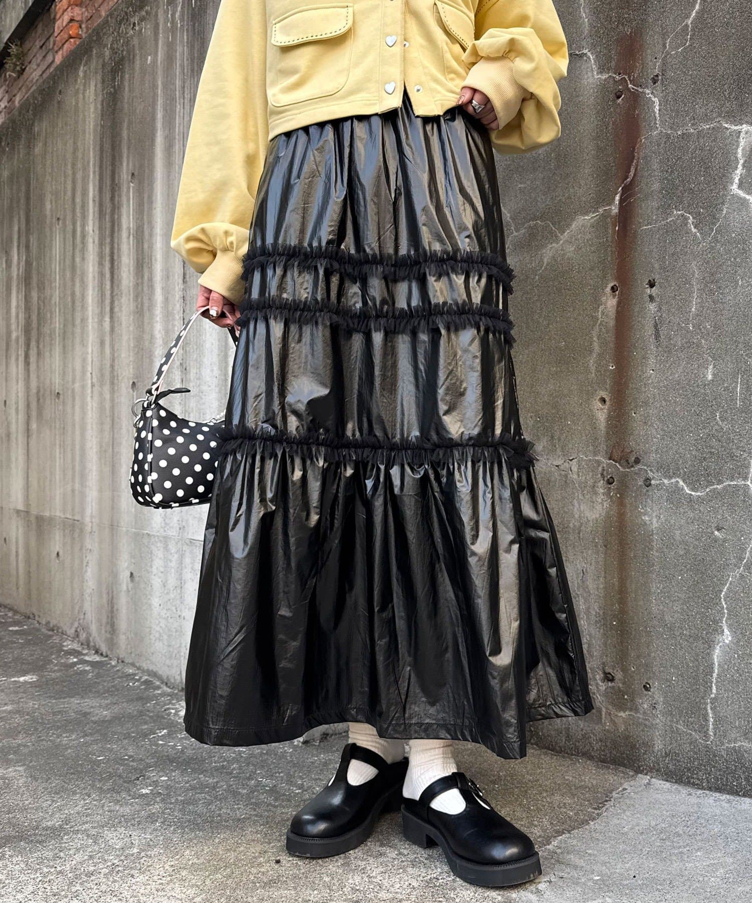 シャイニーな質感が目を引く、ティアードデザインのチュールフリルスカート。