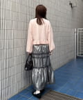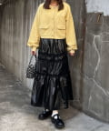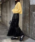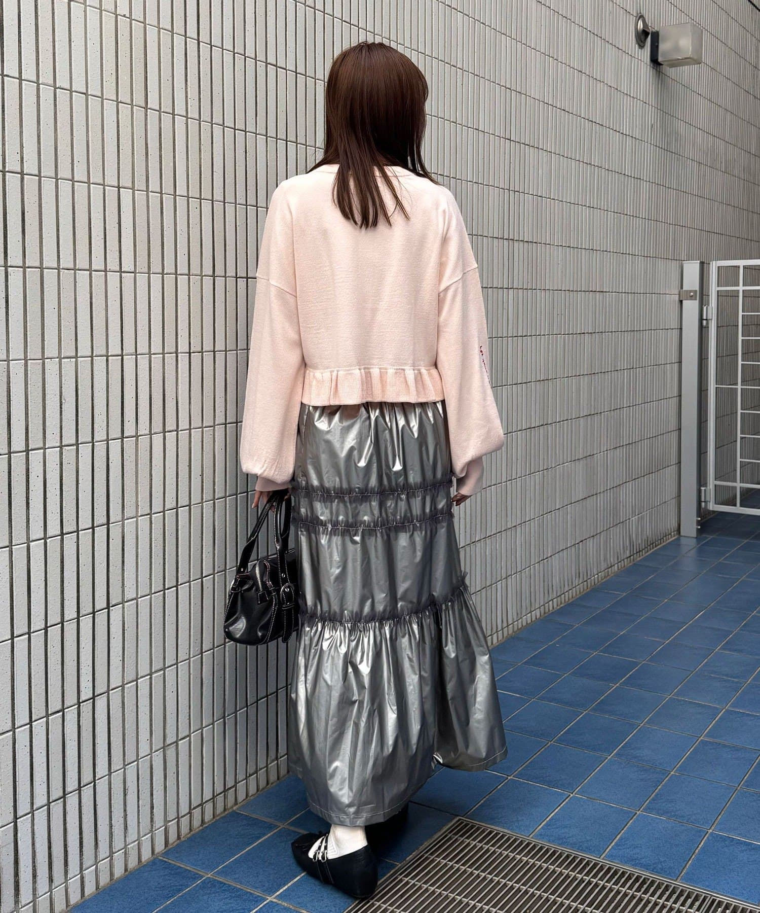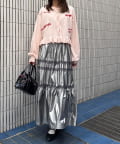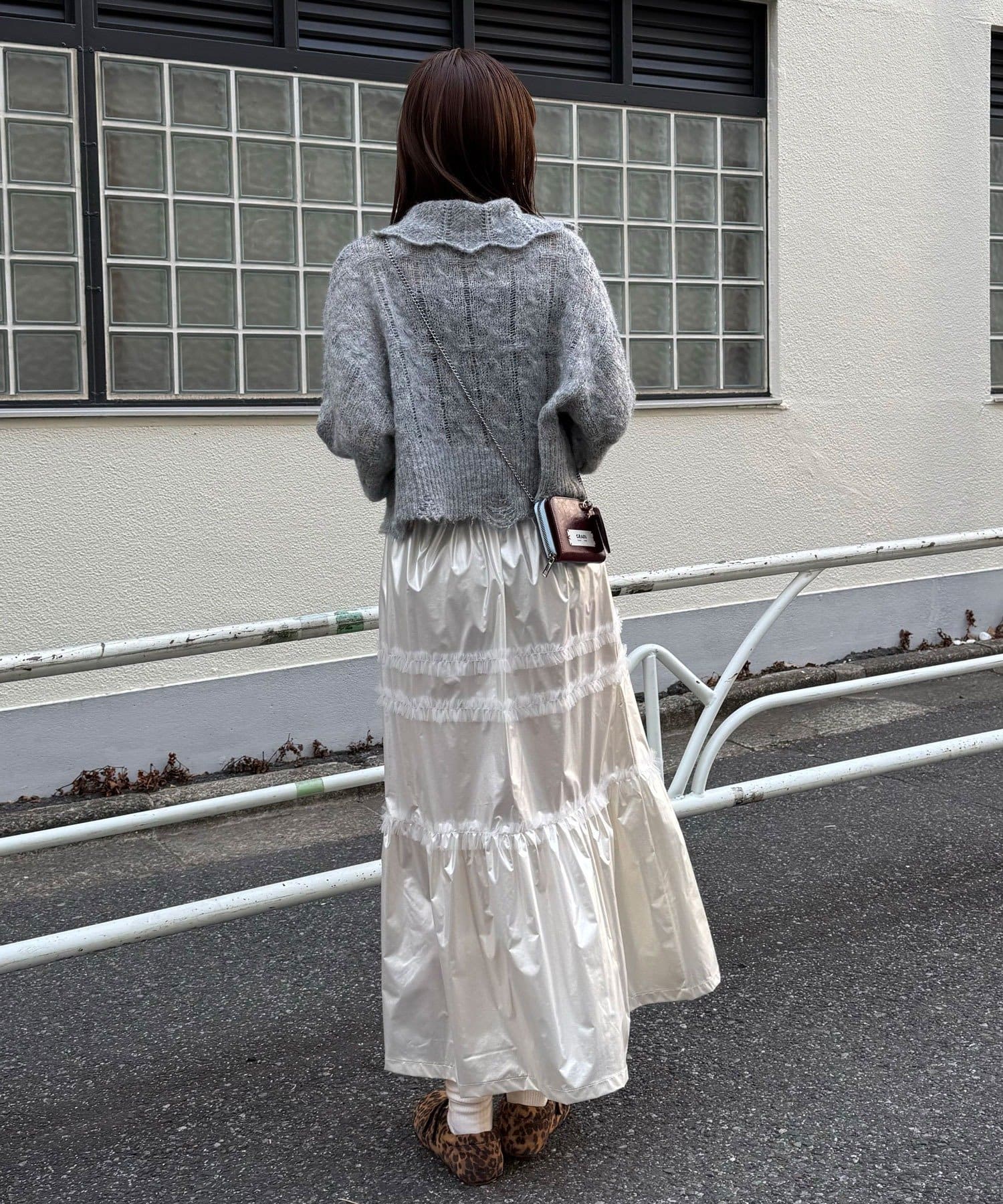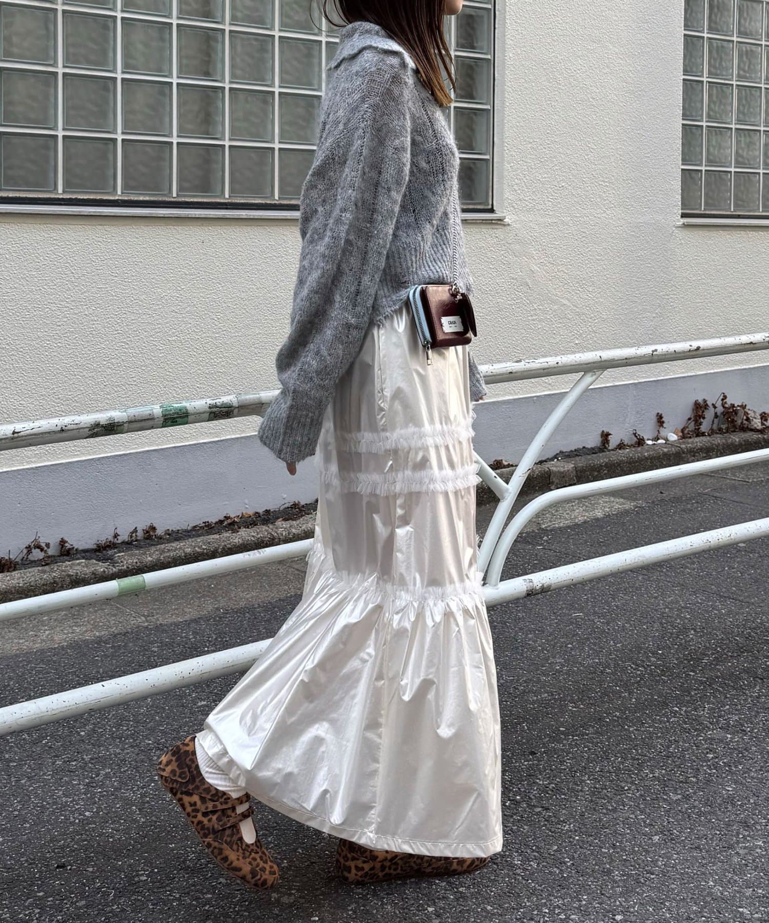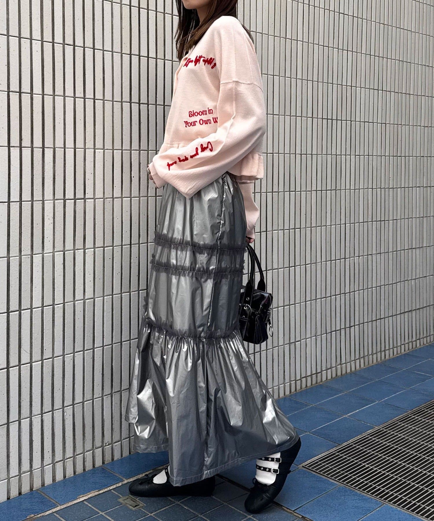 シャイニーな質感が目を引く、ティアードデザインのチュールフリルスカート。