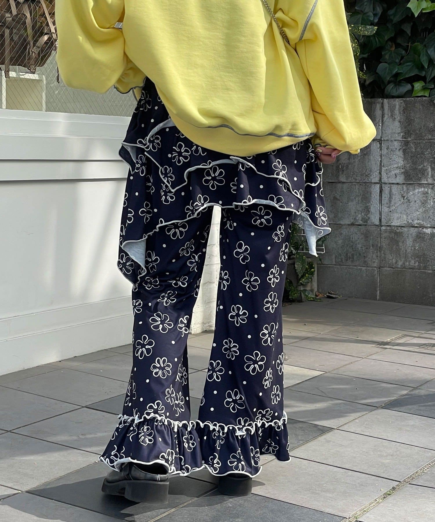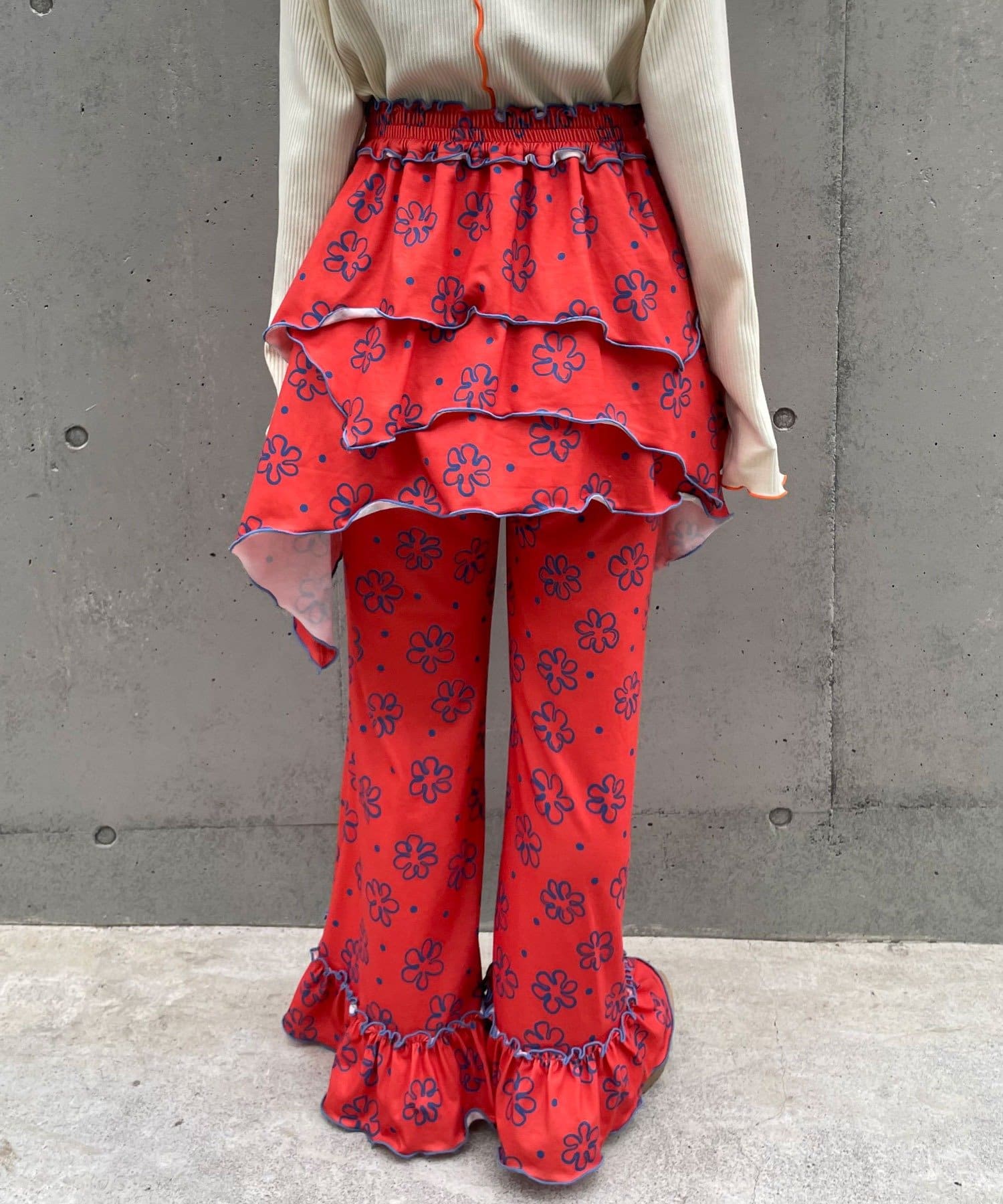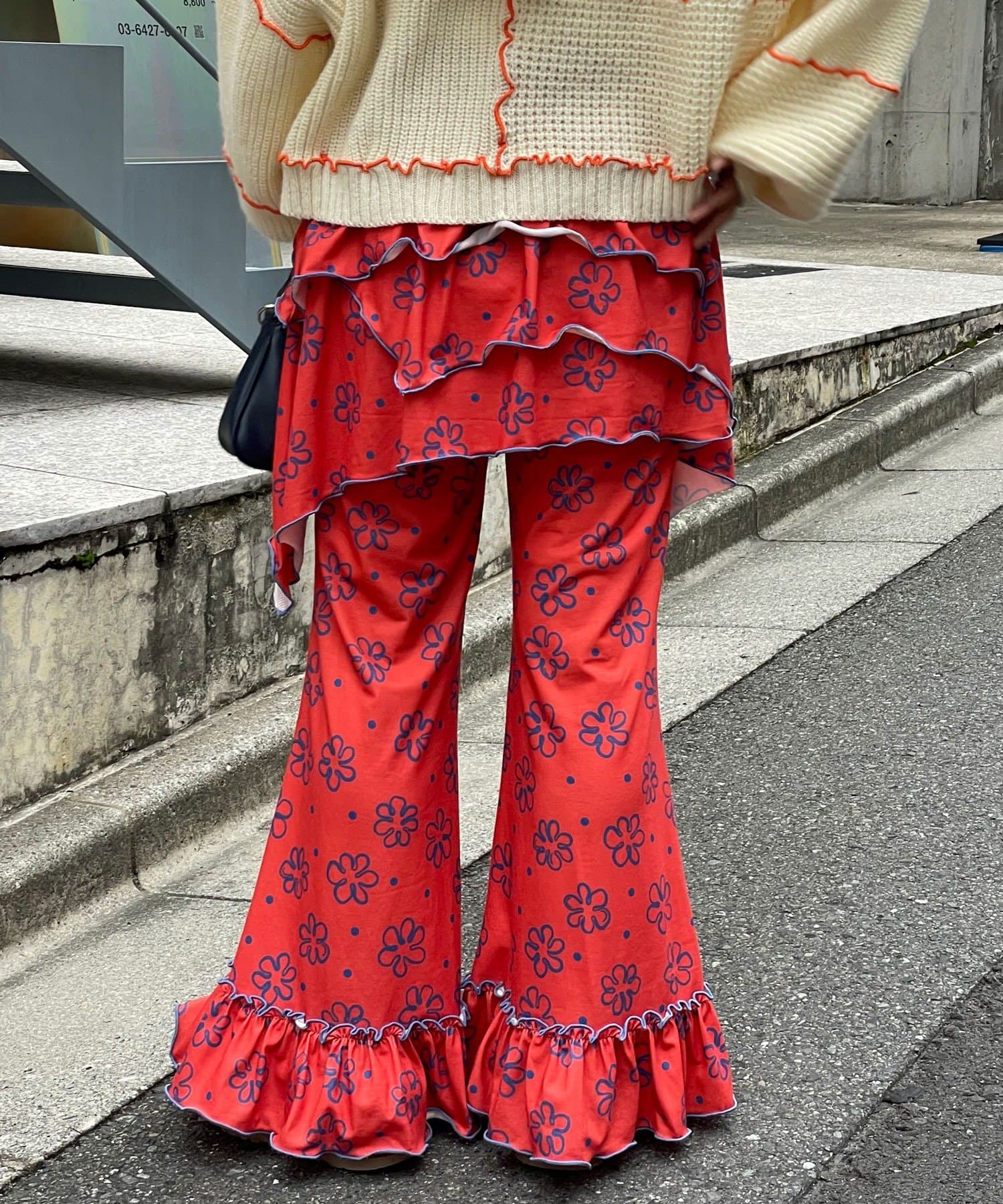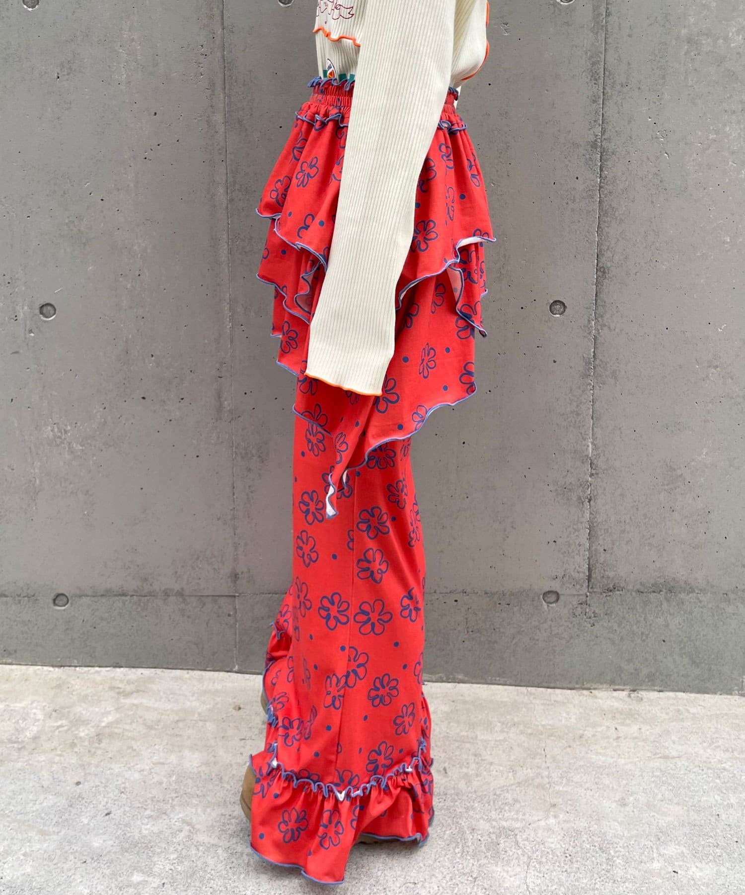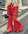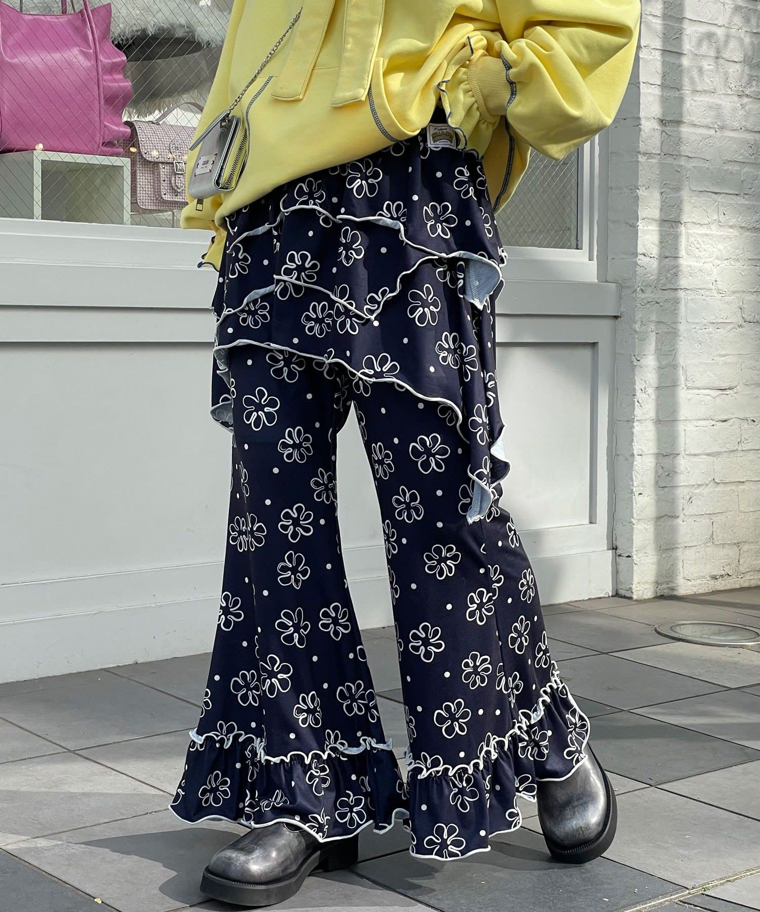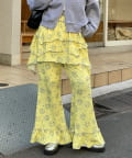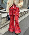 イレヘムのランダムティアードがかわいいミニスカートと、裾のフリルがポイントになったフレアパンツのセットです。
