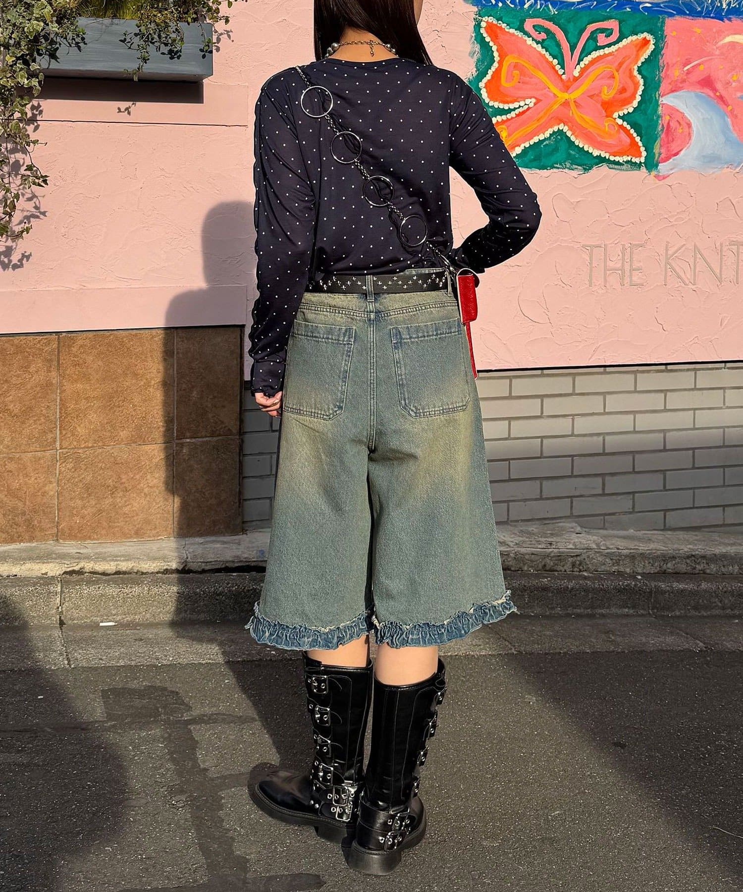 裾にあしらったフリルがさりげなく甘さを添える、デニム素材のハーフパンツ。