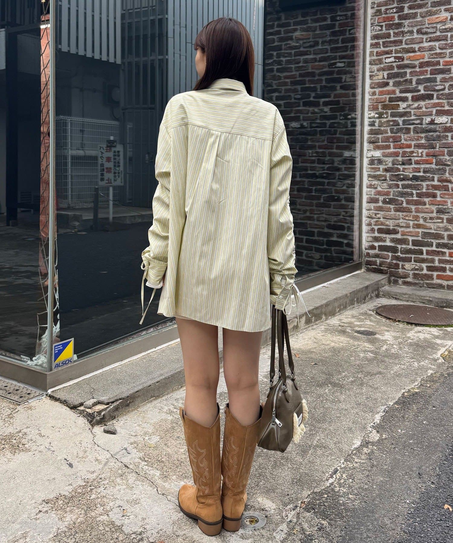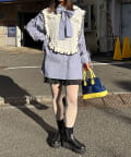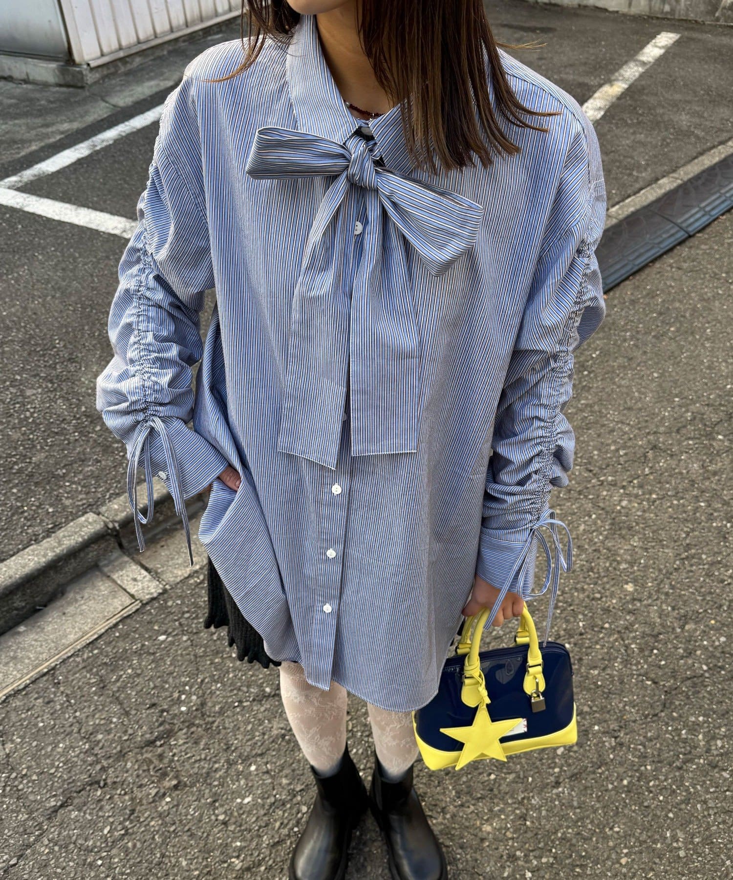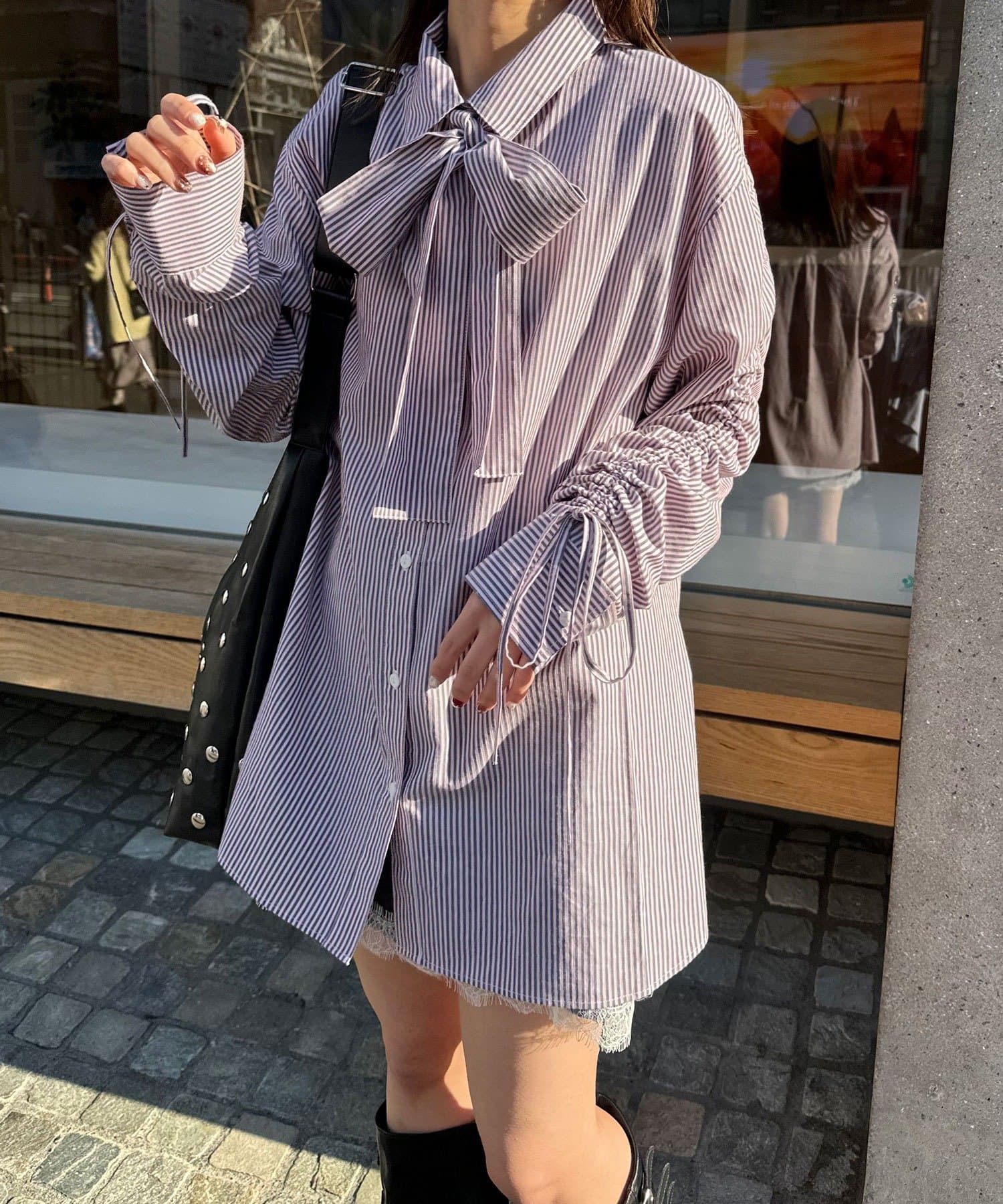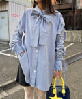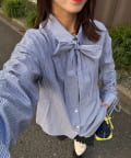 袖シャーリングとボウタイデザインがポイントのストライプシャツ。