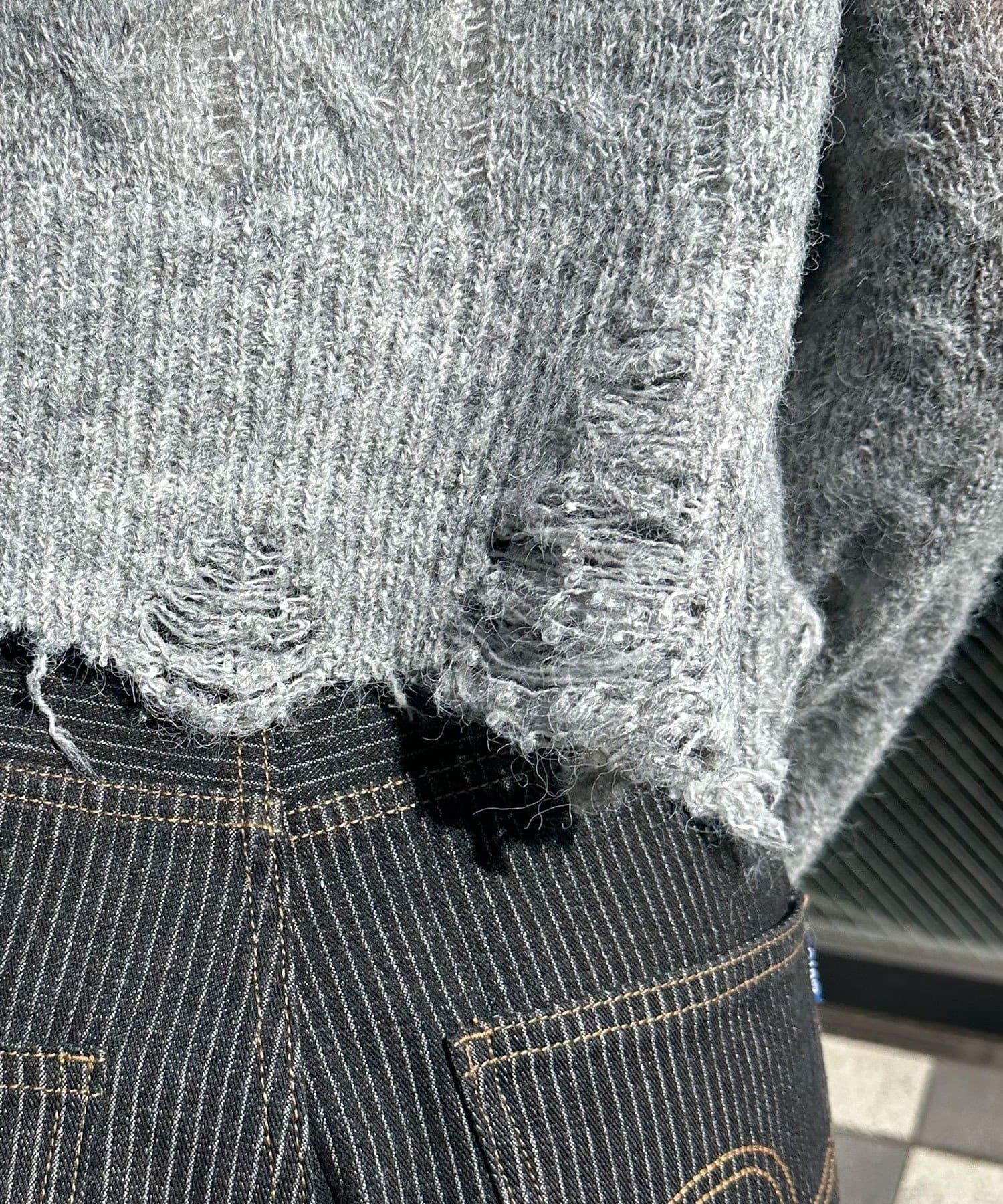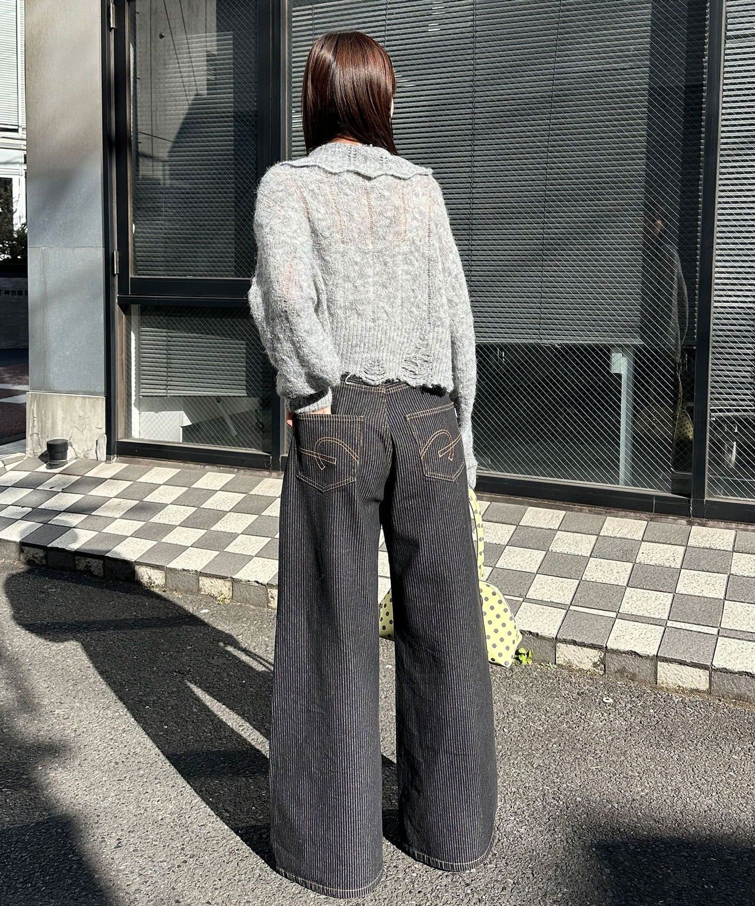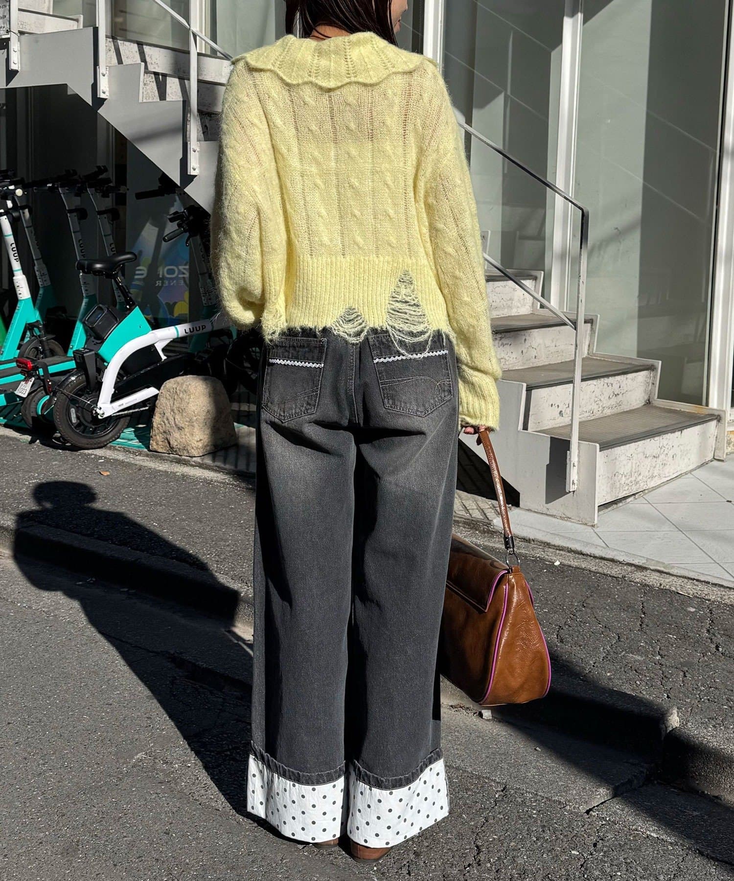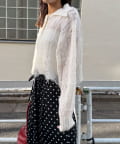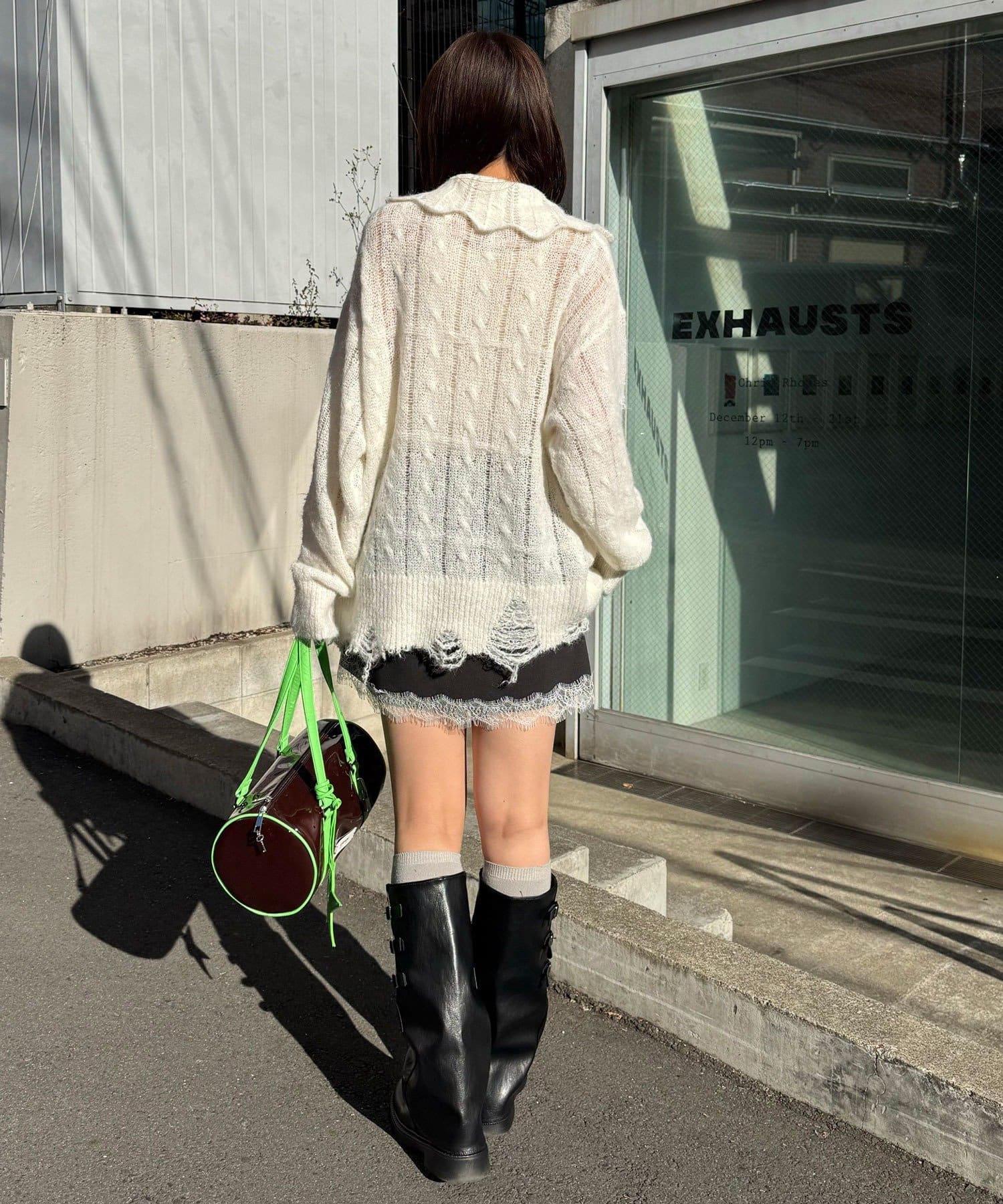 裾やバックに施したダメージ加工が、フェミニンすぎない抜け感をプラス。