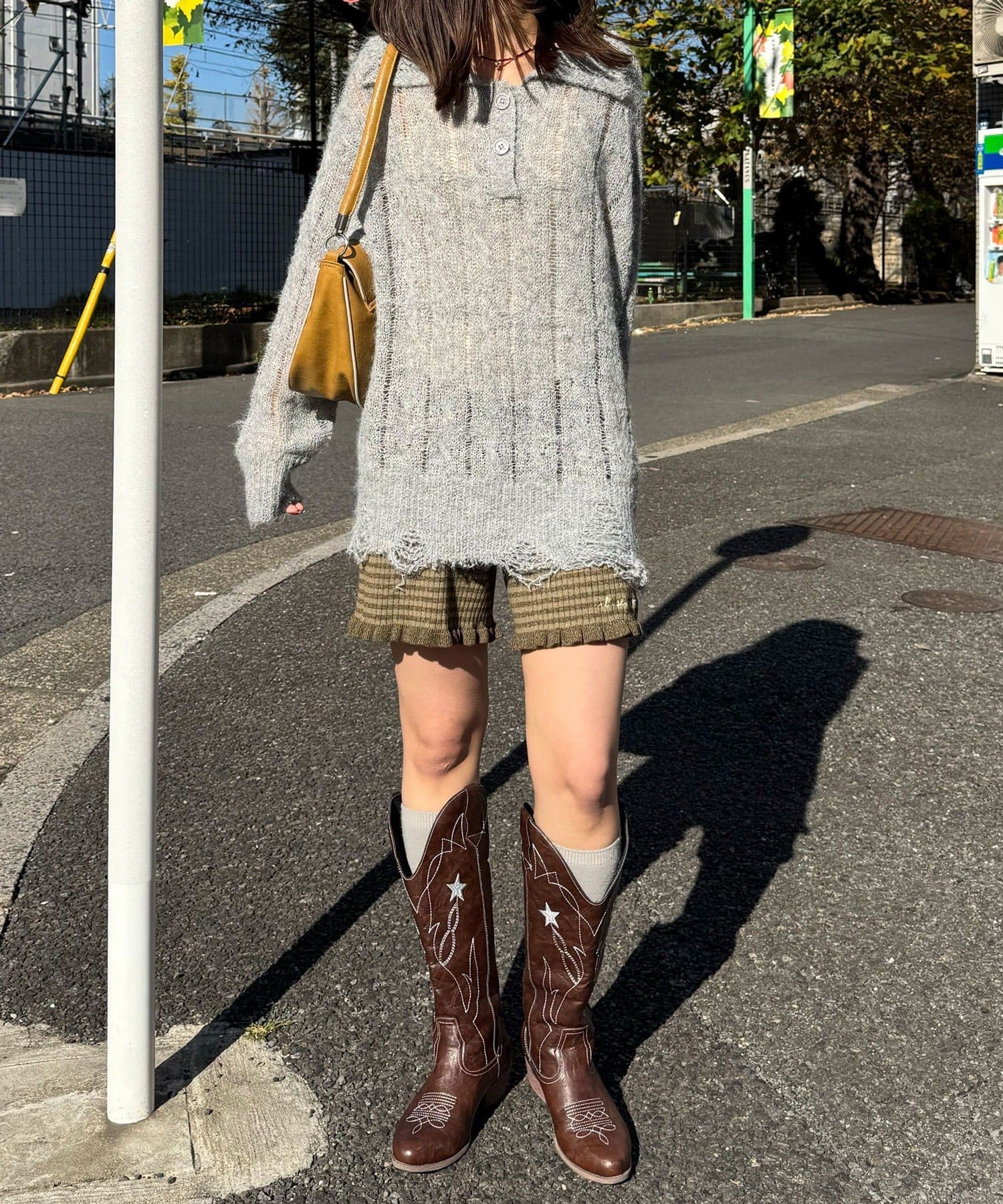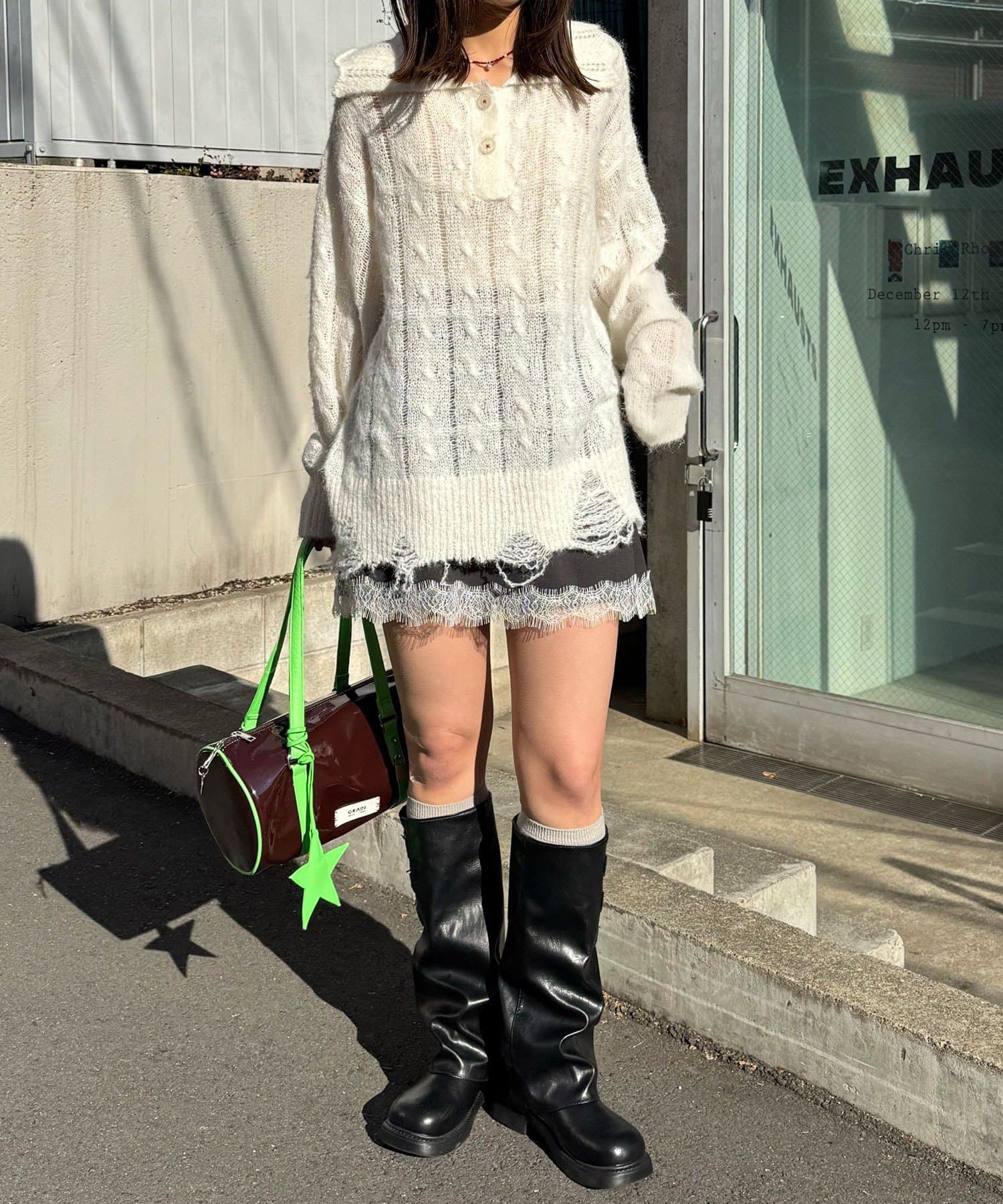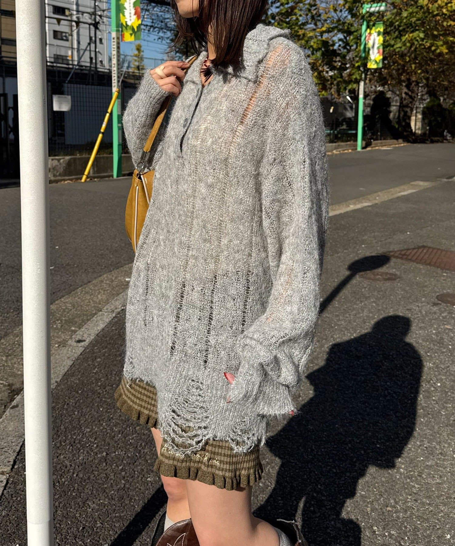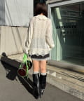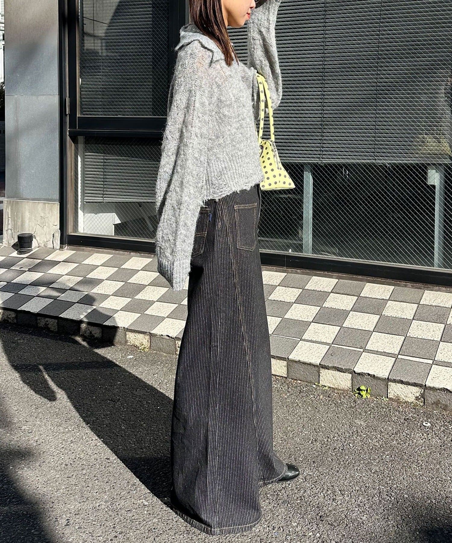 ミニボトムと合わせて、ニットの透け感と丈バランスを楽しむスタイリングがおすすめです。