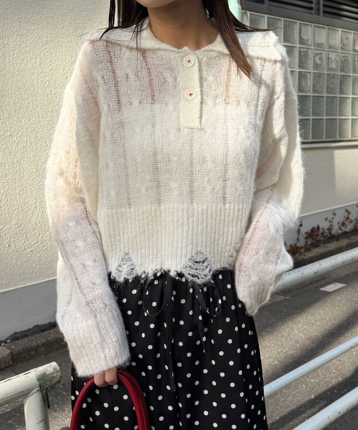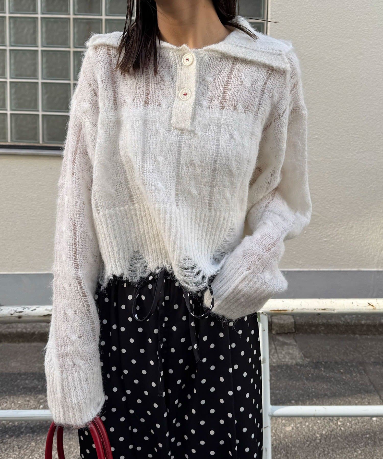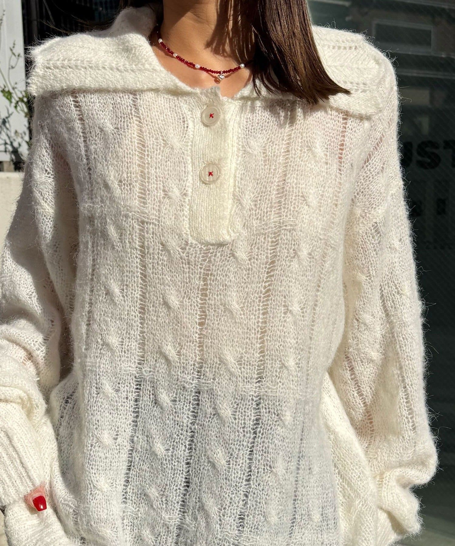 甘く編み立てたシアーニット素材を使用した、軽やかなポロデザインニット。