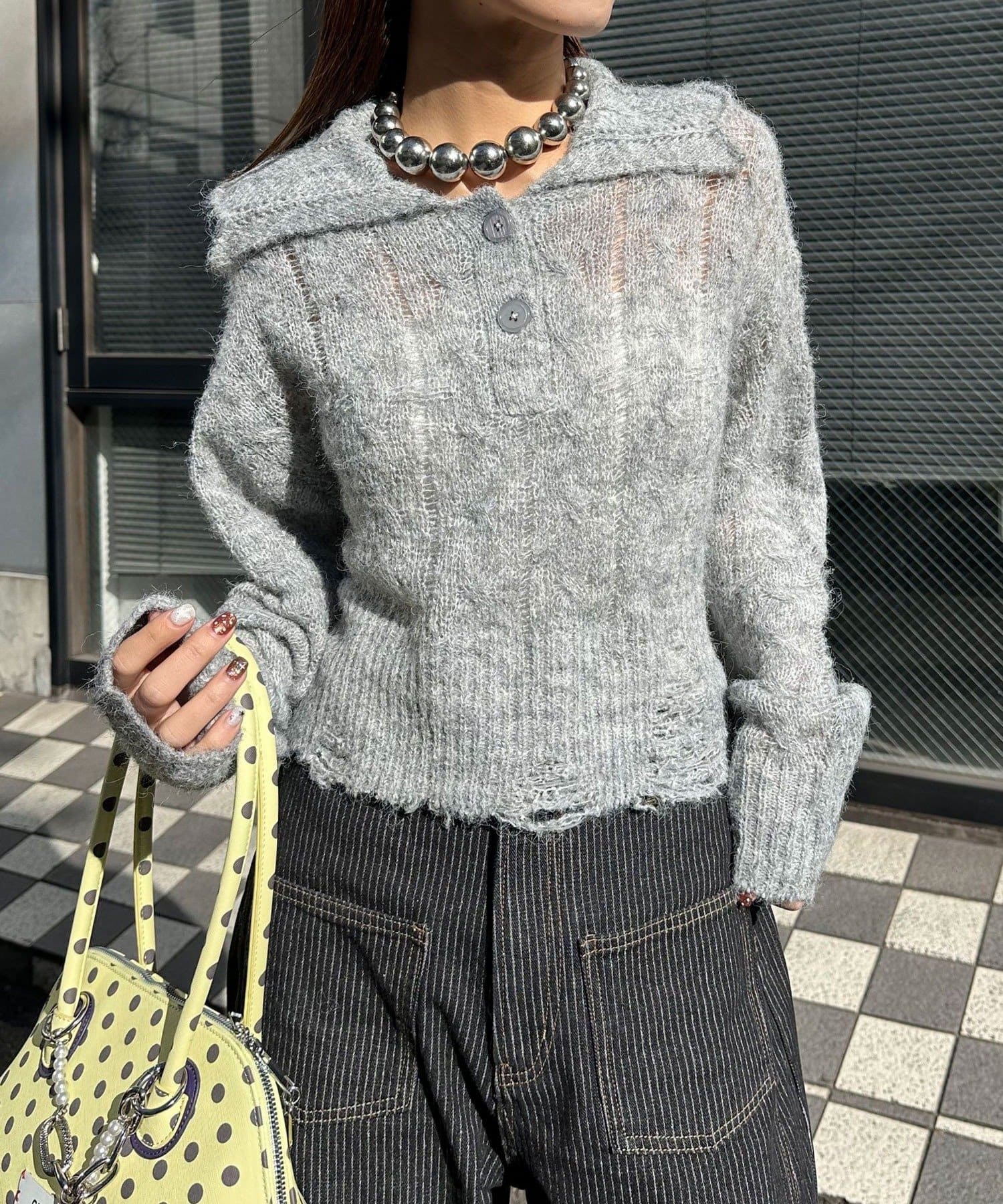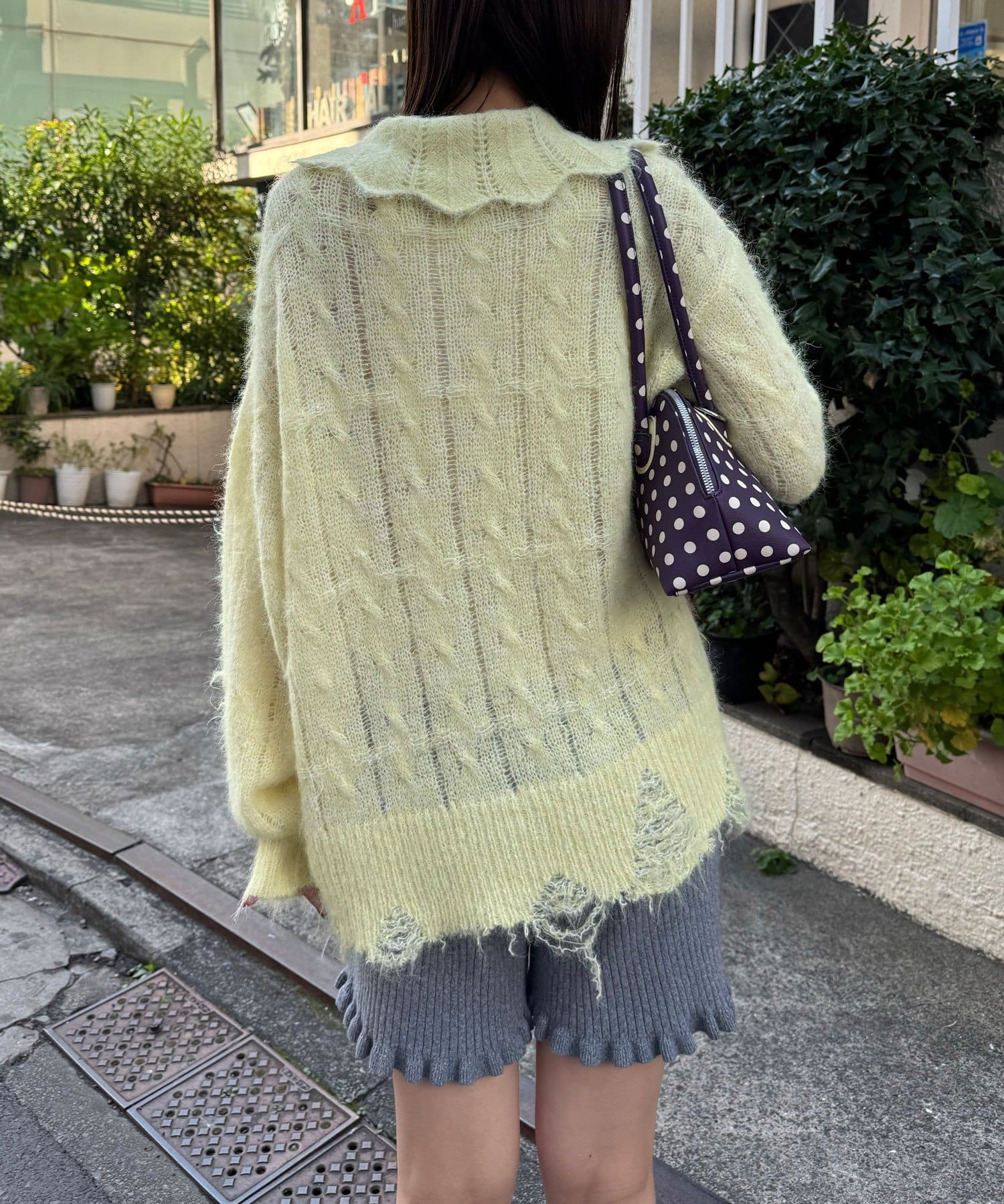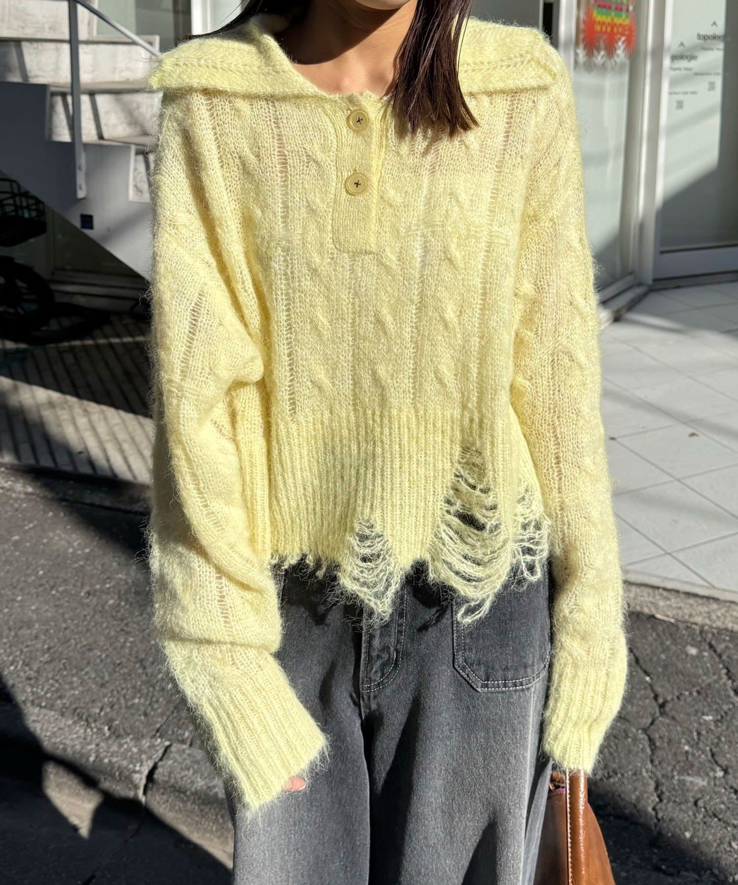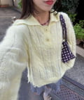 甘く編み立てたシアーニット素材を使用した、軽やかなポロデザインニット。