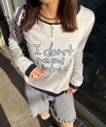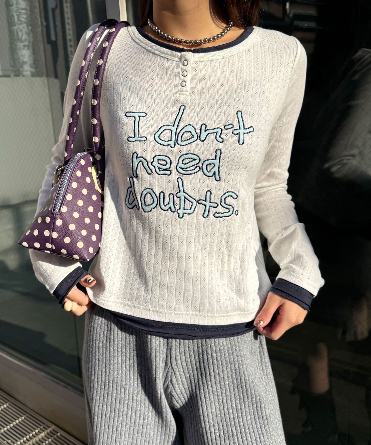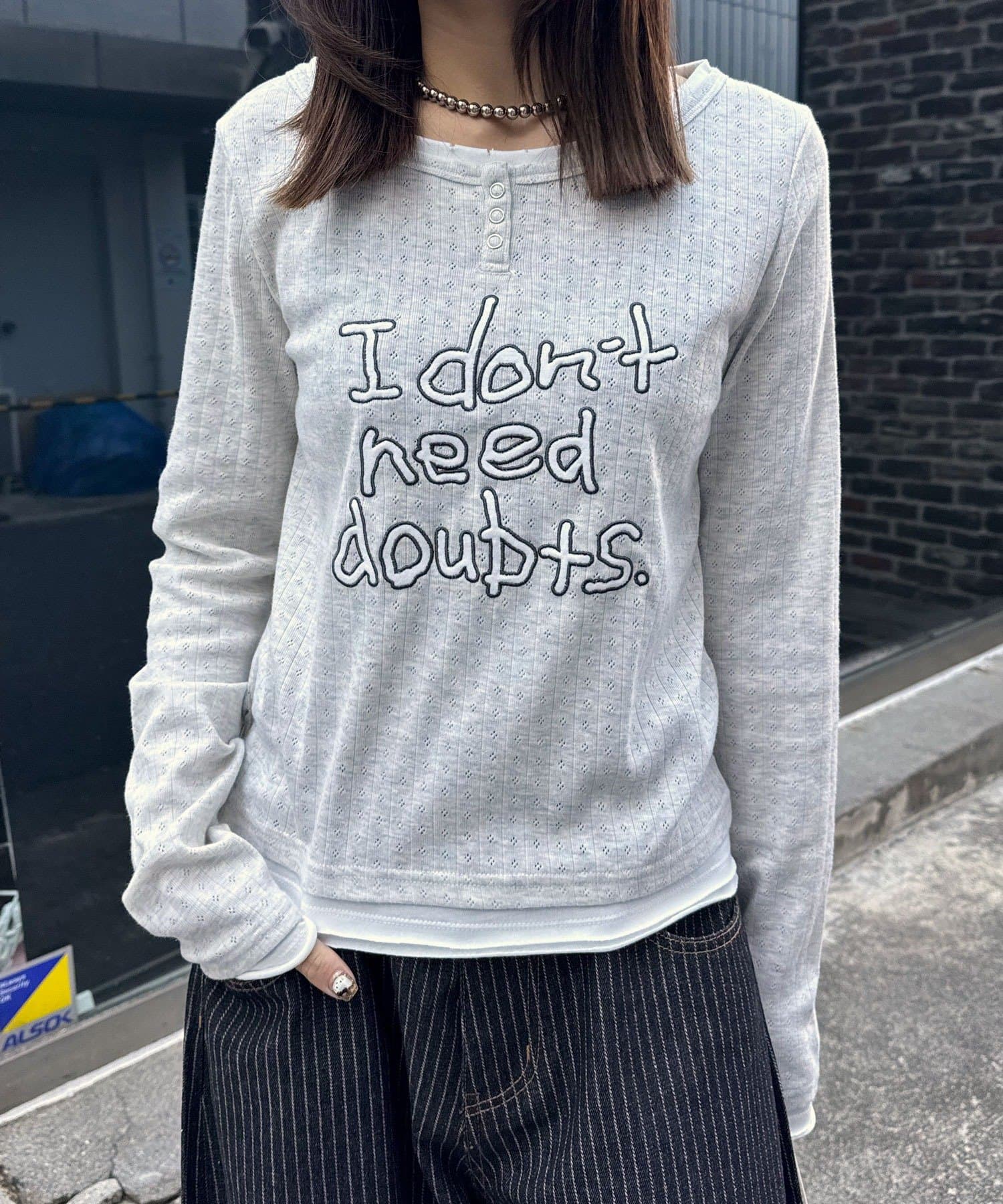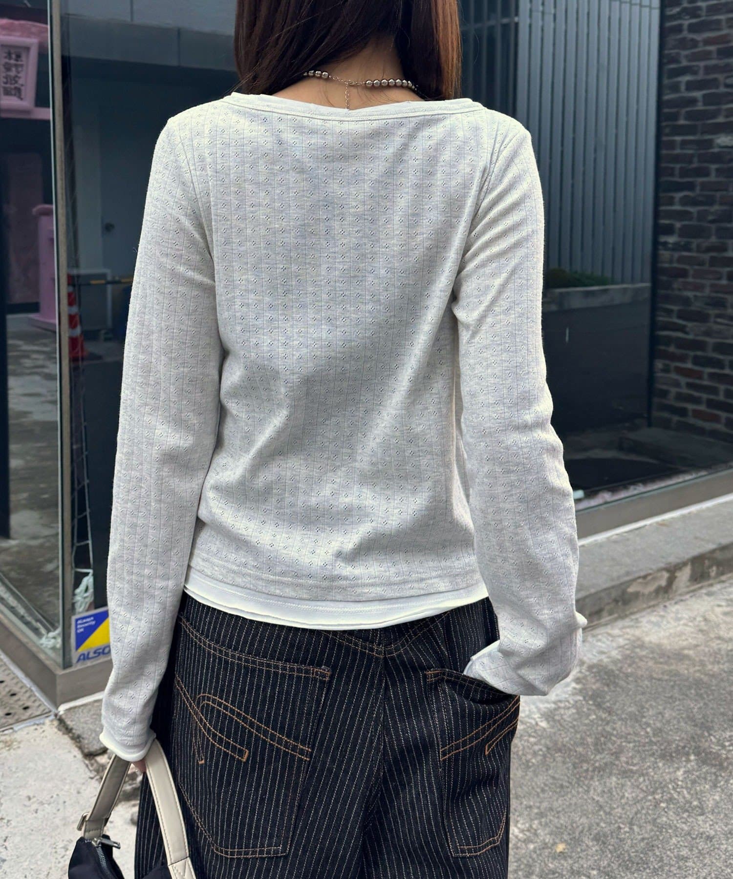 手書き風のロゴ刺繍が目を引く、アイレット生地のヘンリーネックトップス。