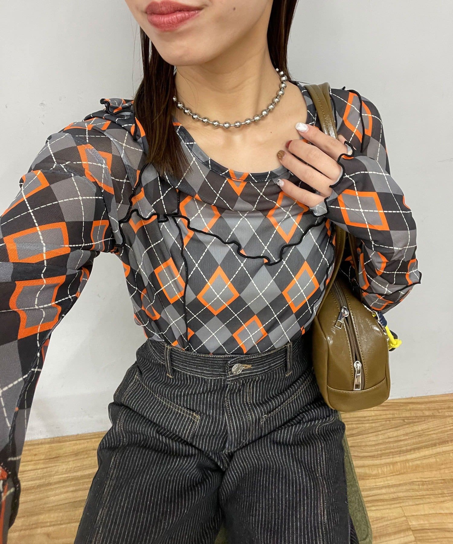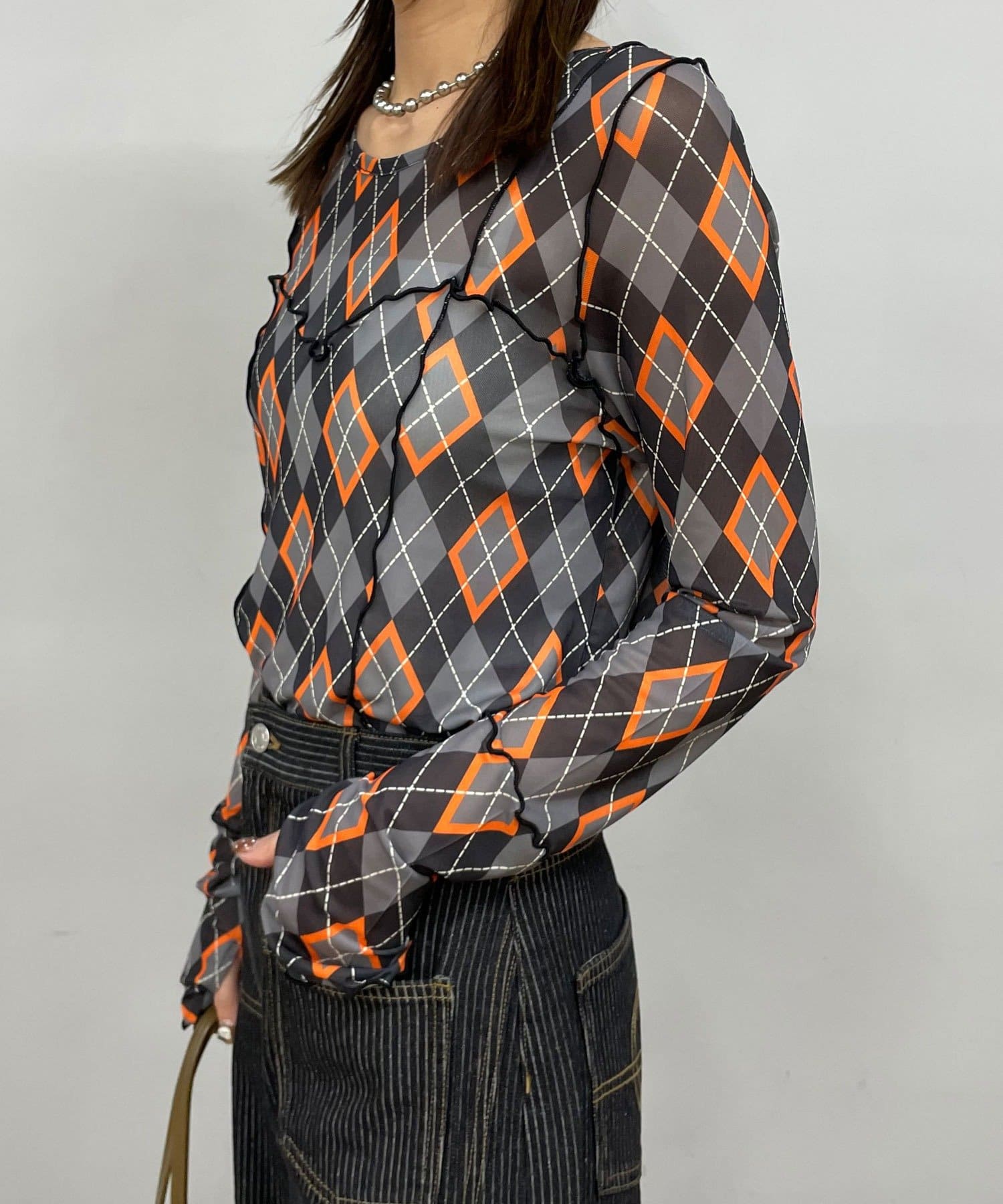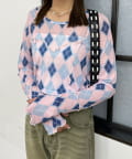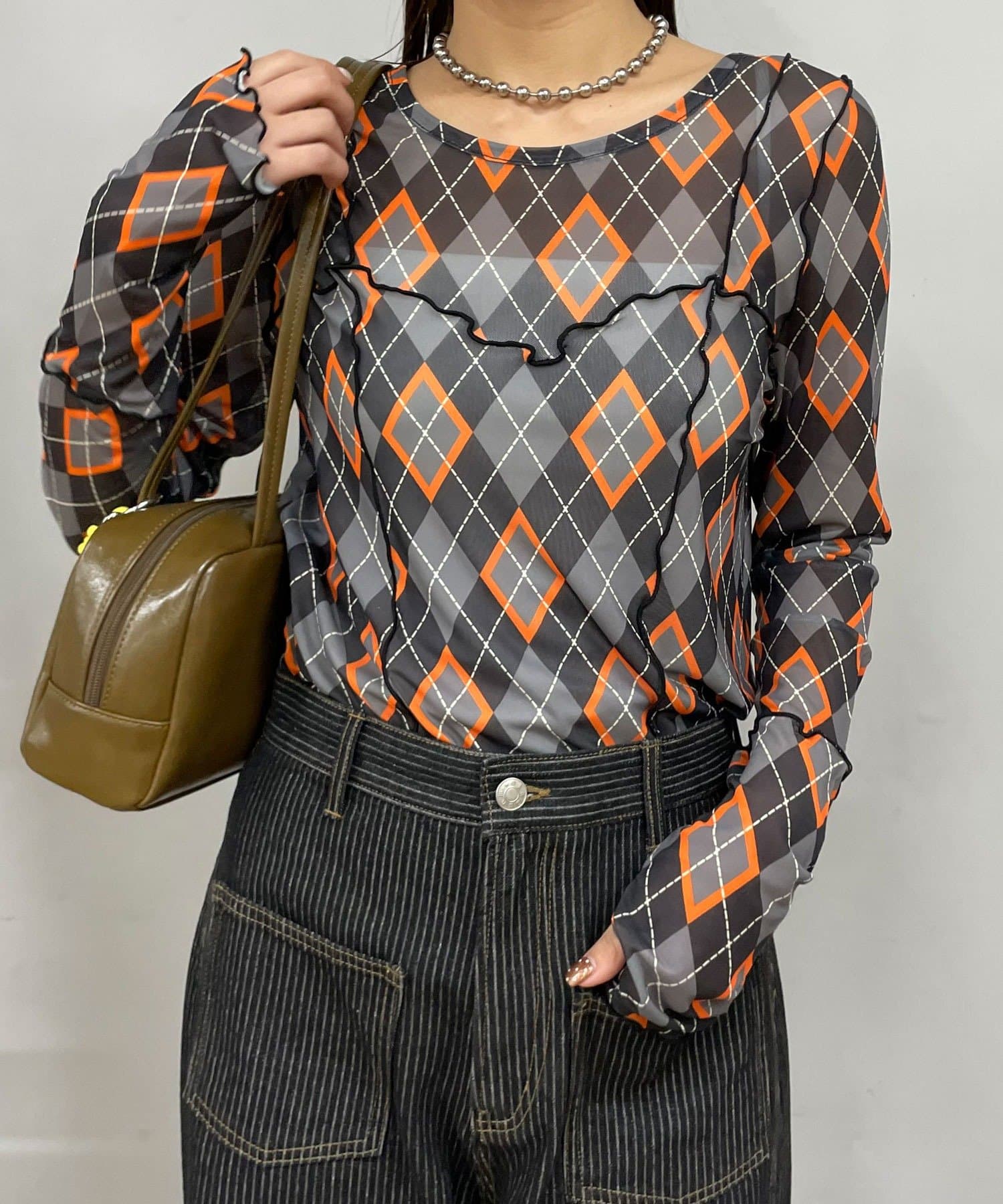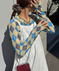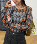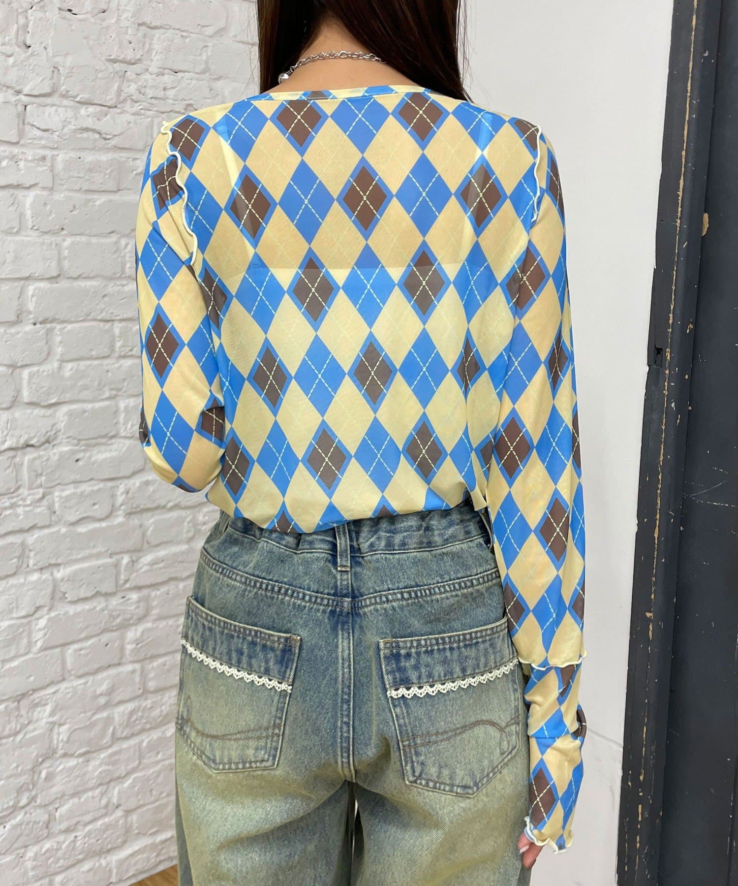 配色が目を引くアーガイル柄を、透け感のある素材で今っぽくアップデート。