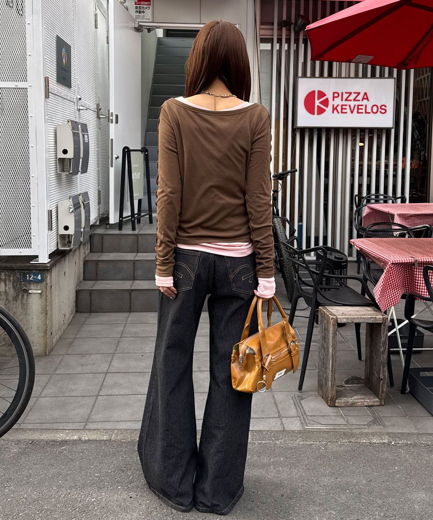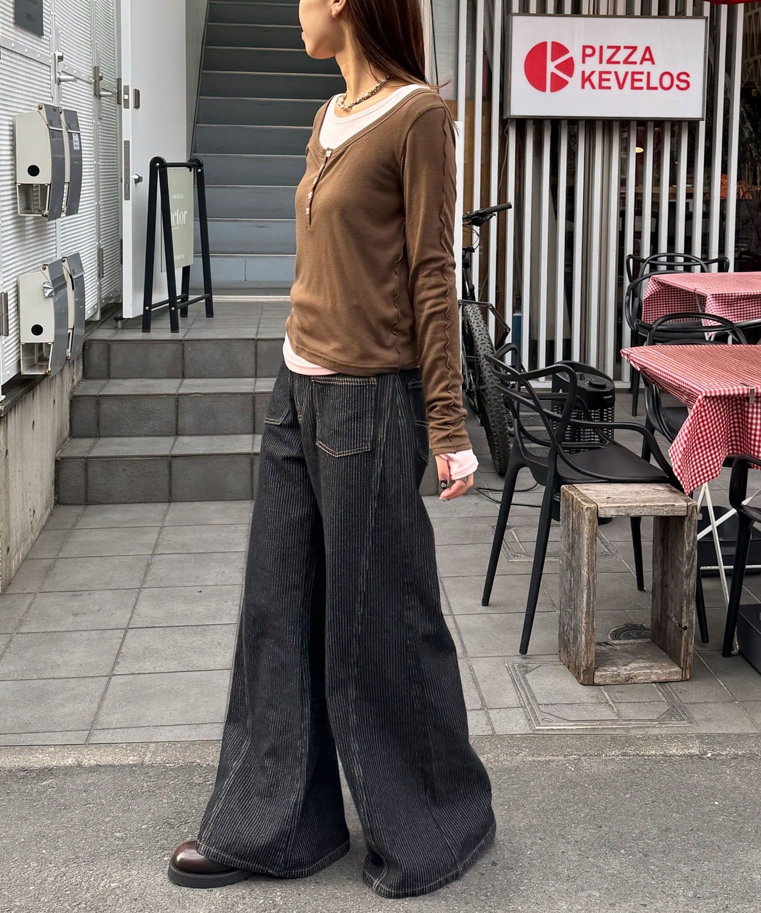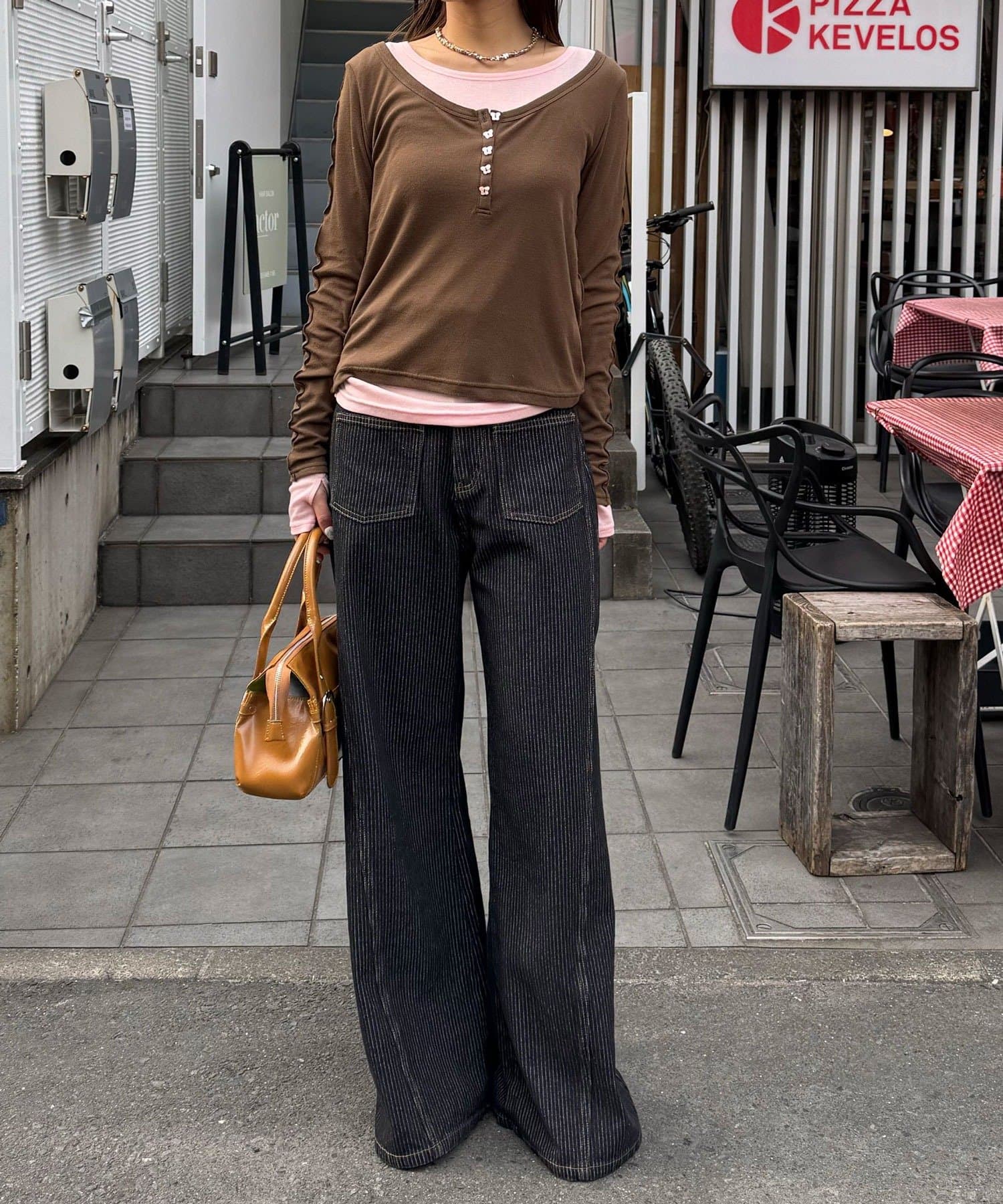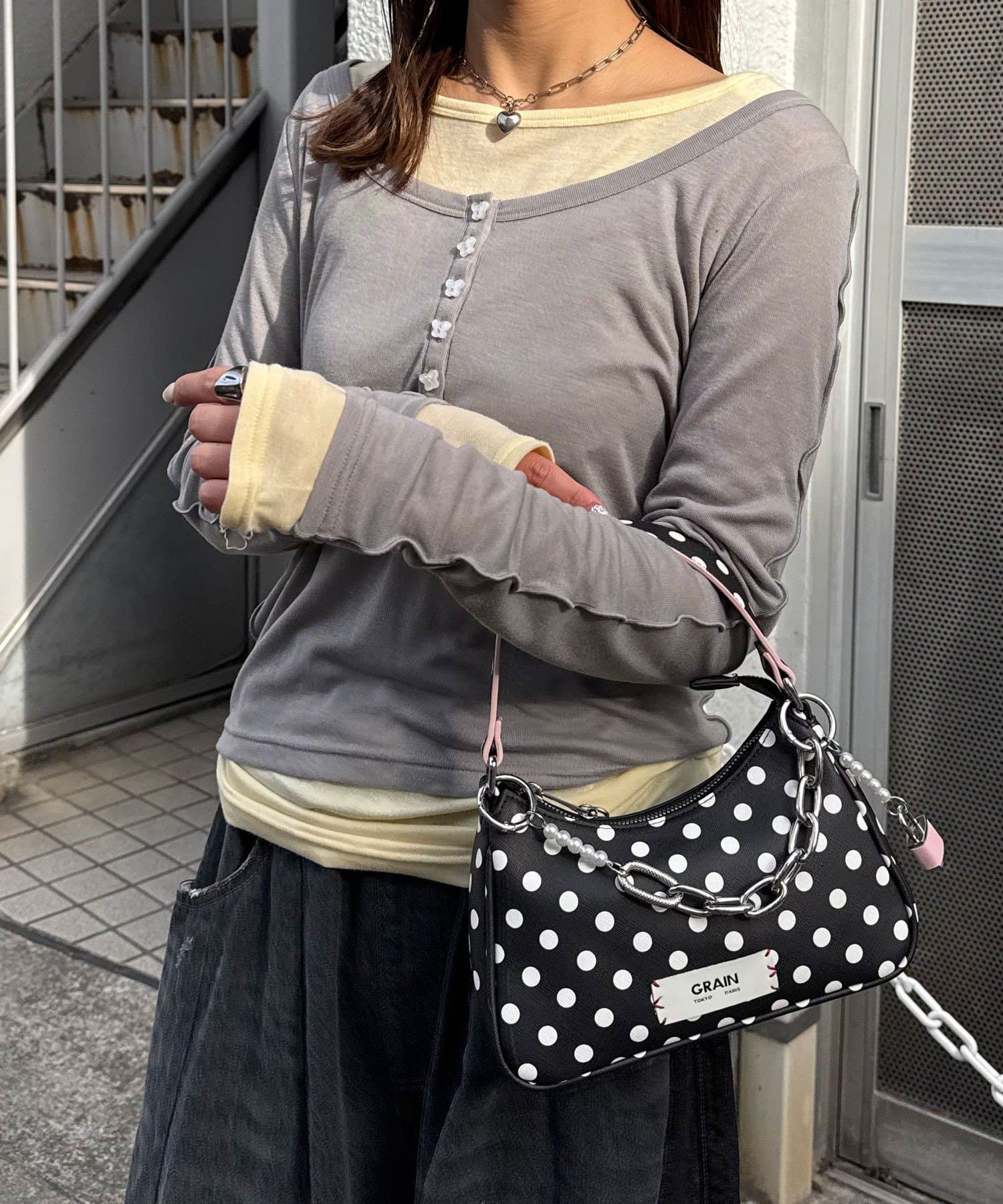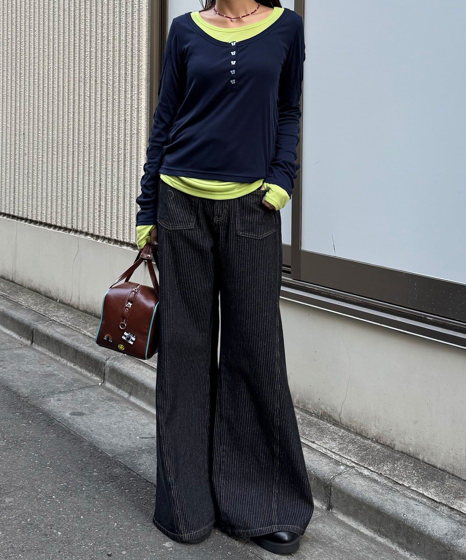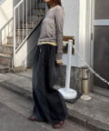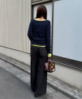 外側のトップスは、蝶々のボタンと配色メローがさりげないアクセントをプラス。