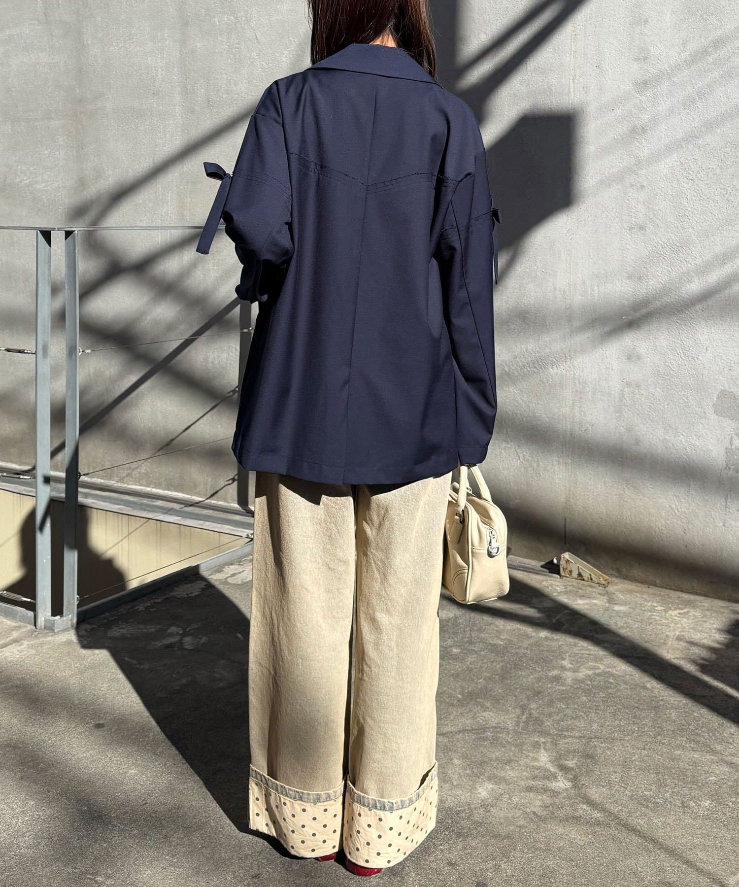 切替デザインに、切りっぱなし仕様を取り入れることで、きちんとしすぎない抜け感を演出しています。
