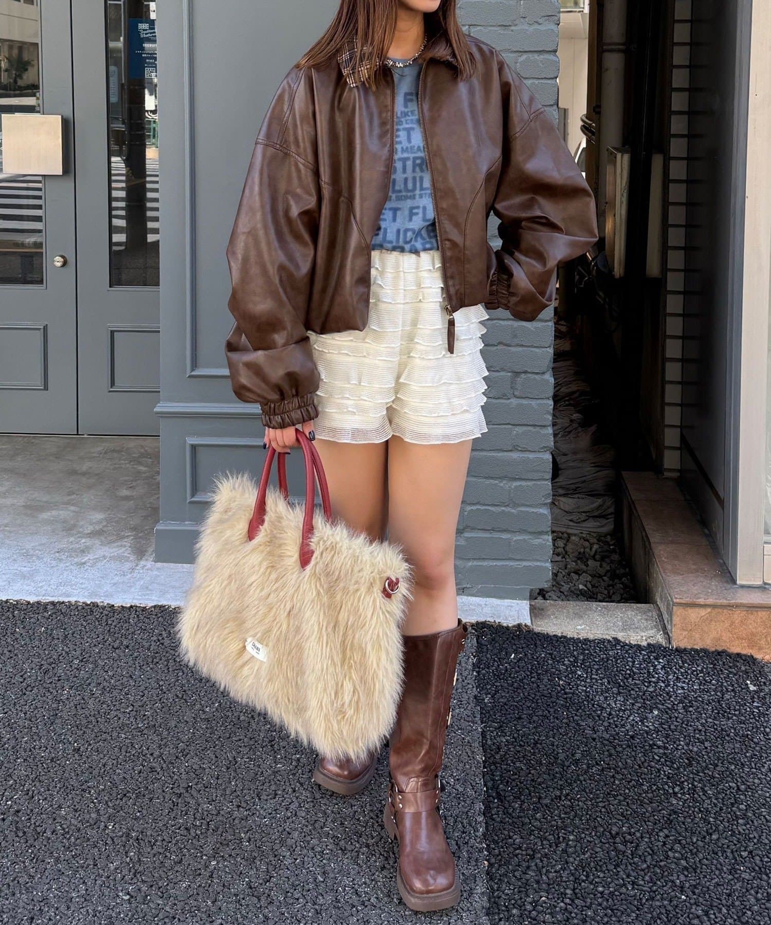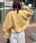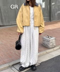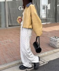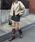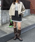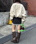 ミニスカートと合わせれば、バルーン裾が可愛く映える甘辛コーデに。