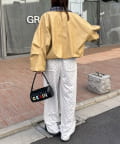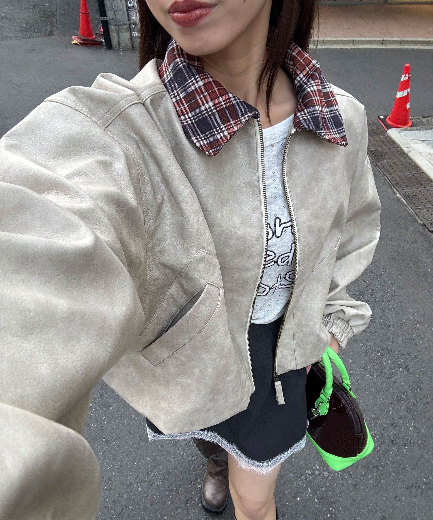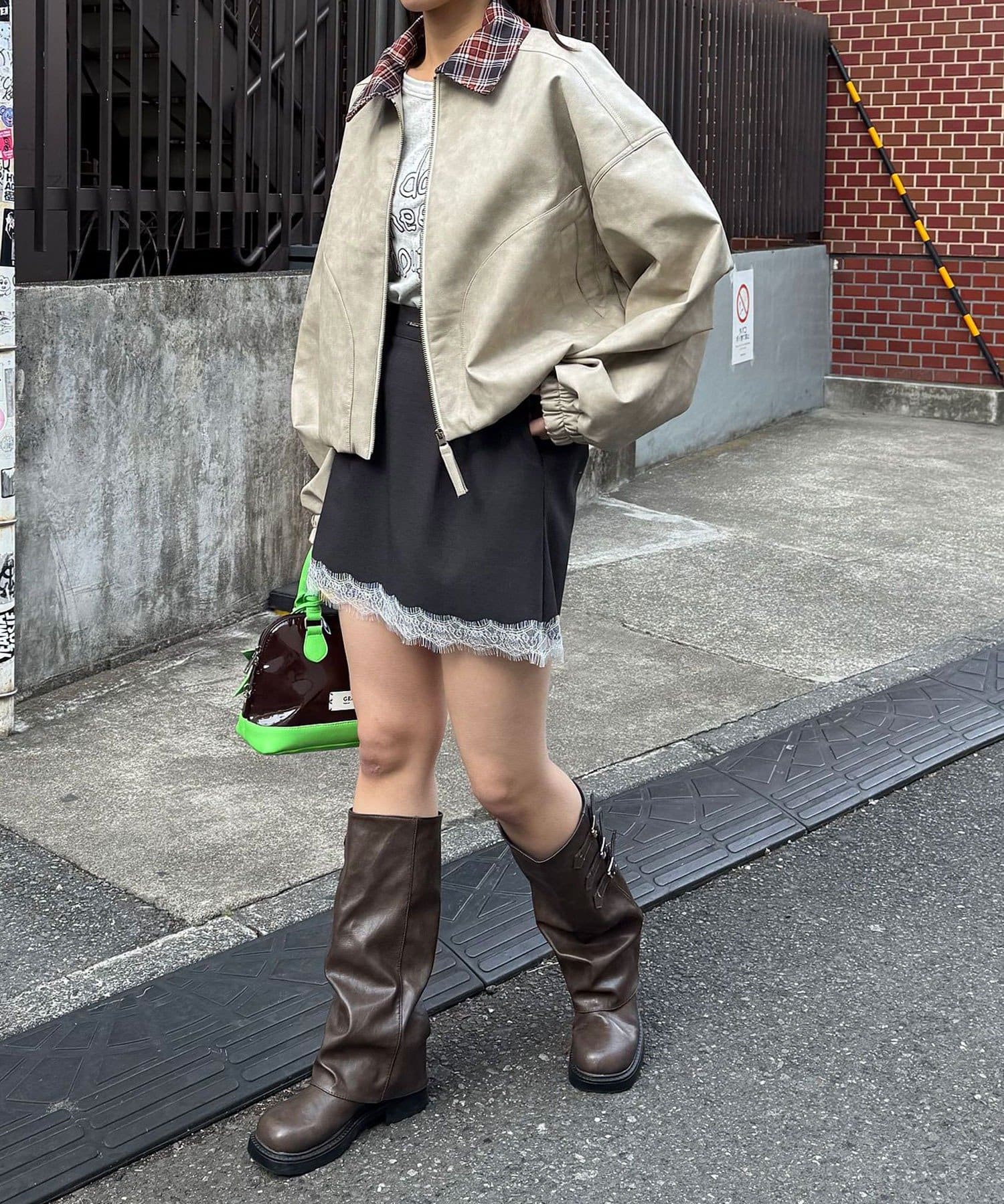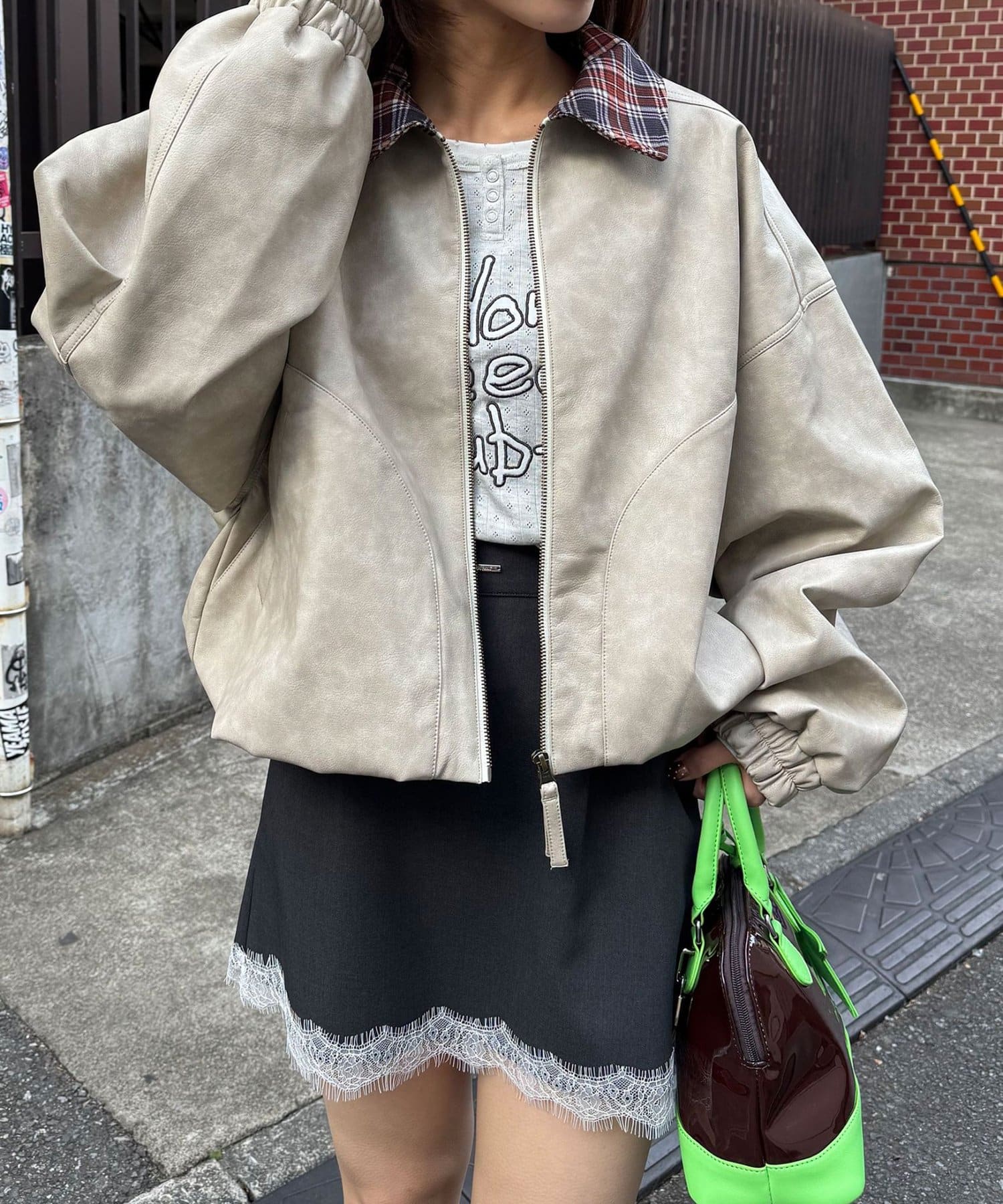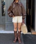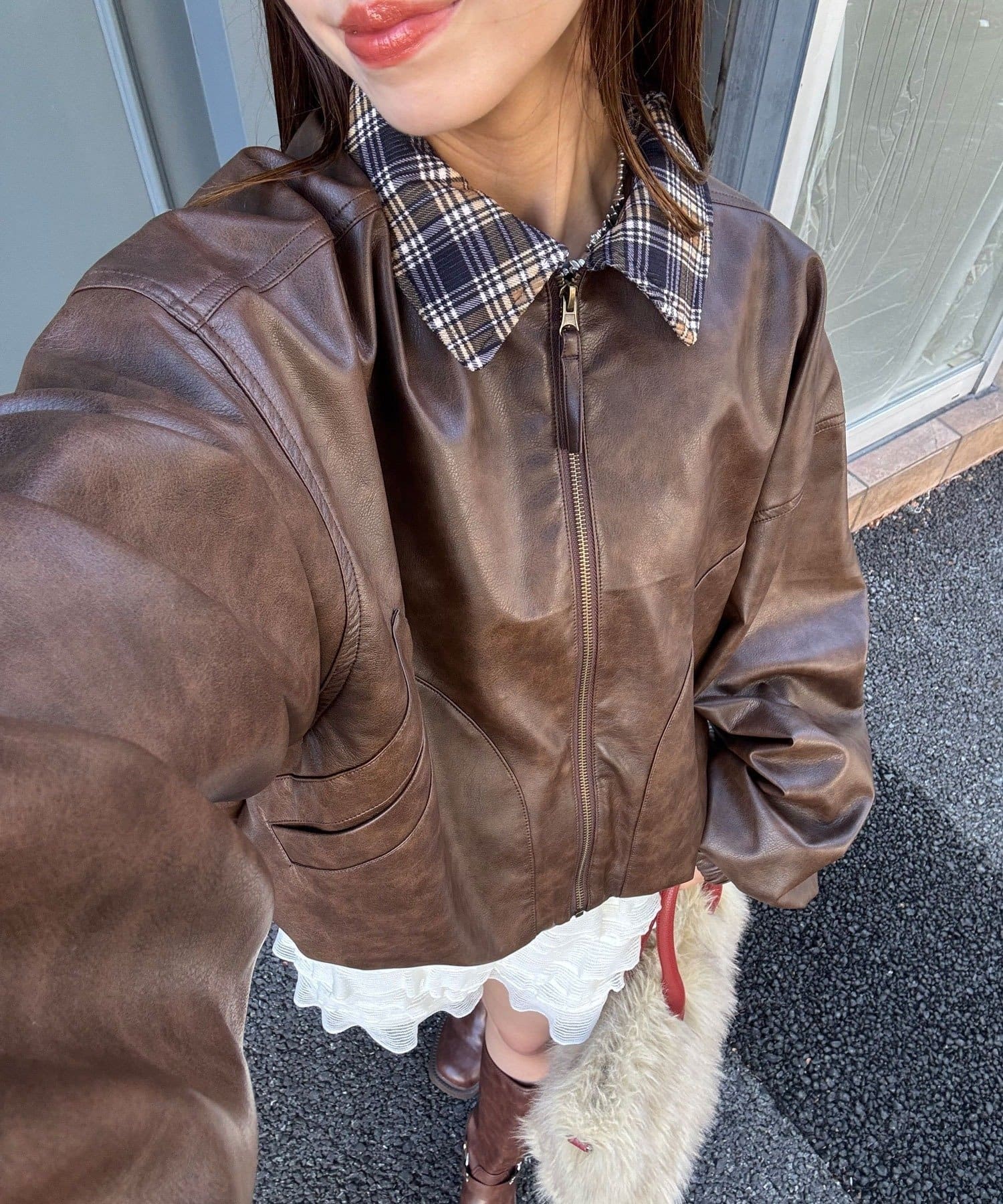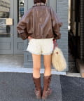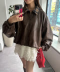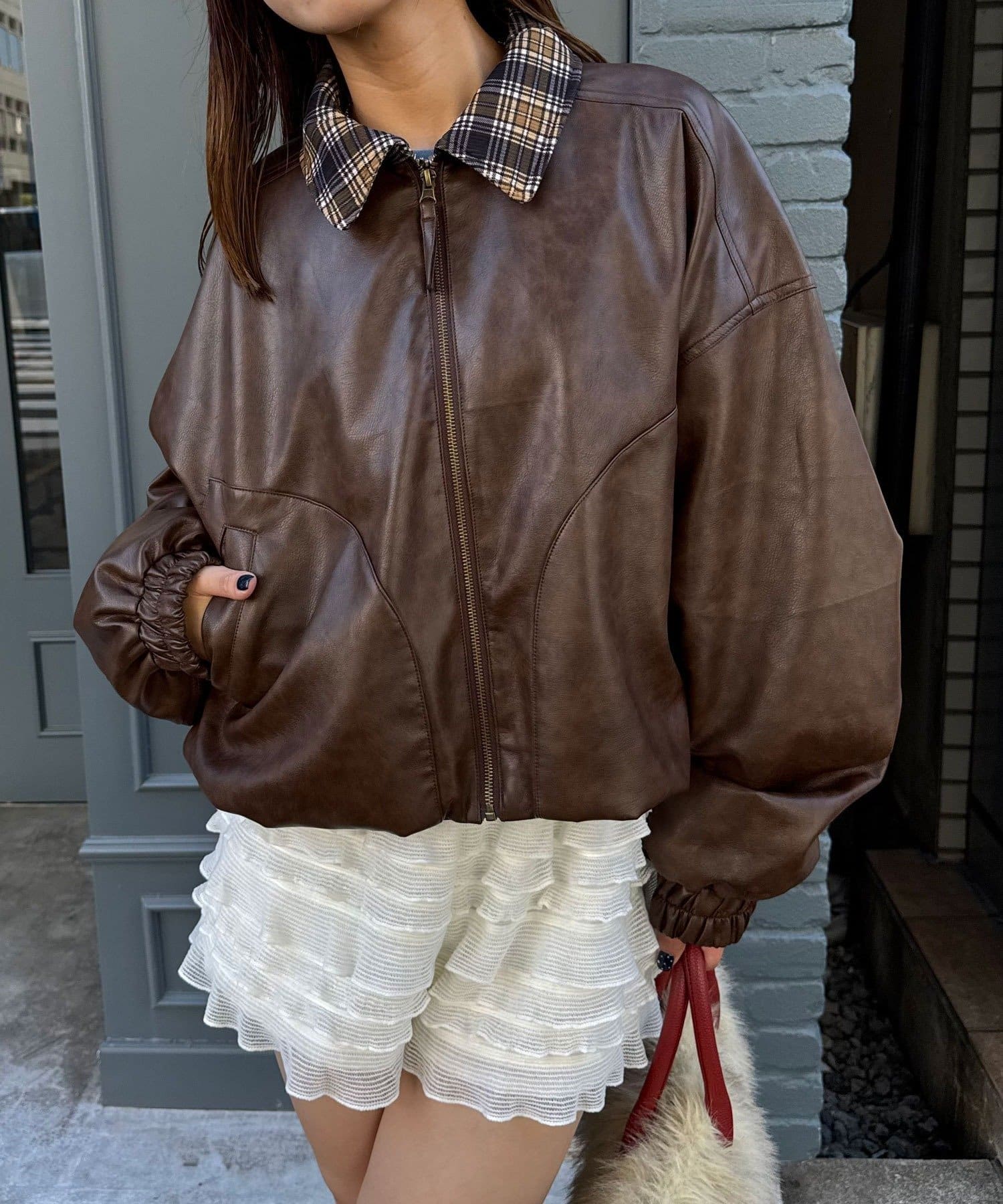 チェック襟フェイクレザーバルーンショートブルゾン