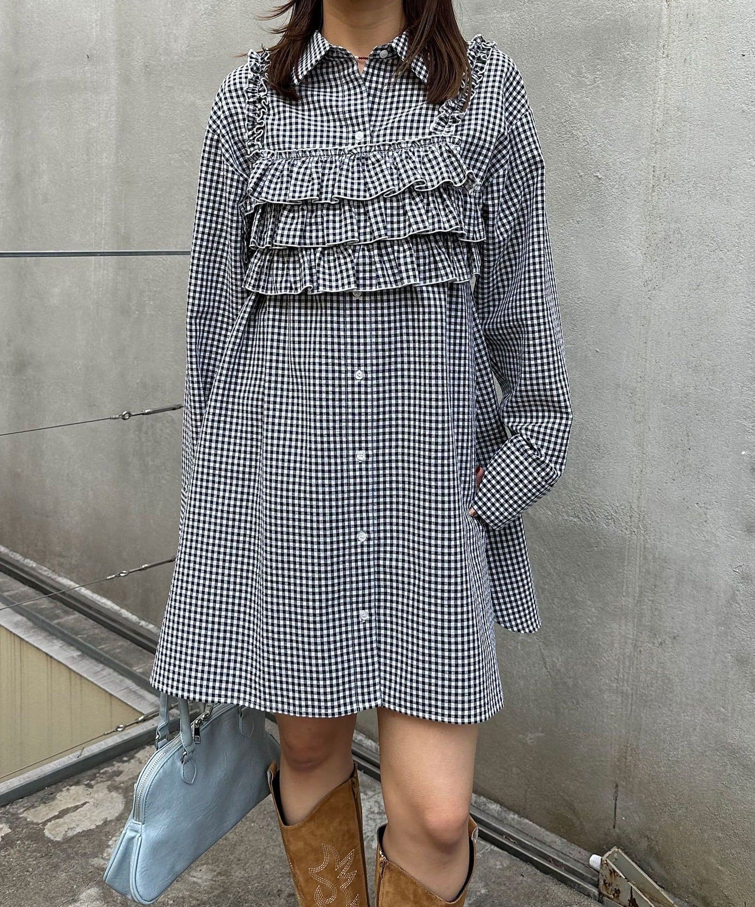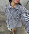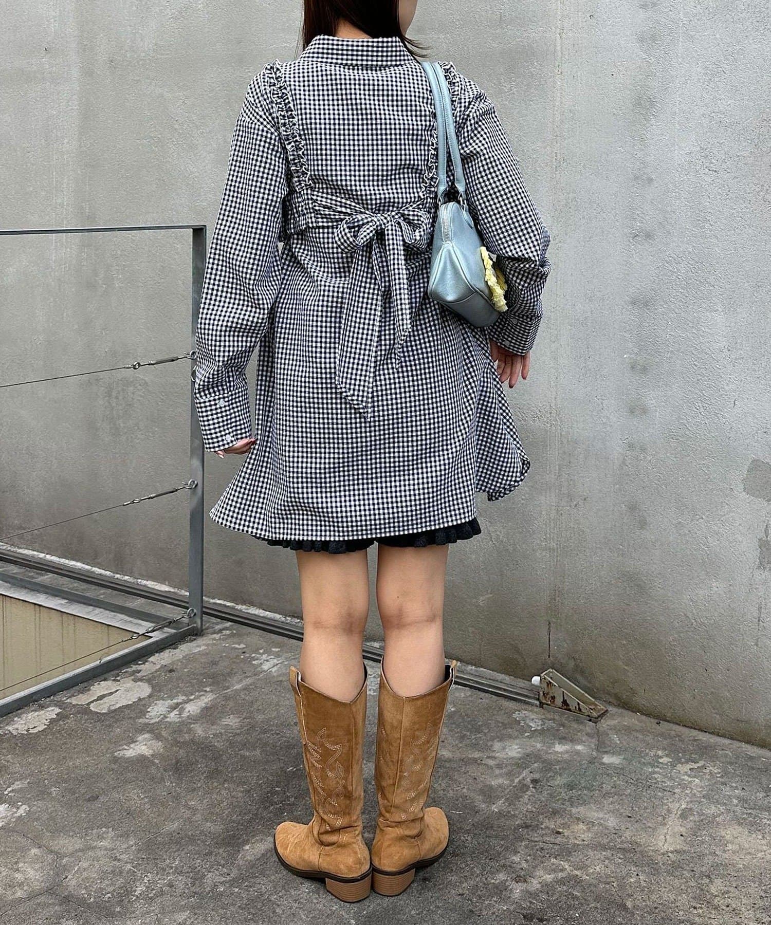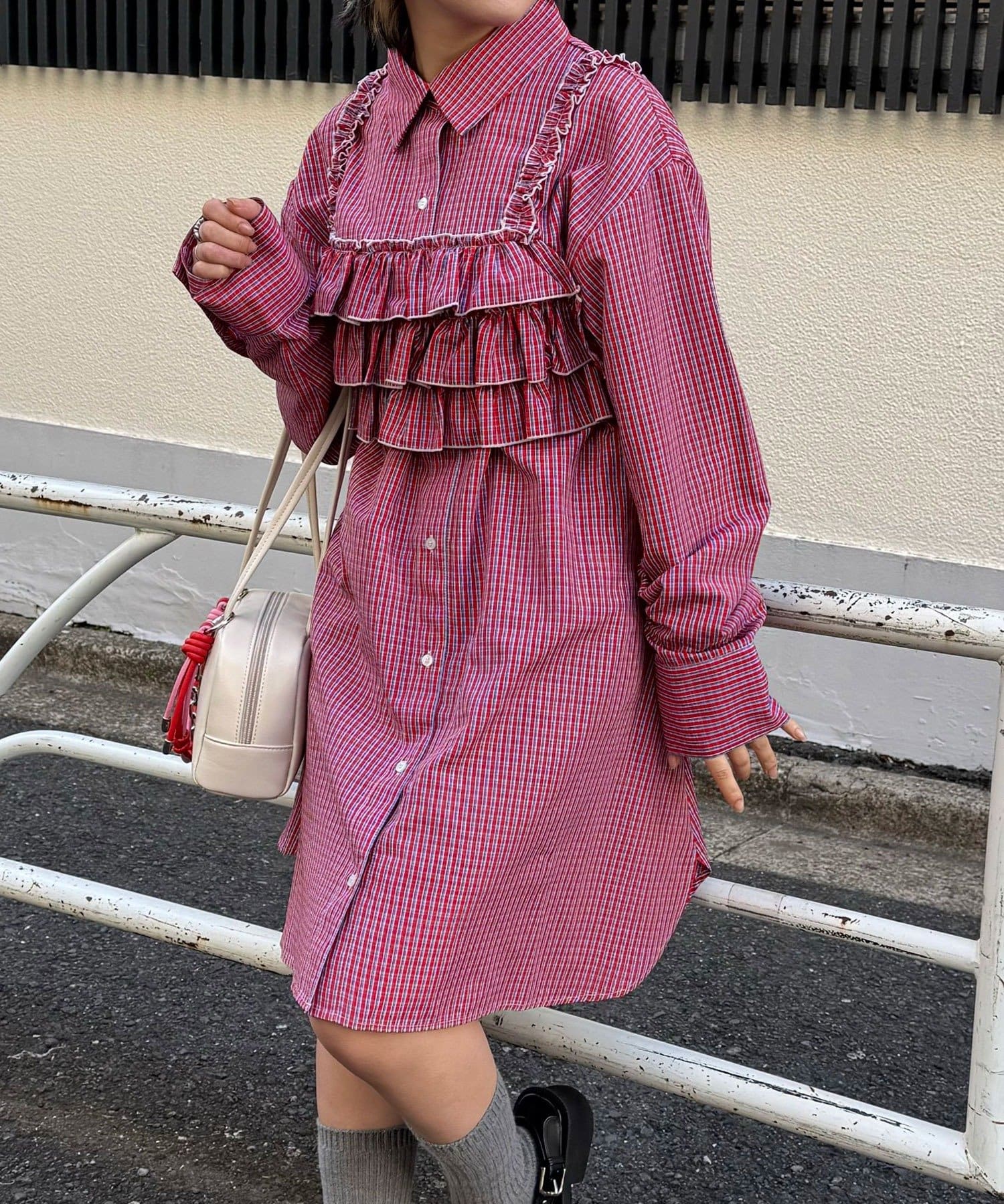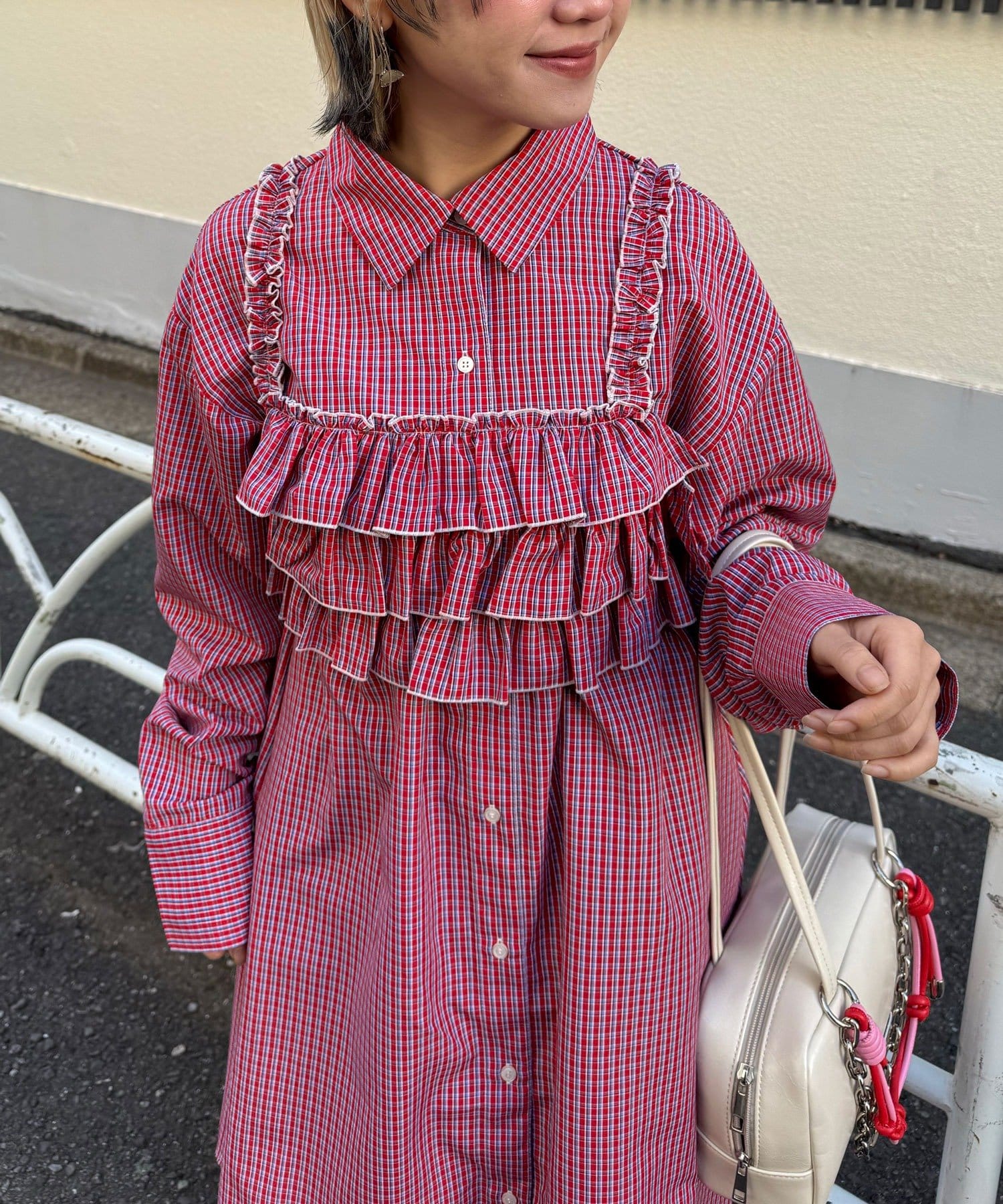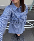 チェックに胸元のフリルが映えるビスチェセットシャツ。