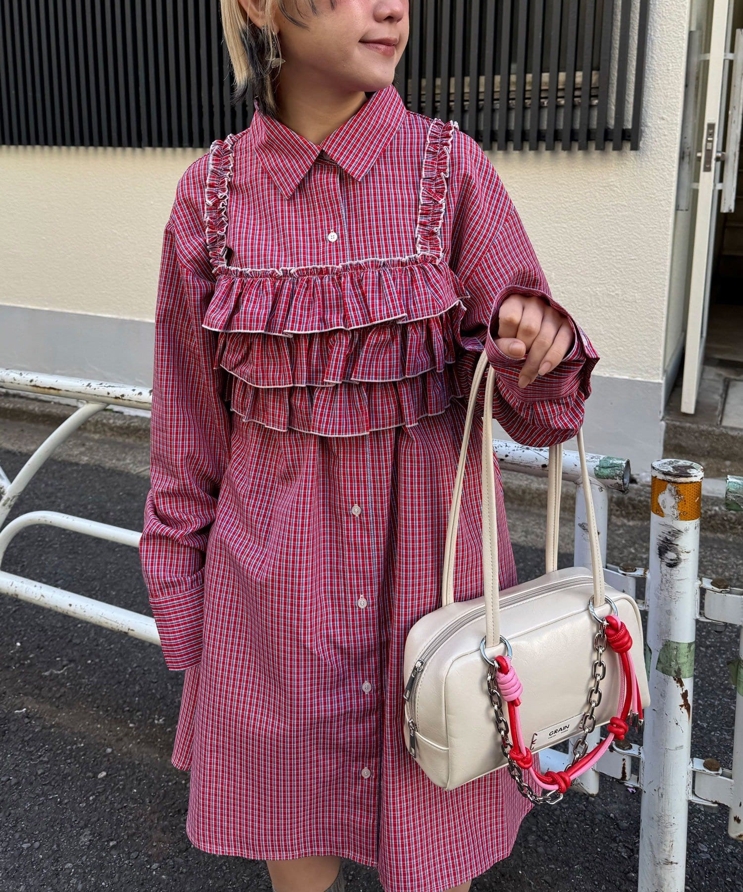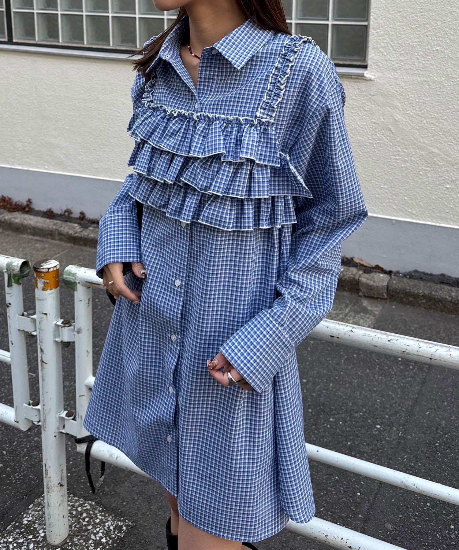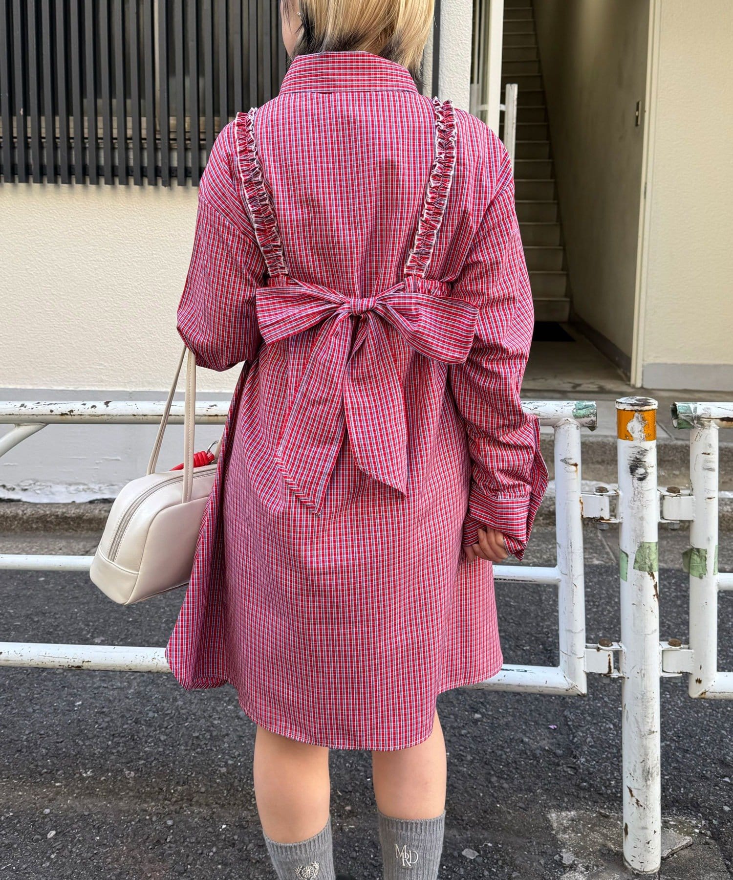 チェックに胸元のフリルが映えるビスチェセットシャツ。