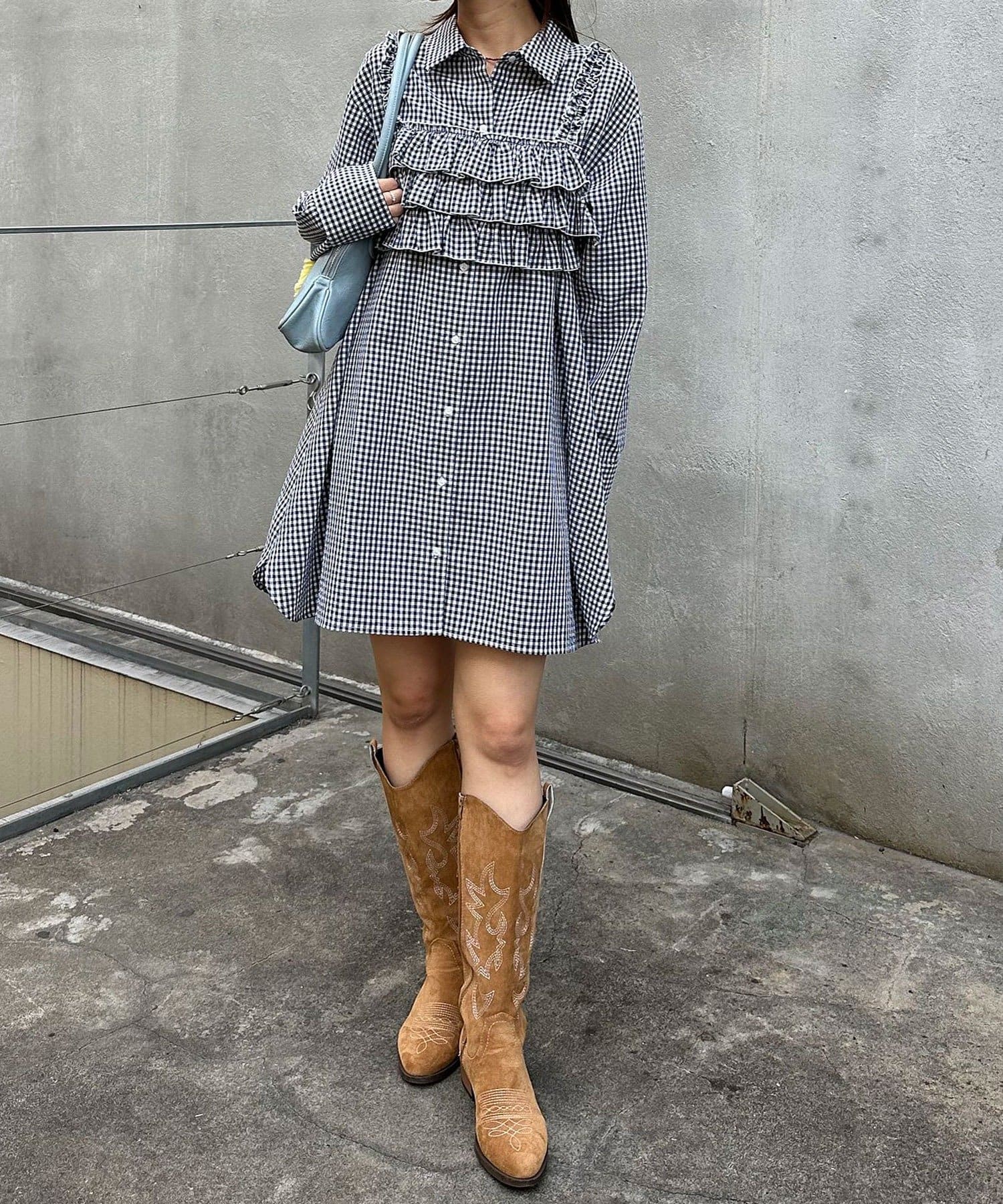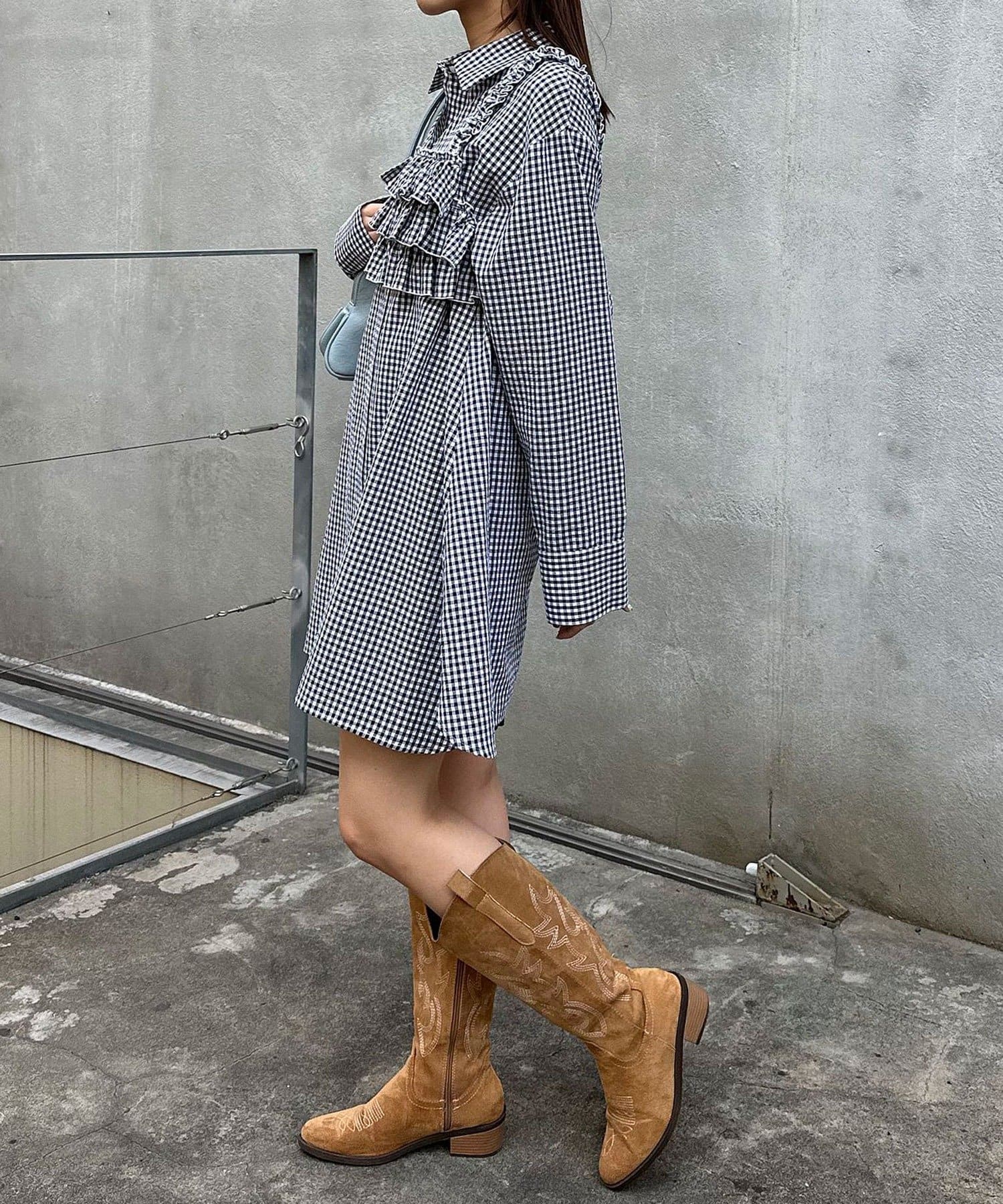 一枚でワンピ風に着て、足元はウエスタンブーツやローファー合わせがおすすめです。