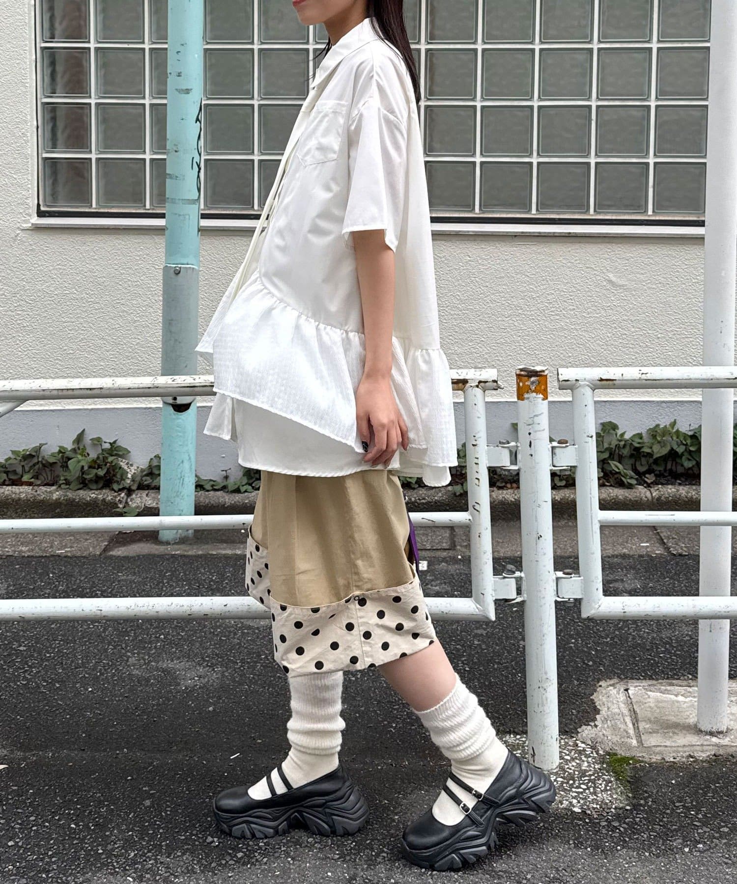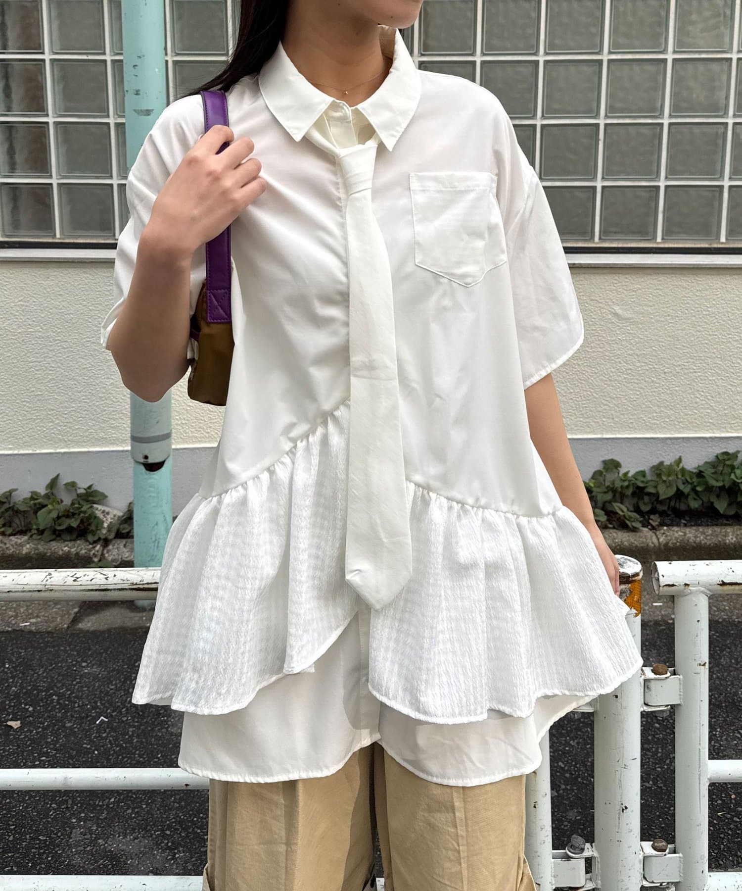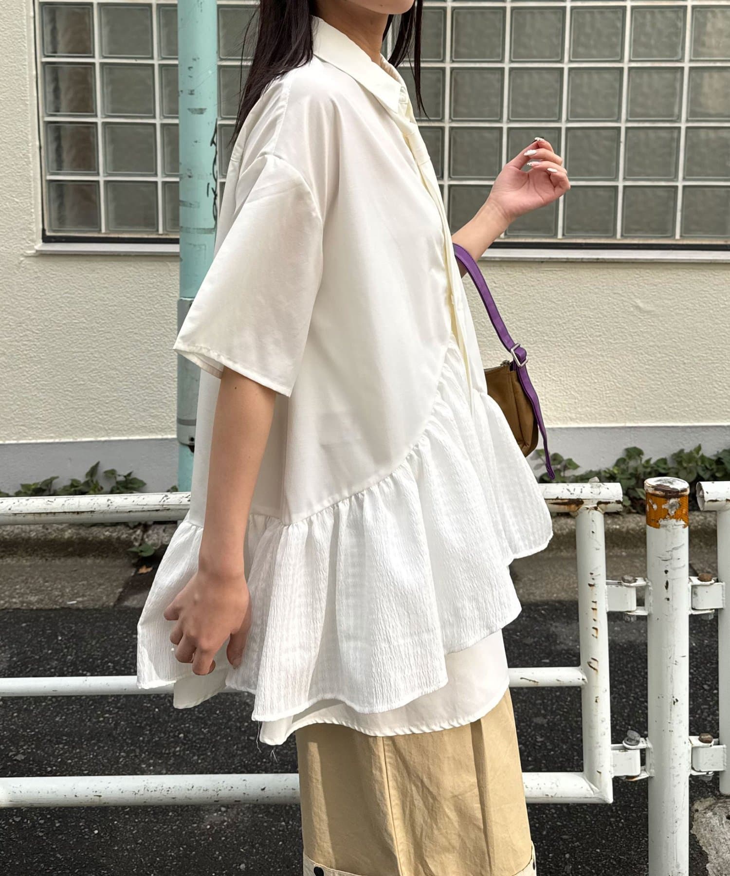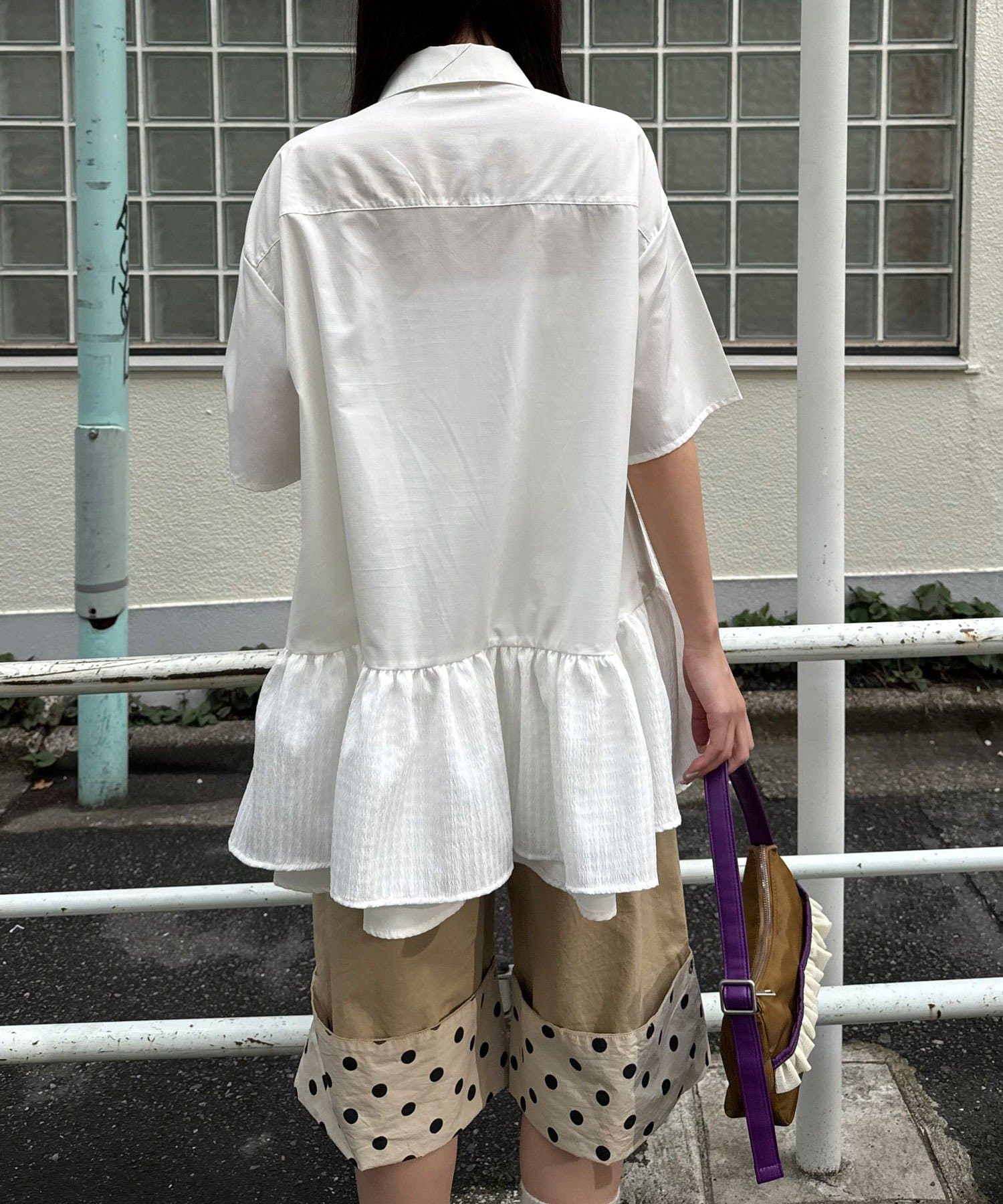 シャツのきちんと感に、ふわっと広がるティアードを重ねて、甘すぎないバランスに仕上げました。