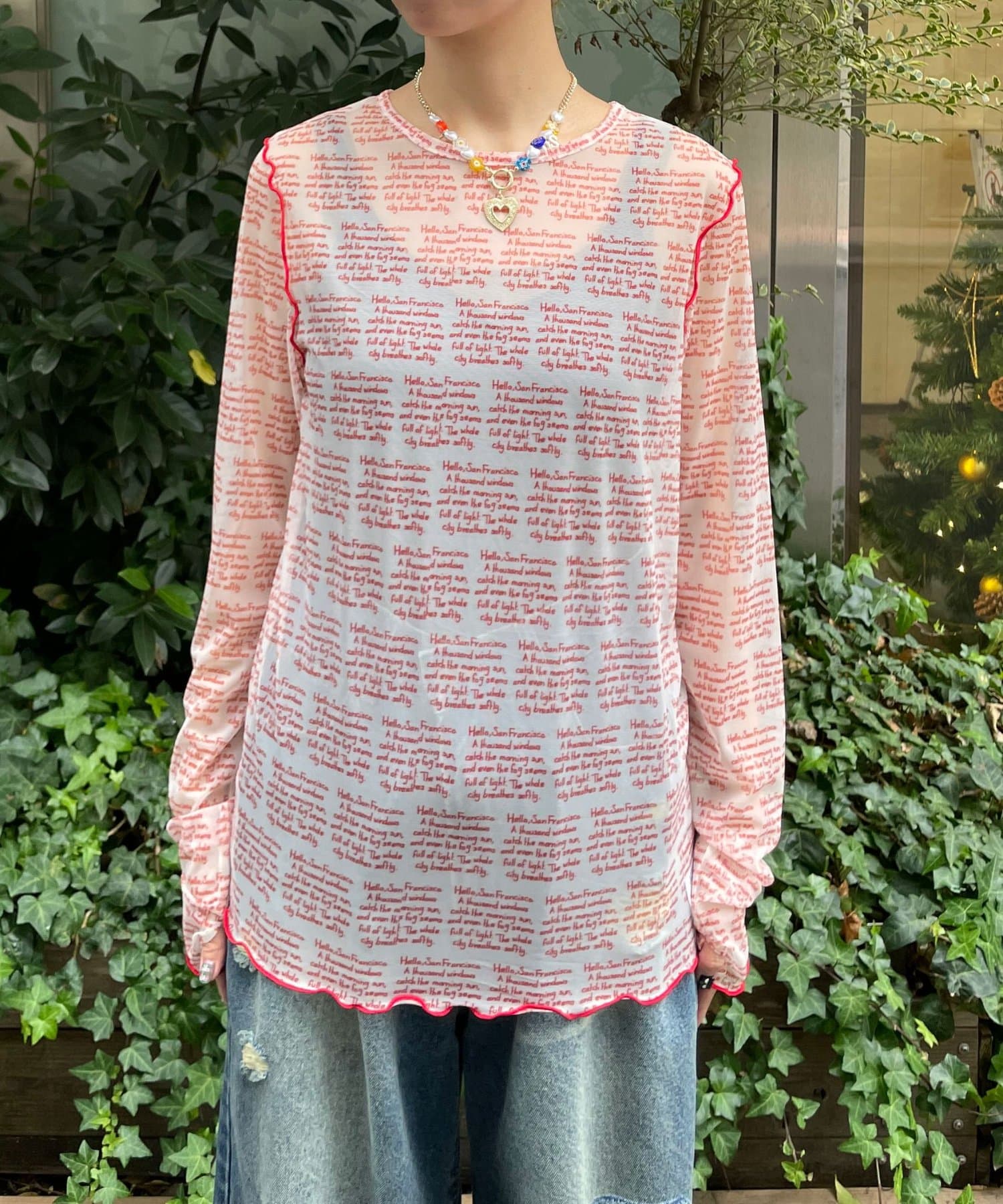 全面に施されたメッセージプリントと、縁取りのメロー仕上げがポイントのシアートップス。