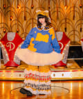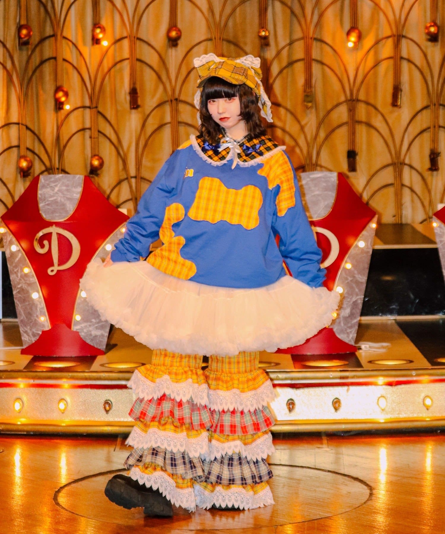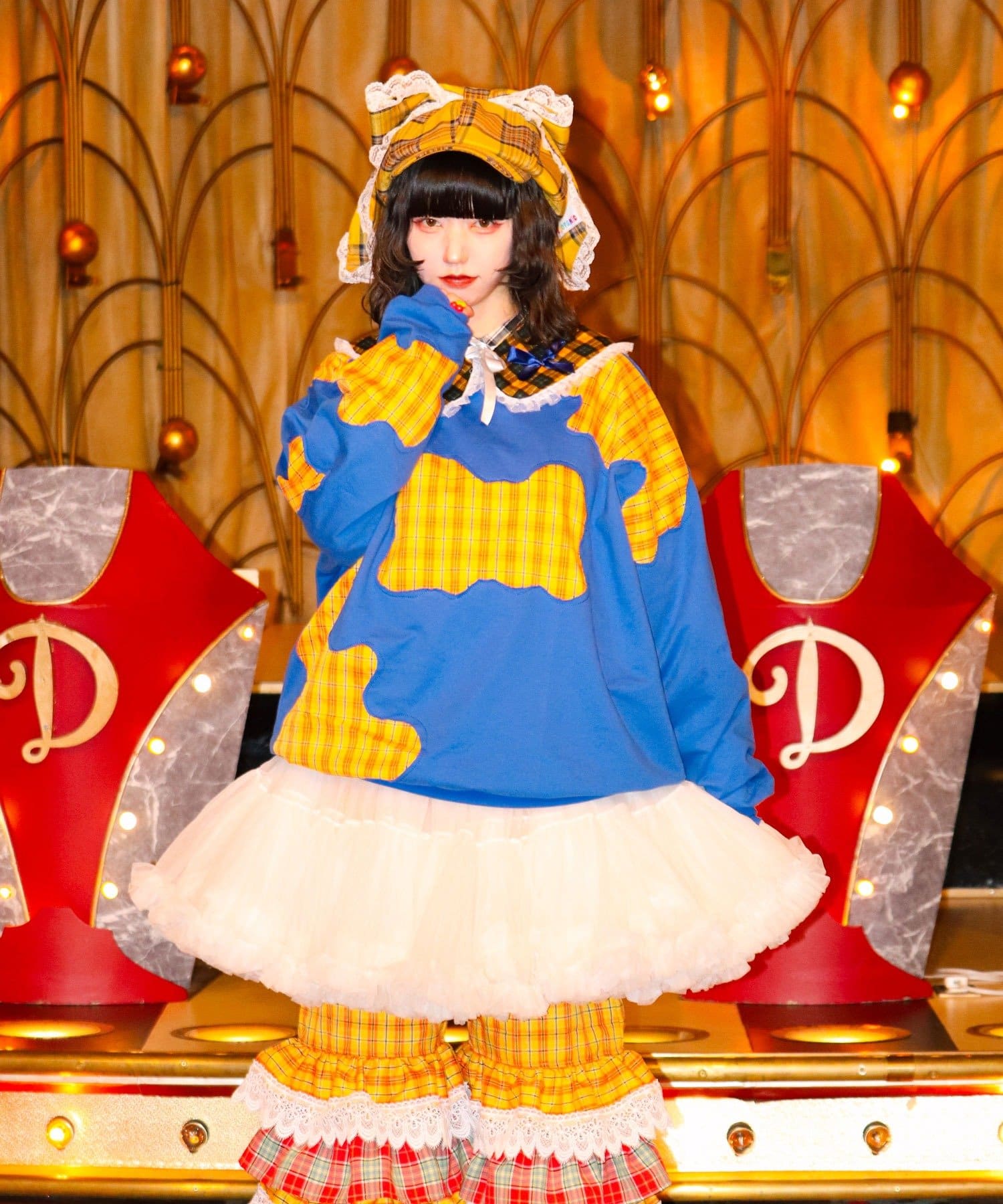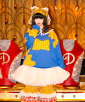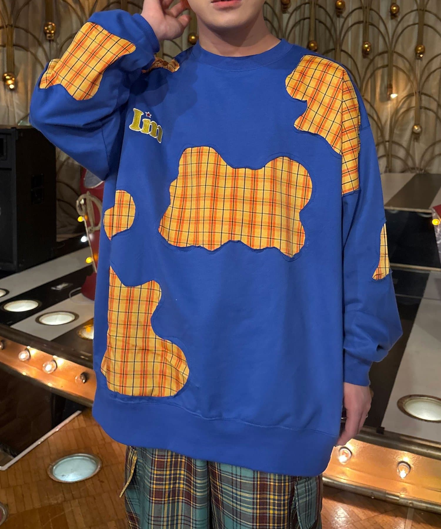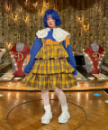 I’mらしいポップな配色と、チェック生地を大胆に切り替えたパッチワーク風デザインが目を惹く一着。