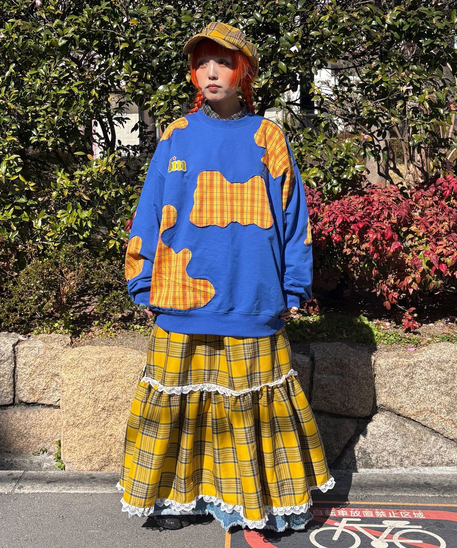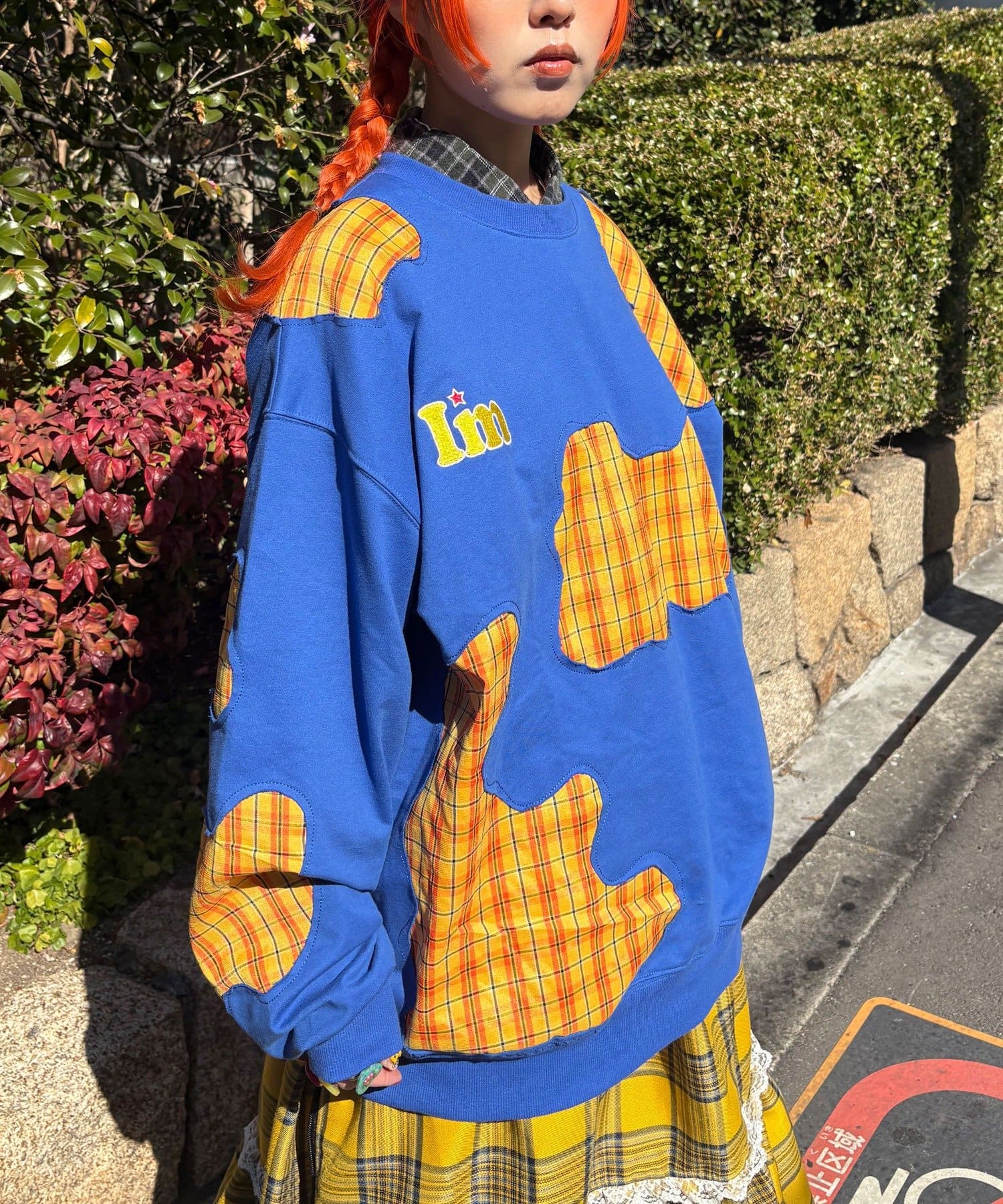 I’mらしいポップな配色と、チェック生地を大胆に切り替えたパッチワーク風デザインが目を惹く一着。