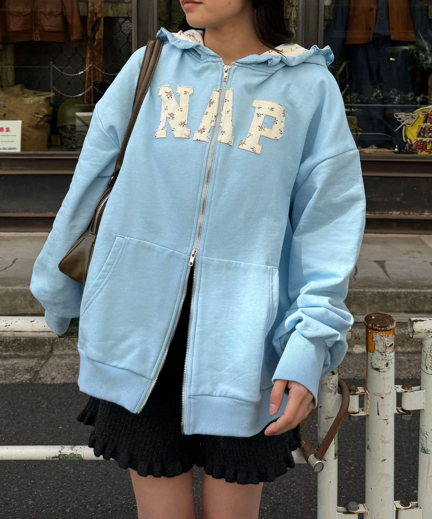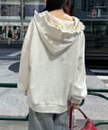 フードから覗く花柄と縁取りのフリルが、顔まわりを一気に華やかに見せてくれる主役級パーカー。