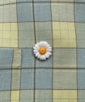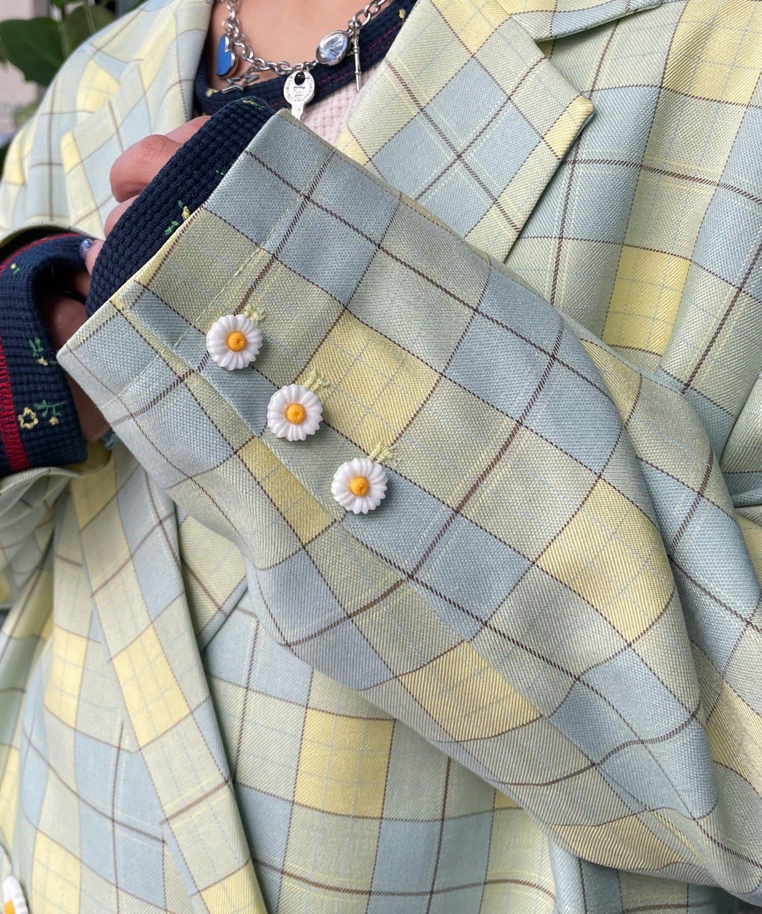 クラシックなチェック柄に、フラワーモチーフのボタンをあしらった遊び心のあるオーバージャケット。