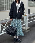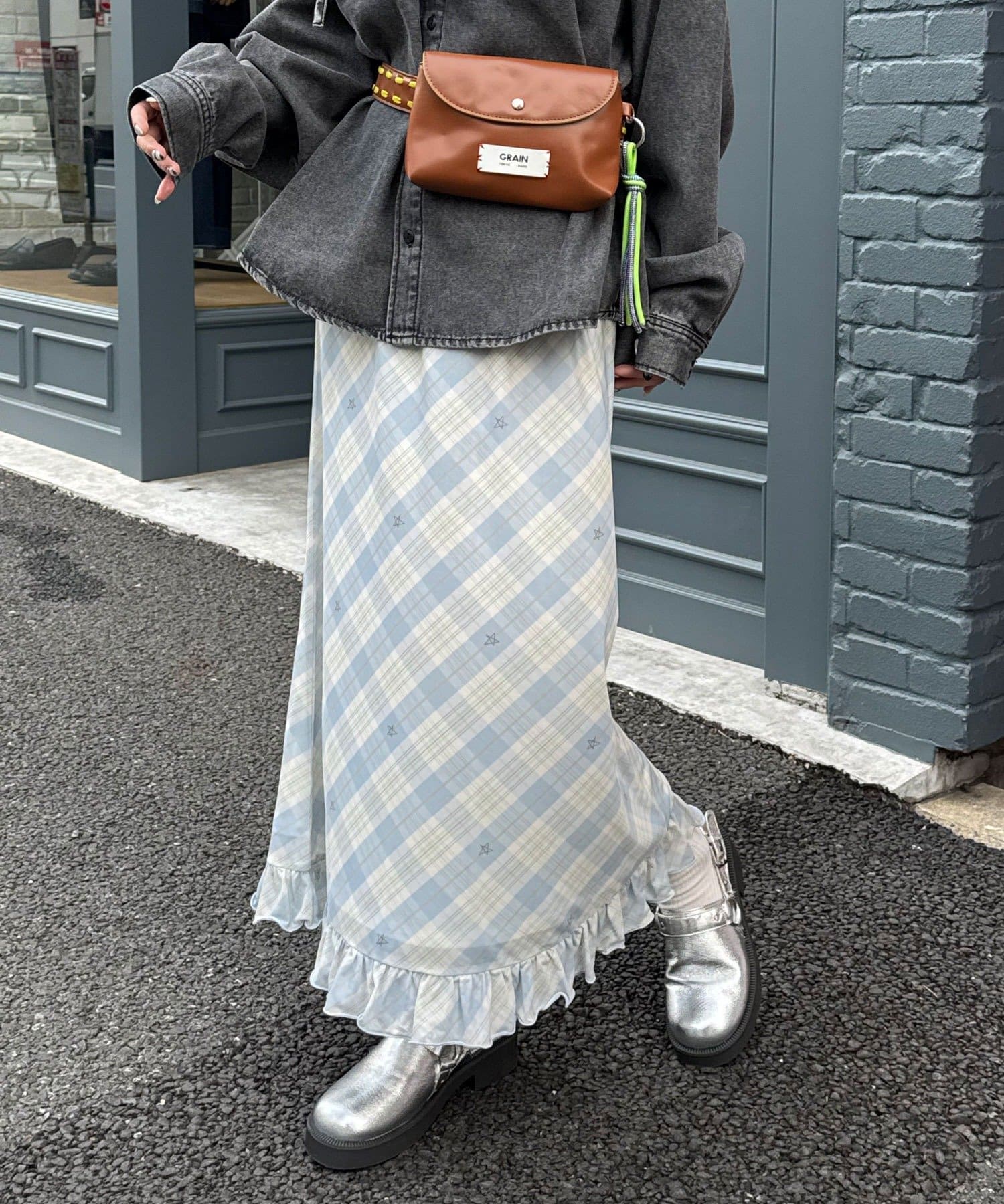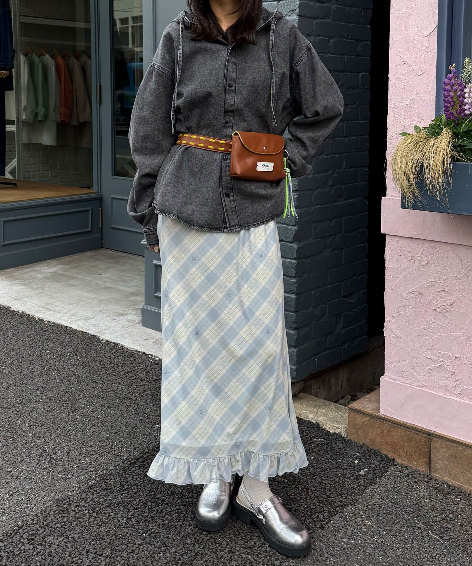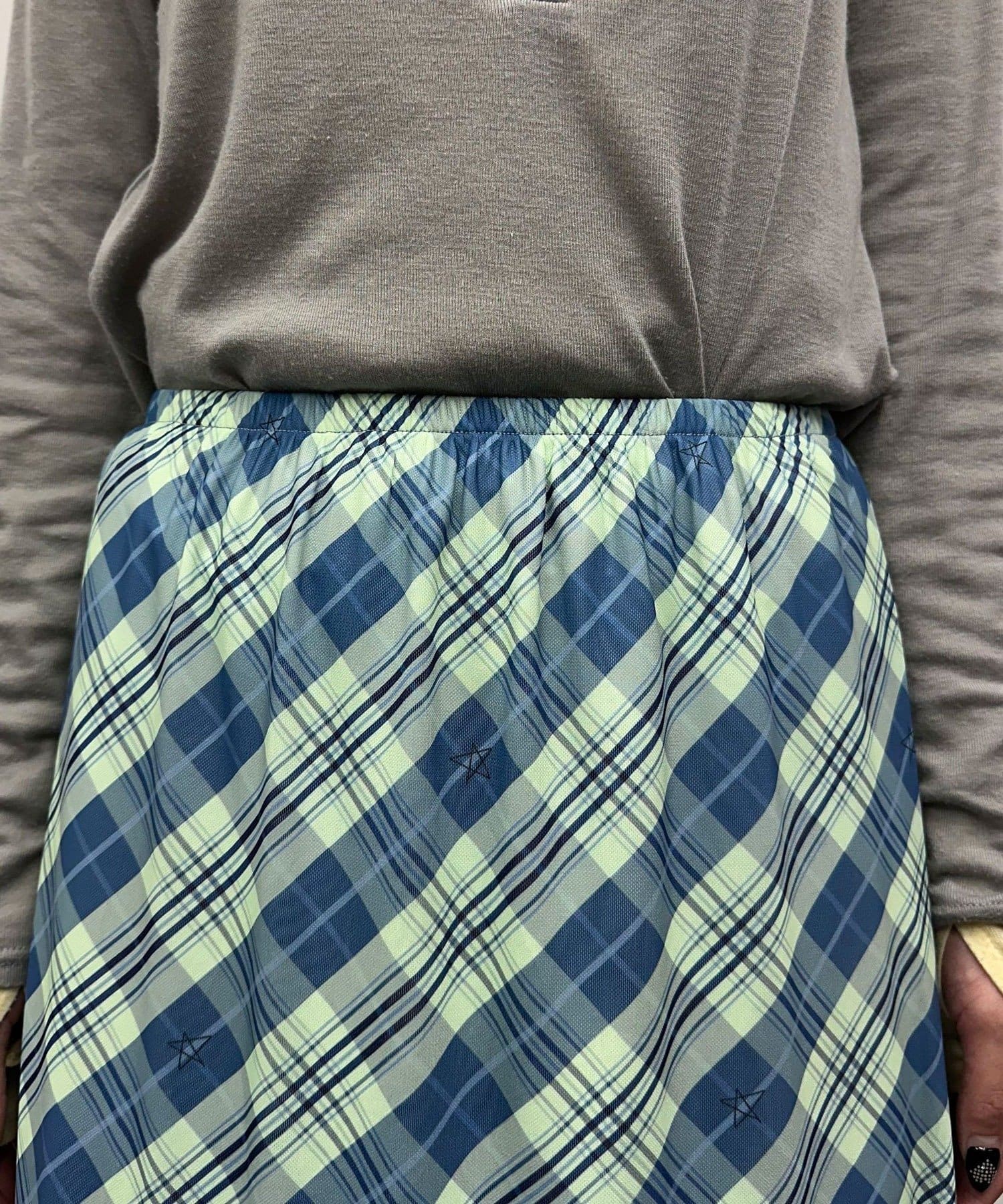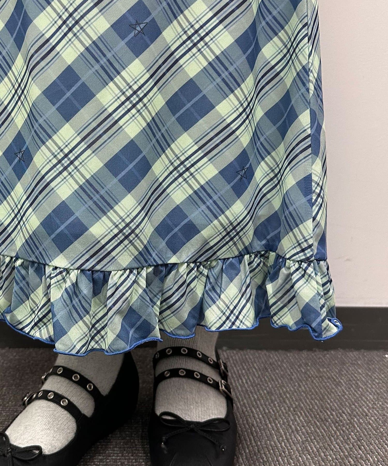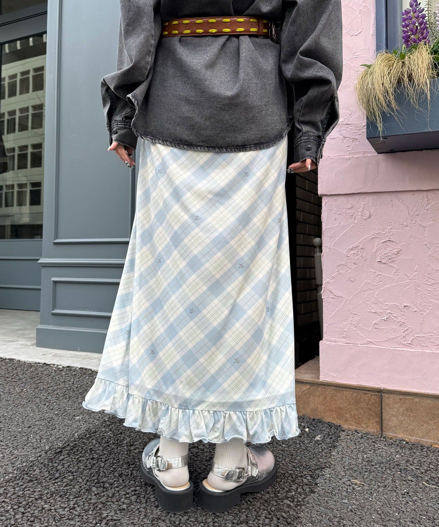 メッシュ素材にチェック柄と星柄を重ねた、遊び心のあるロングスカート。
