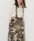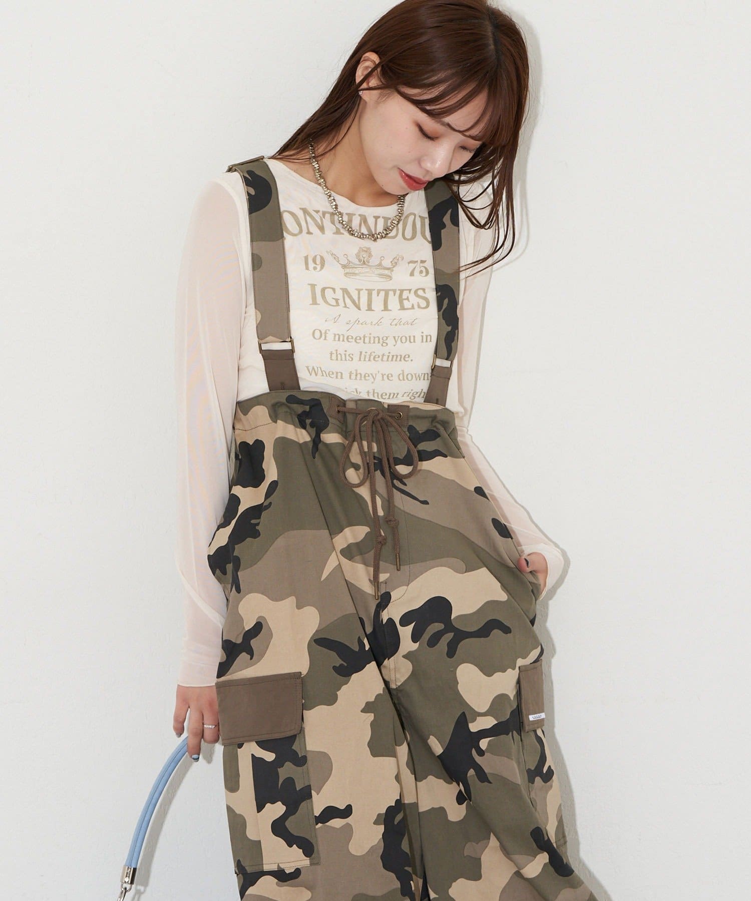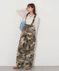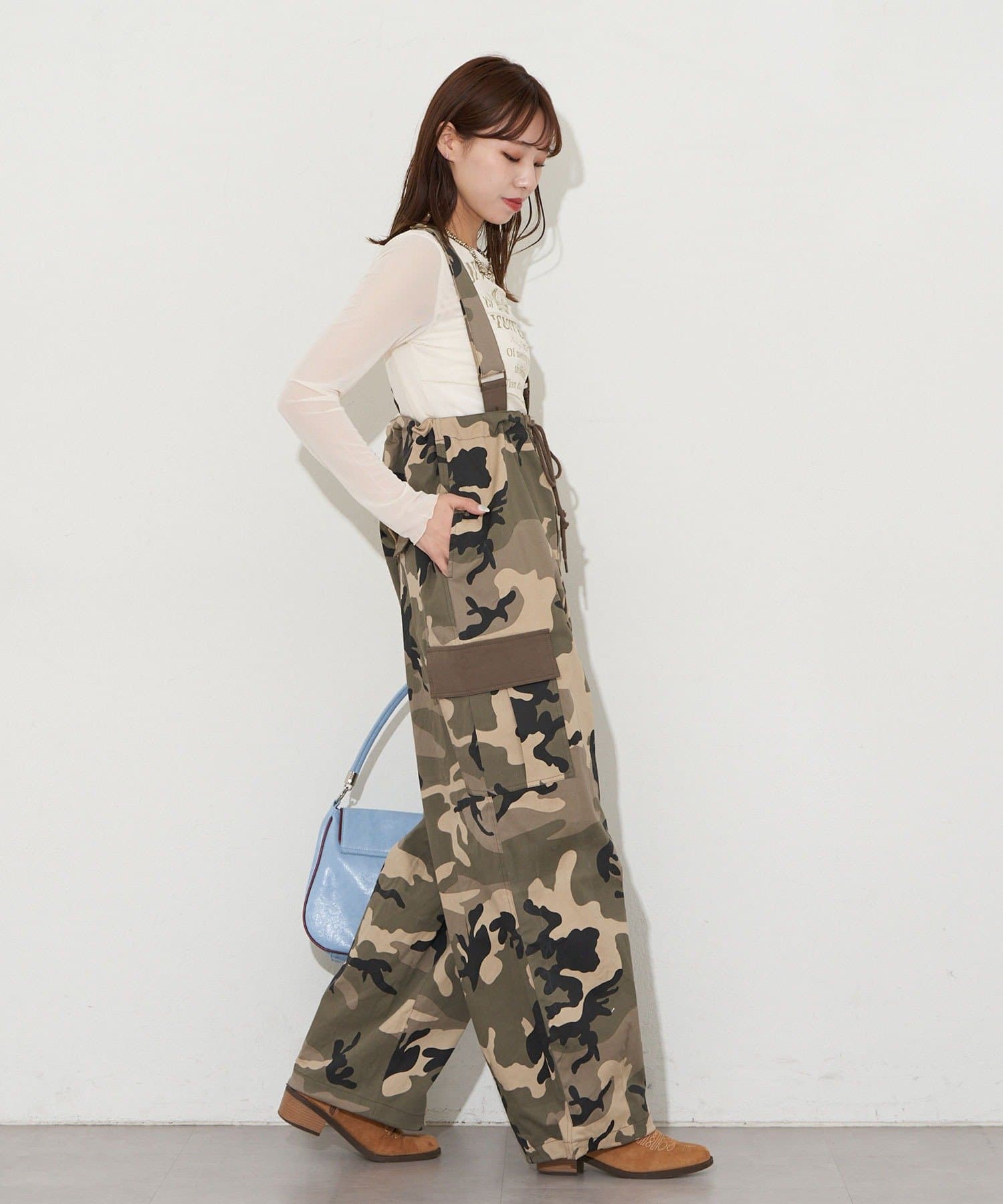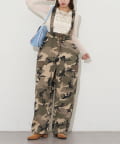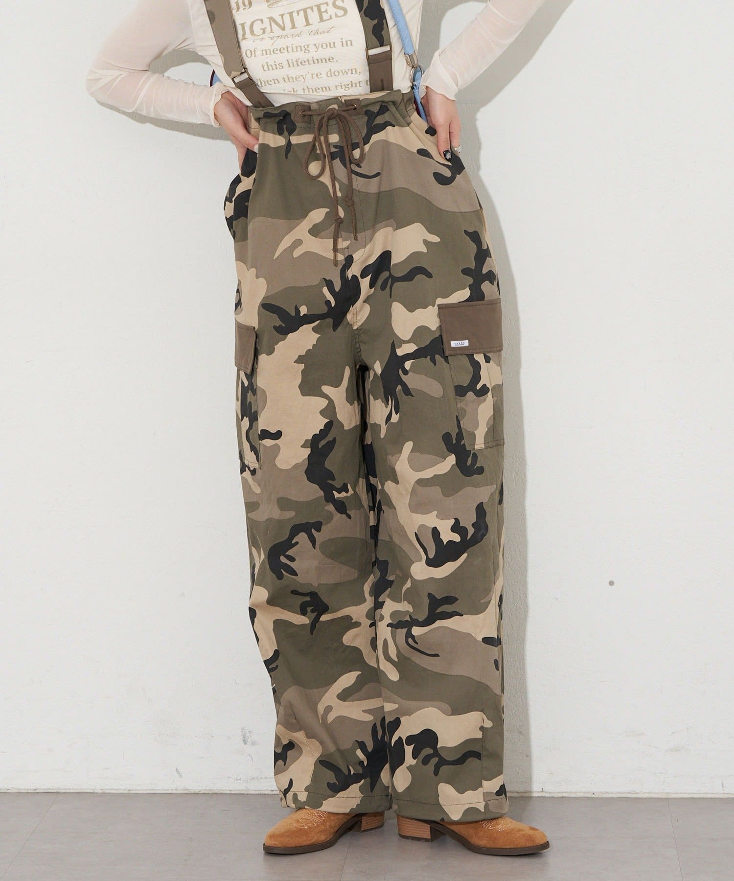 無地とカモ柄、気分で選べる二色展開のサスペンダー付きワイドカーゴパンツ。