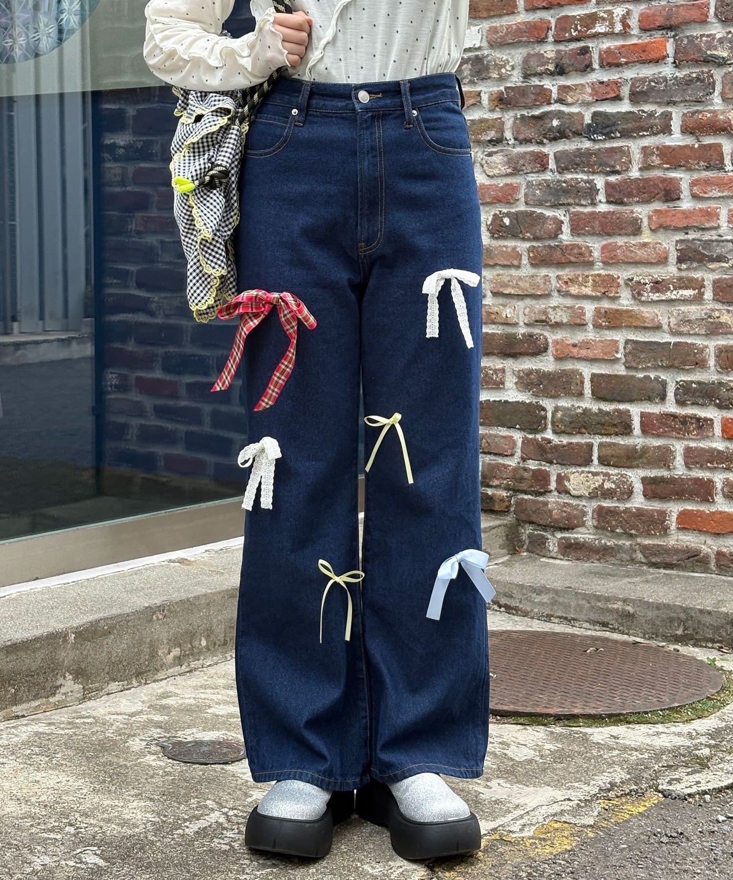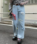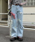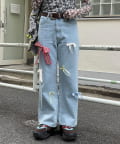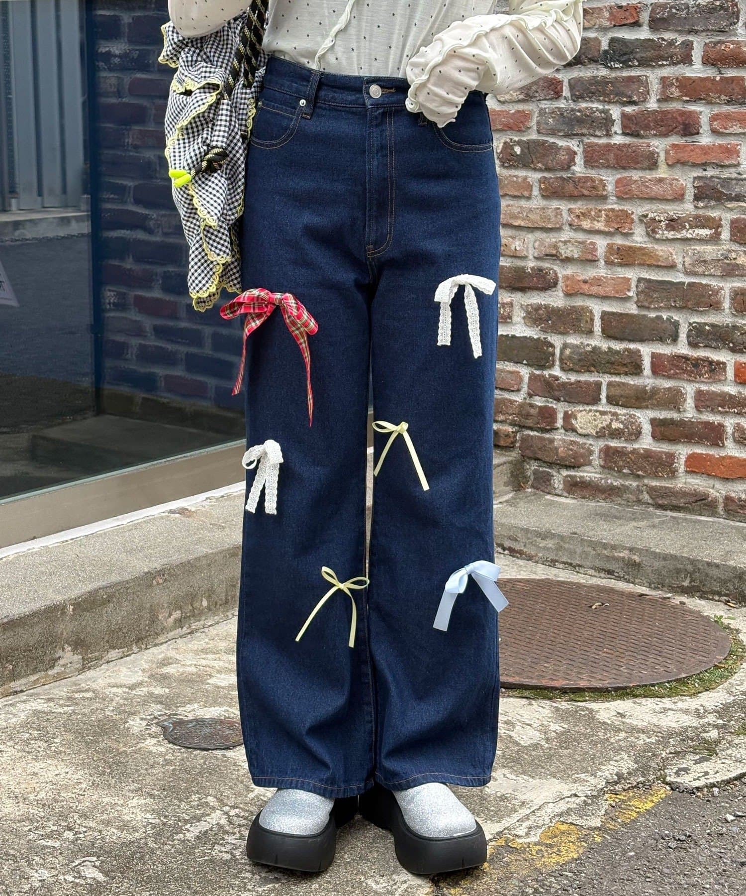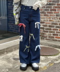 ランダムにあしらったリボンモチーフが目を引く、デザインデニムパンツ。