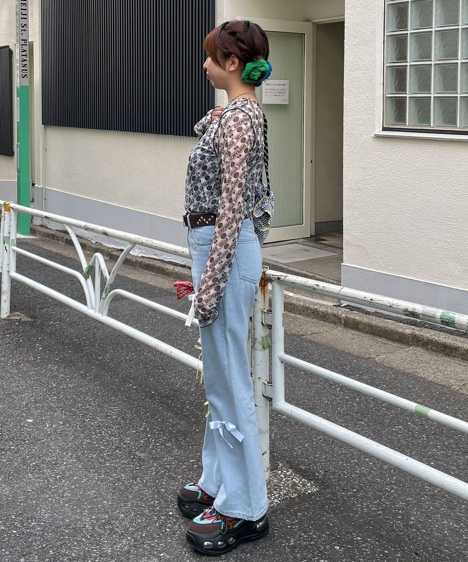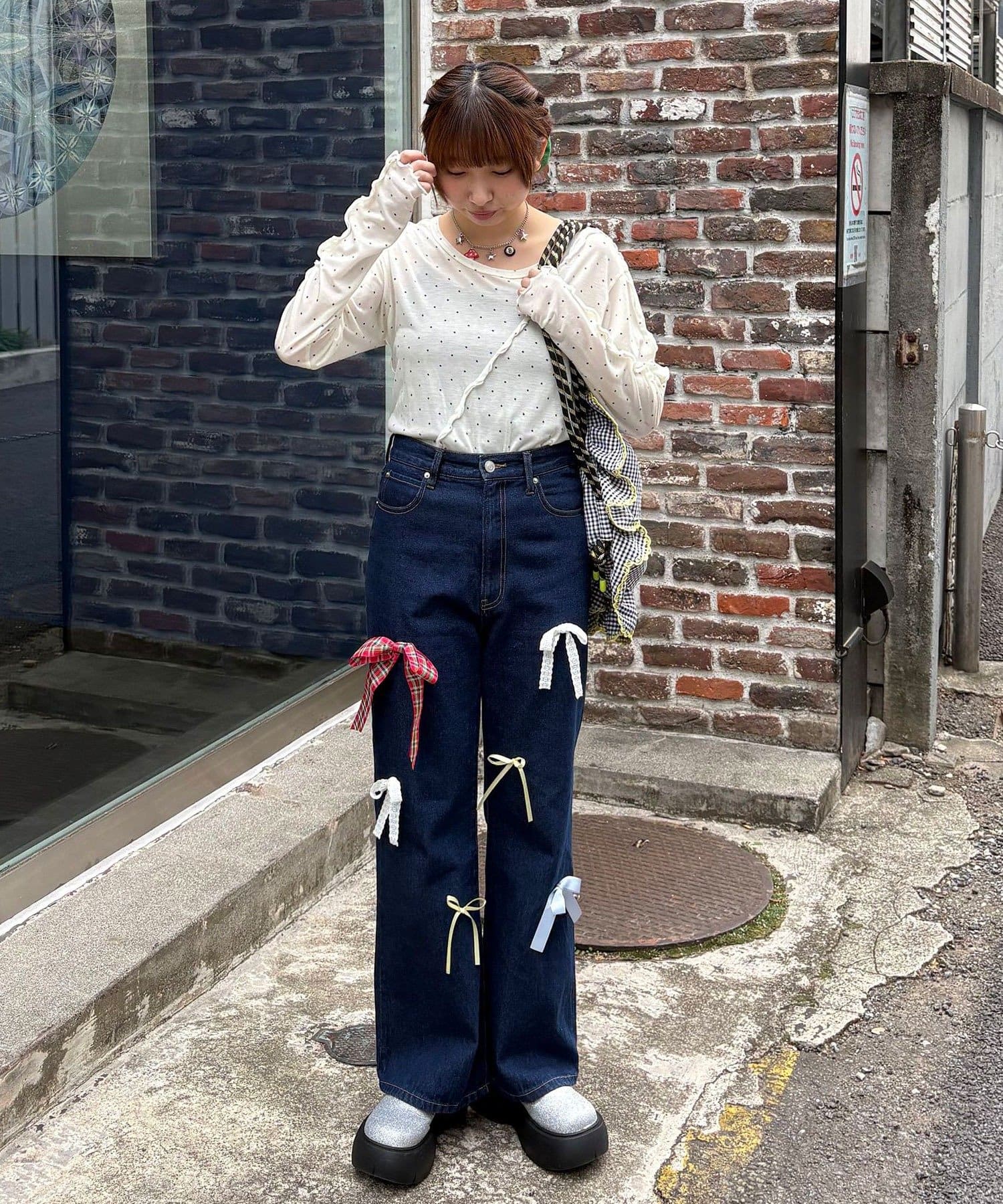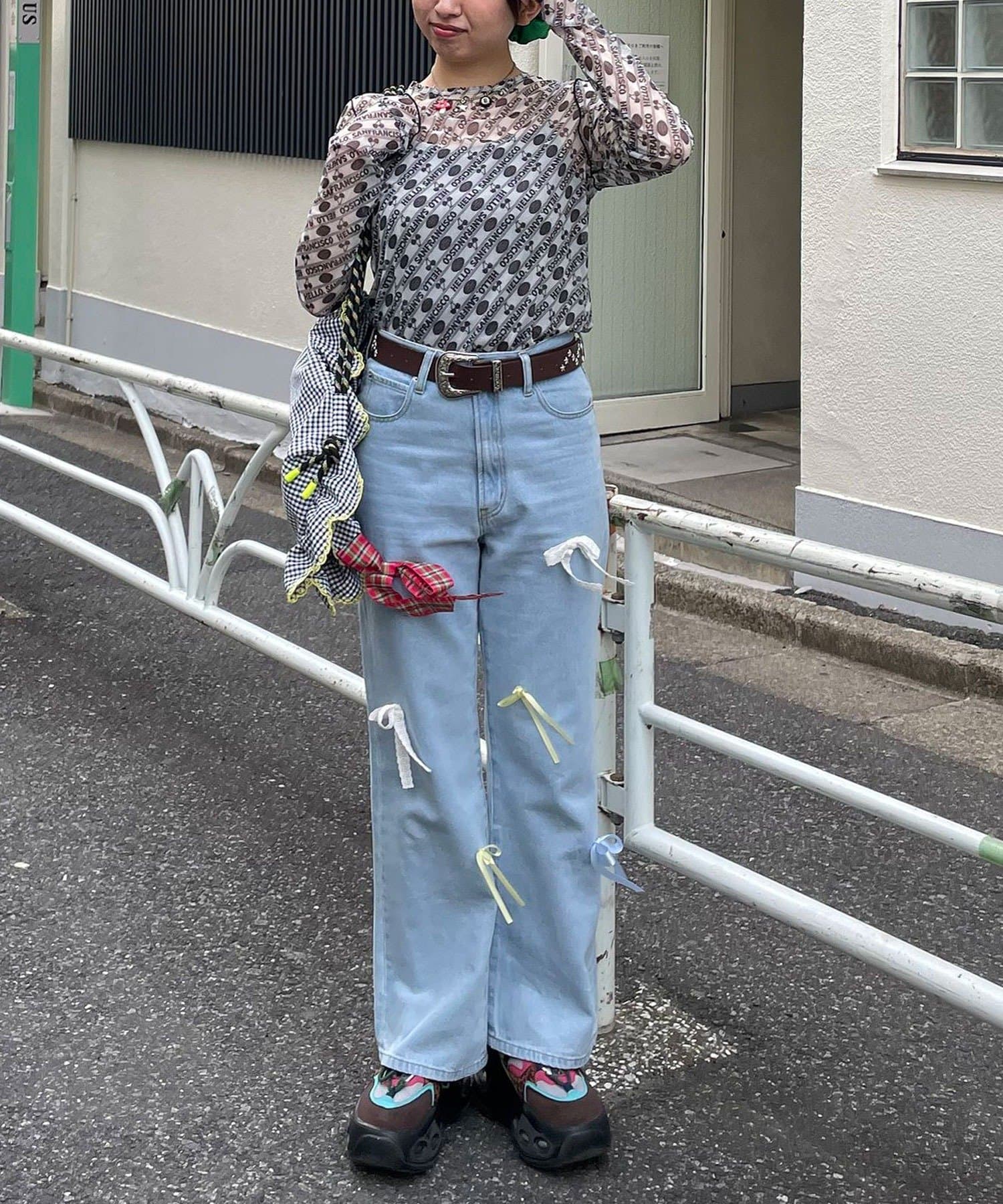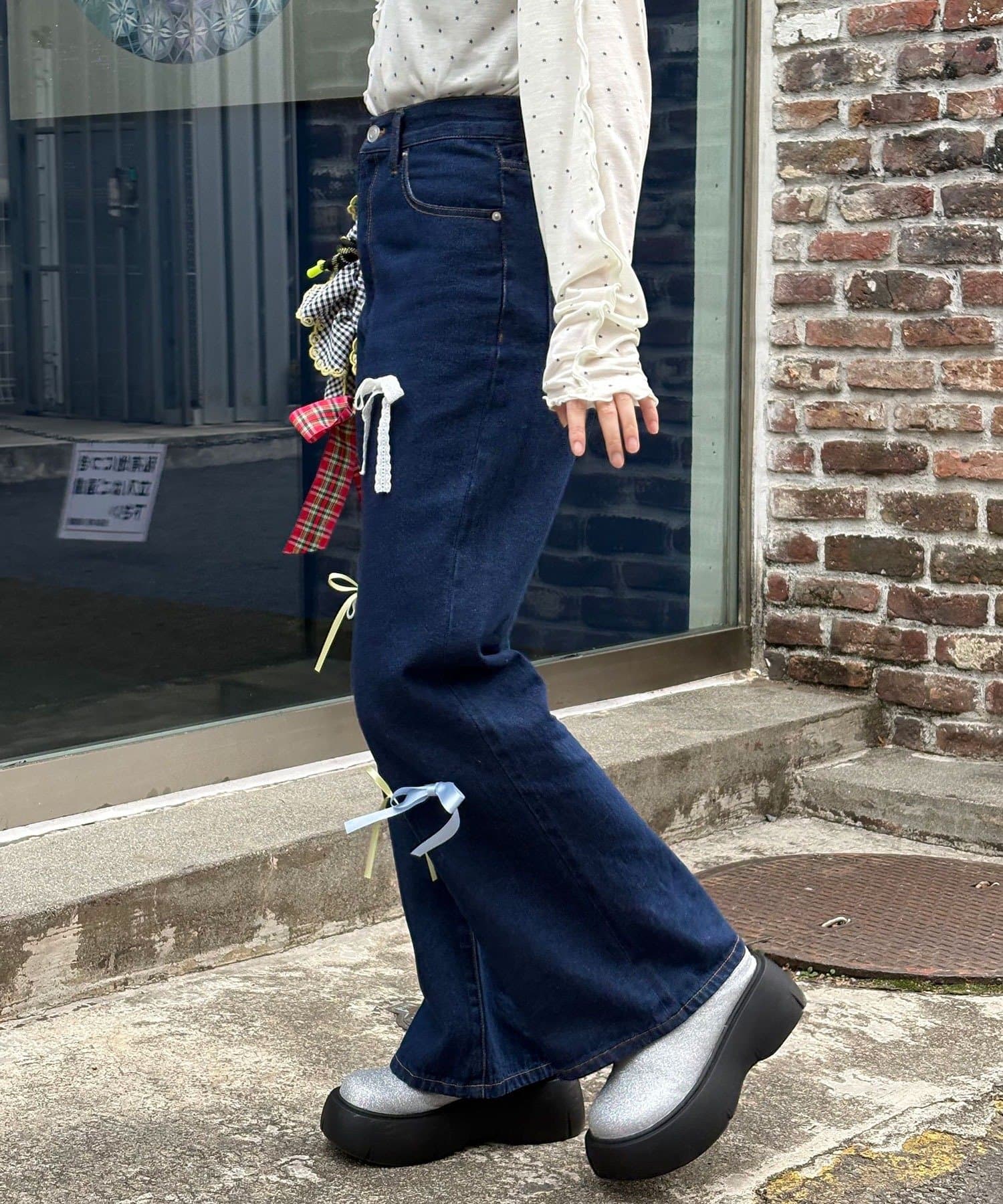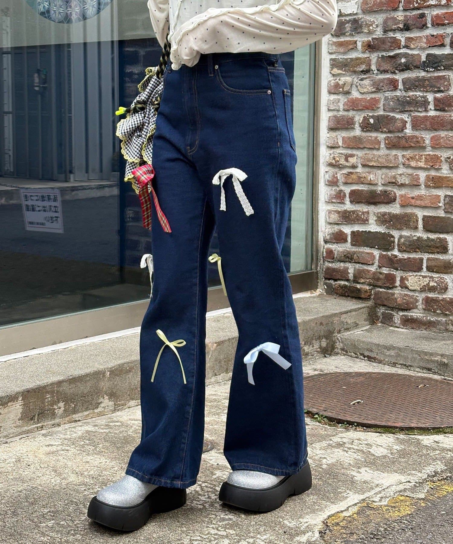 甘めカジュアルなカラフルリボンフレアデニム