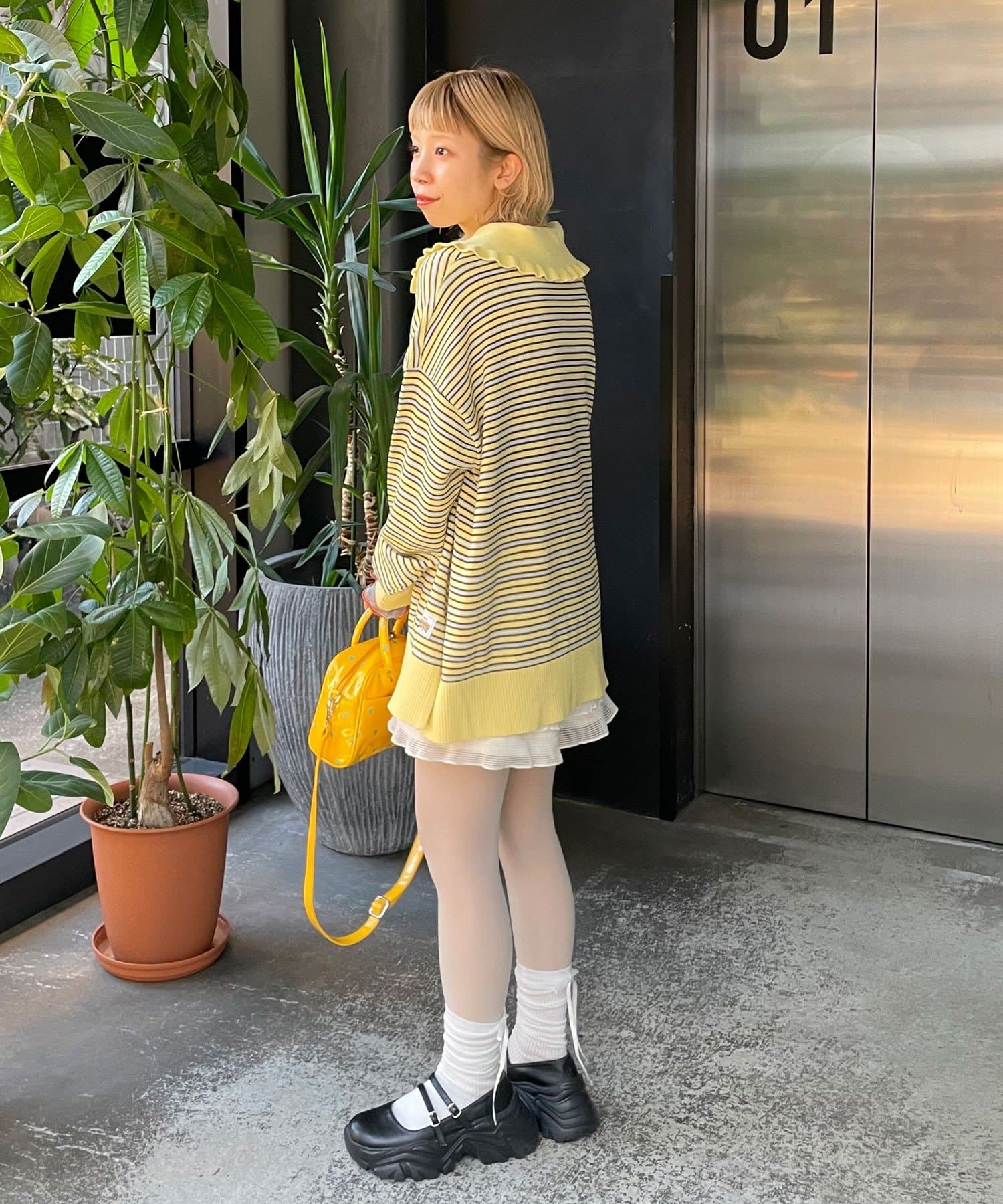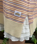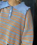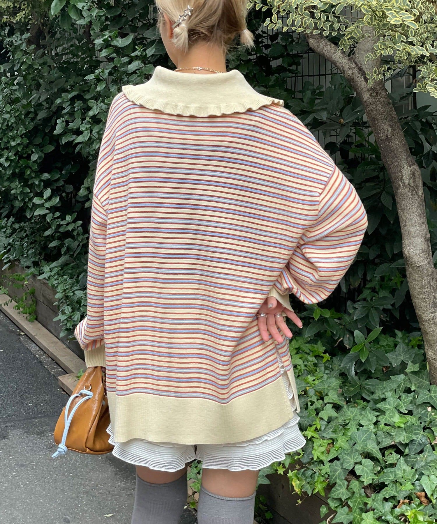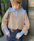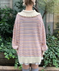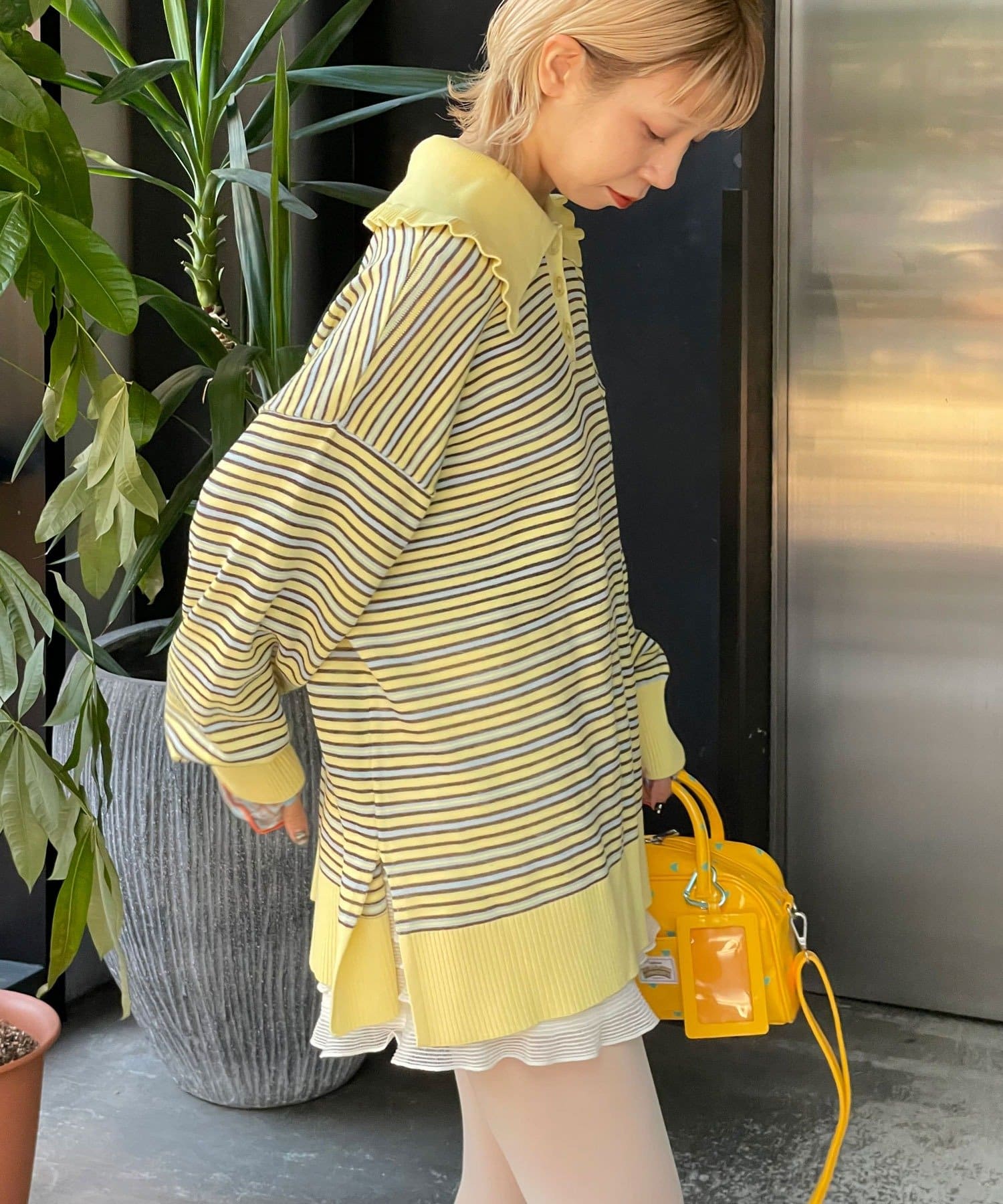 配色ボーダーと大きめの襟デザインが目を引く、レイヤード風トップス。