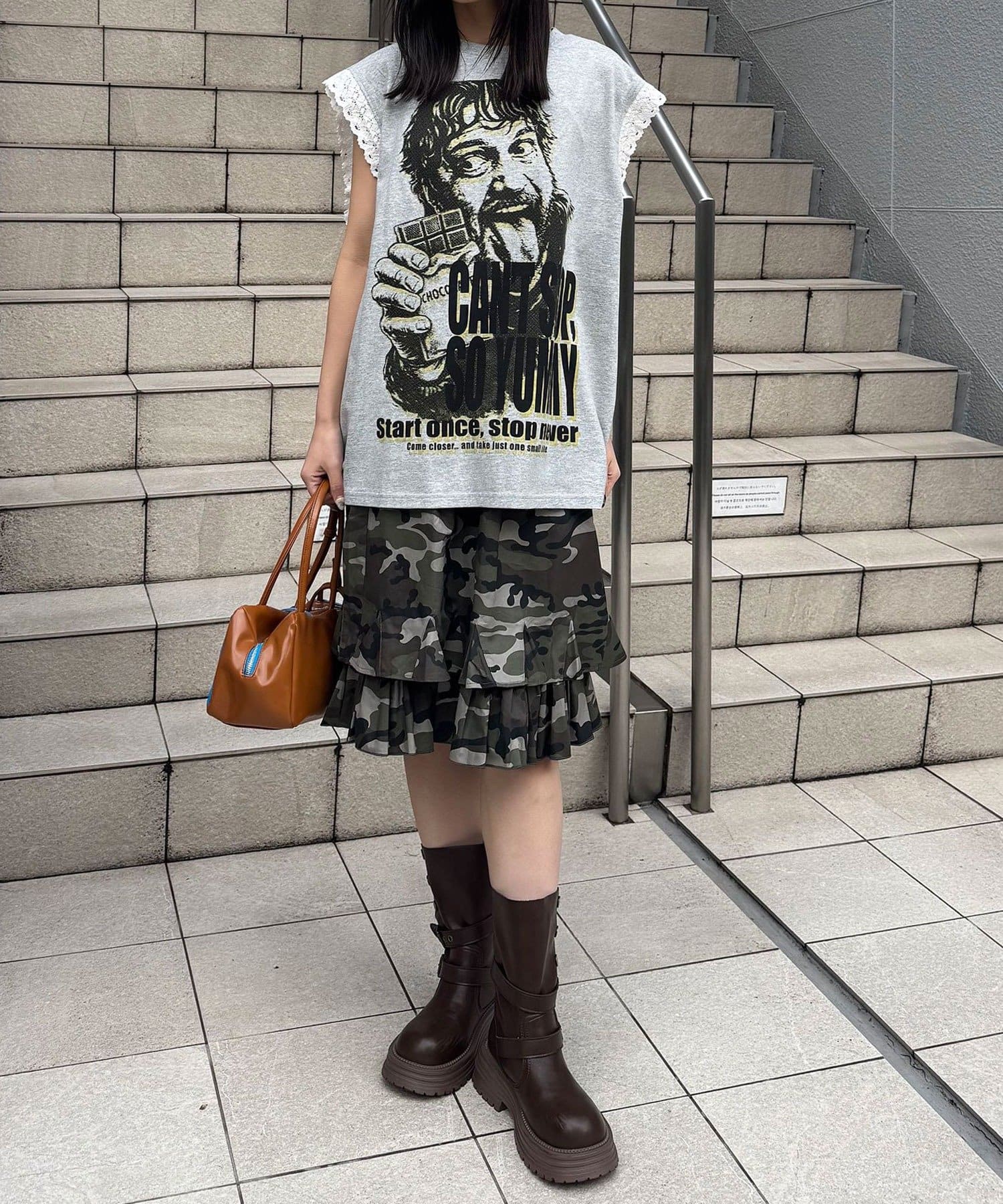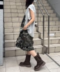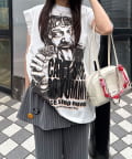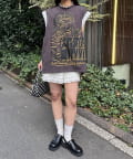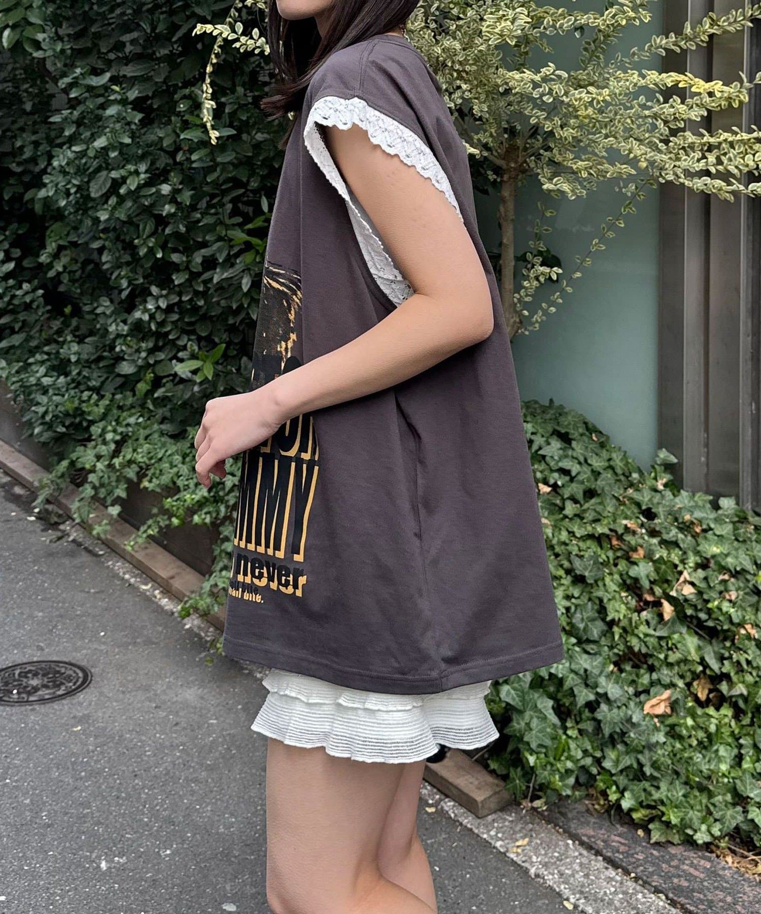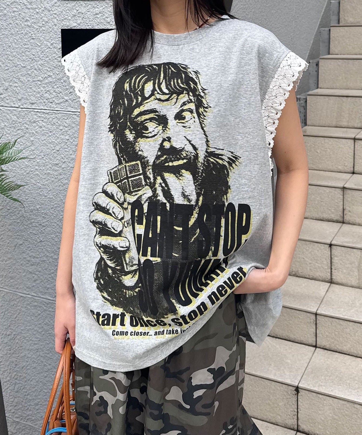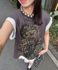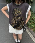 パンチの効いたグラフィックに、袖のレースで甘さを足した「甘辛ミックス」な一着。