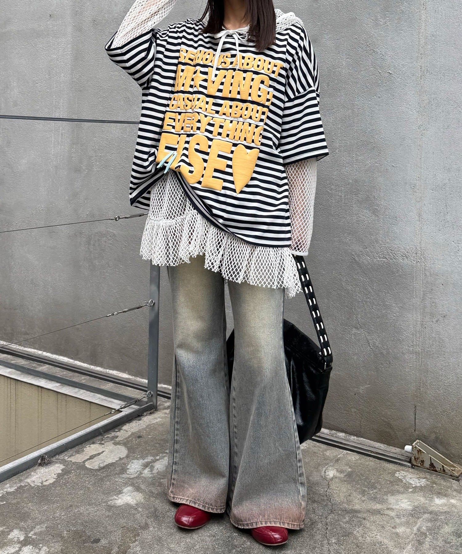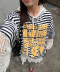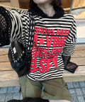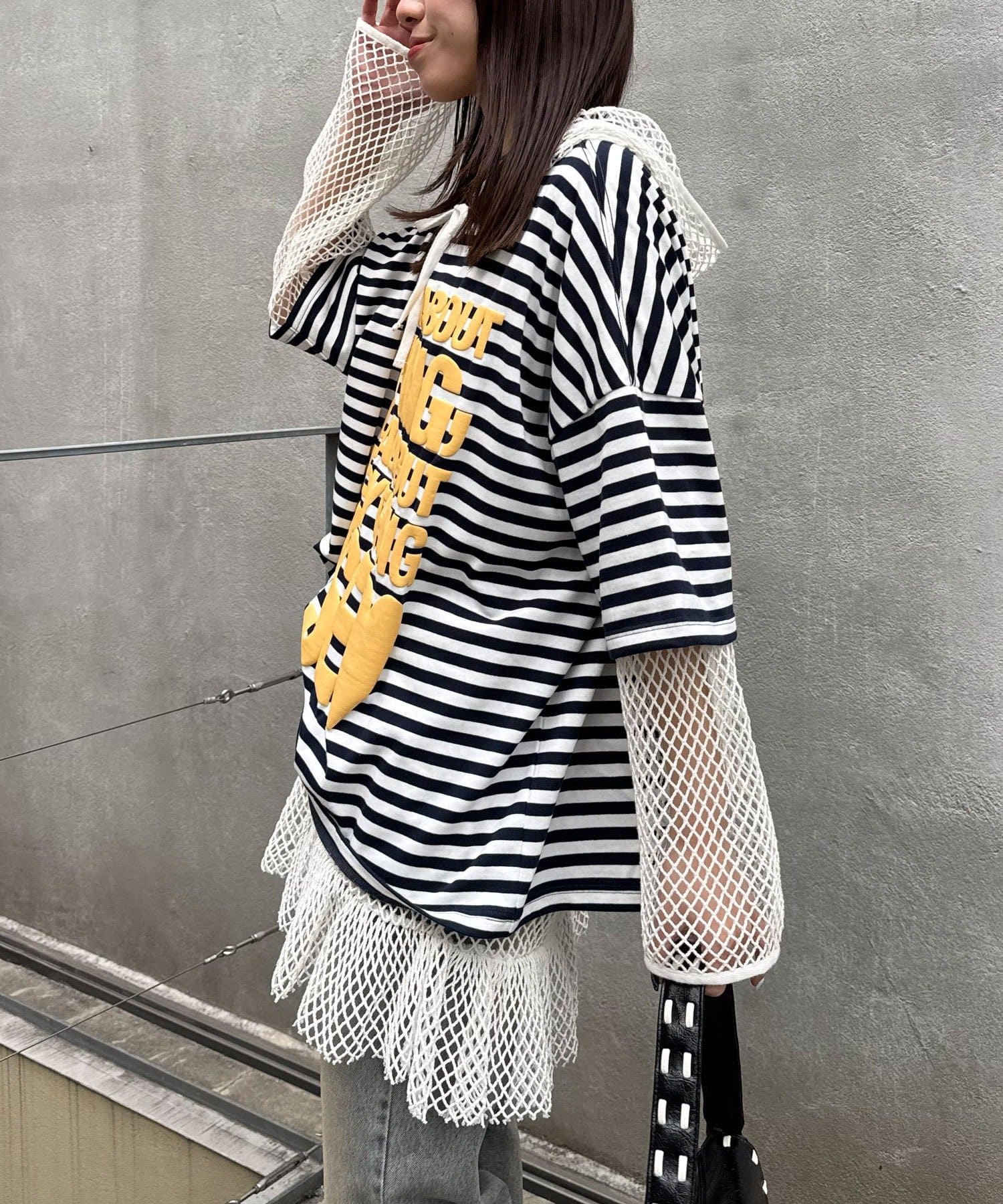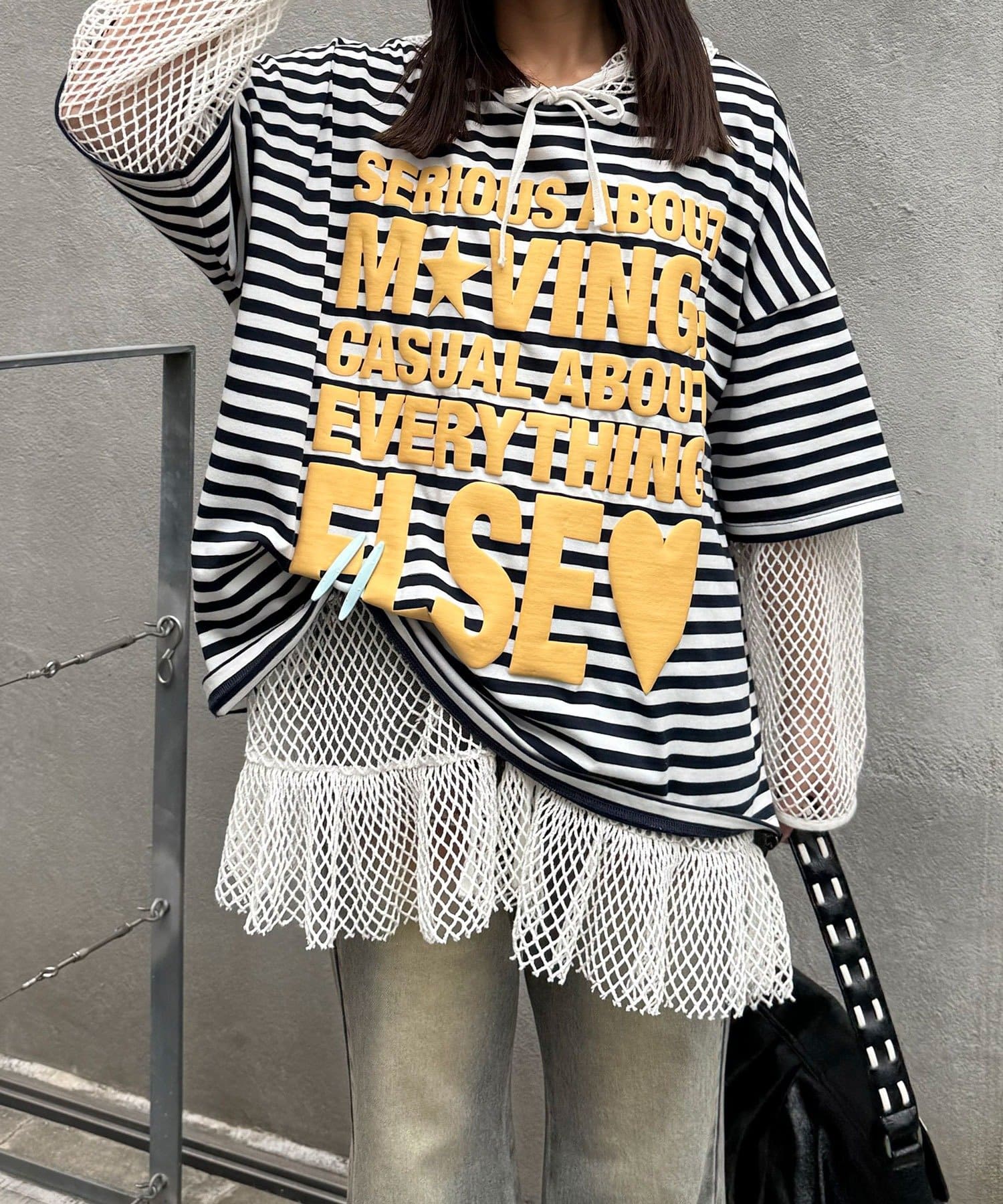 キャッチーな配色ボーダーに、立体的な「発泡プリント」のロゴをのせた存在感抜群の一着。