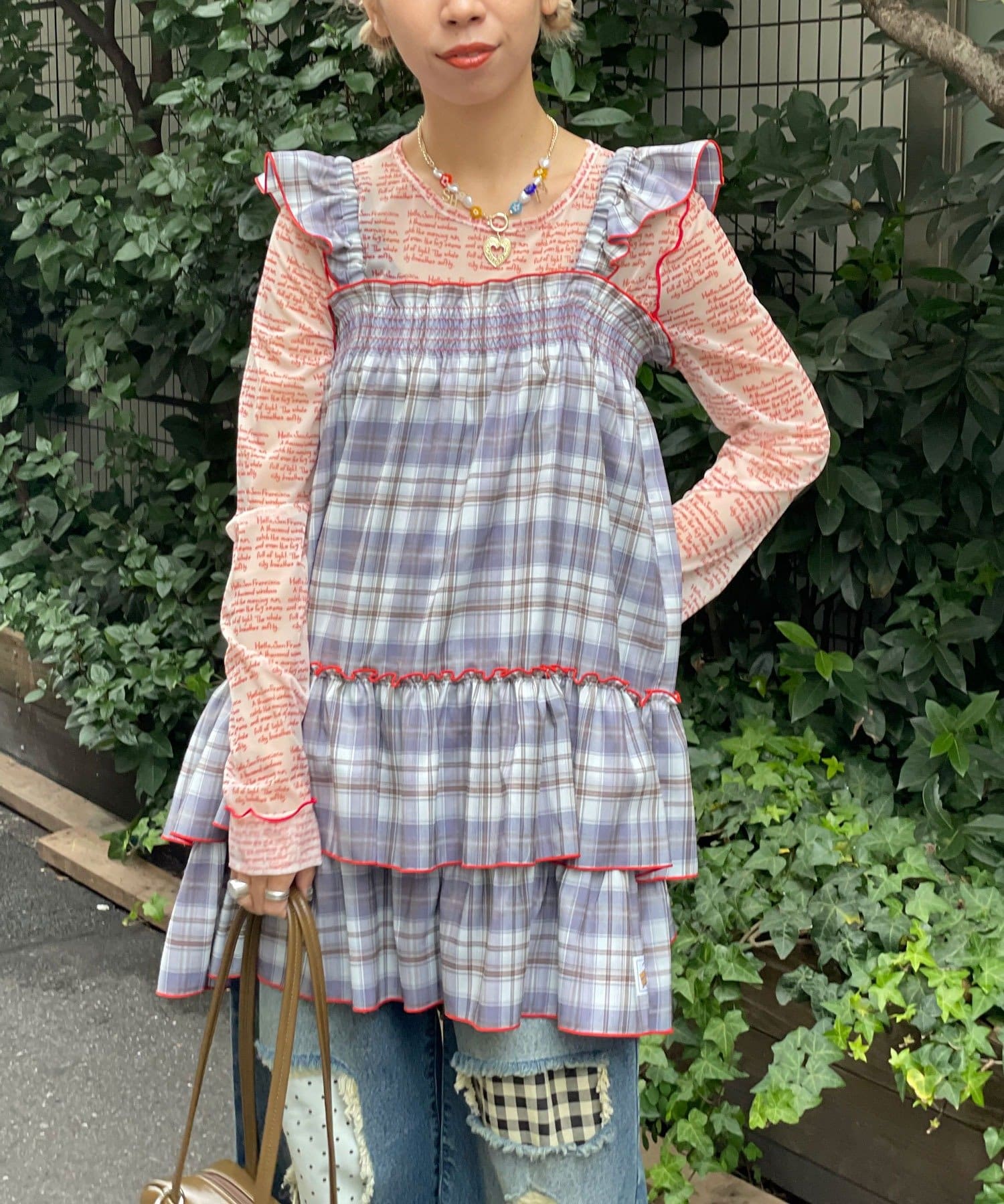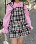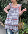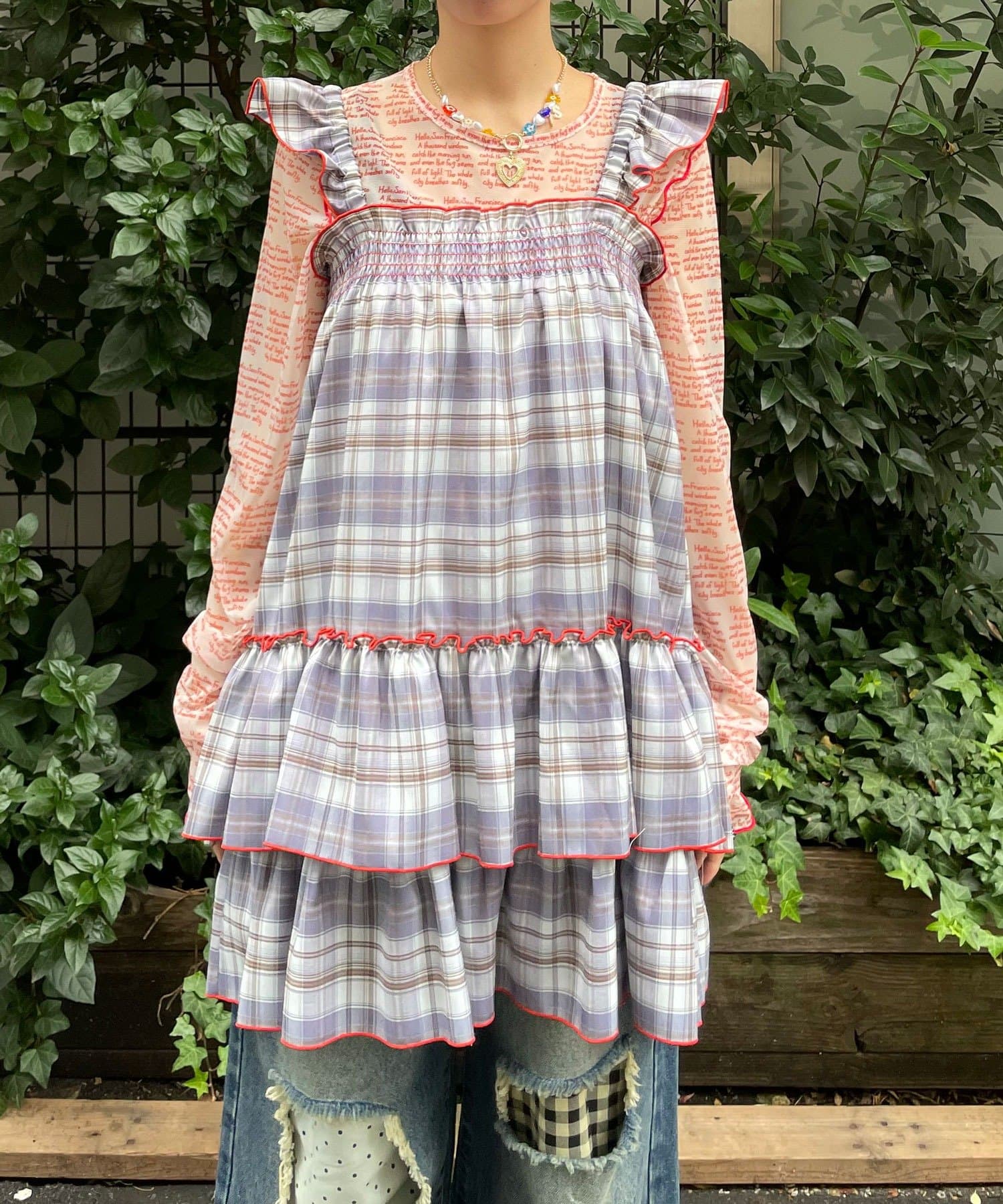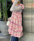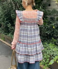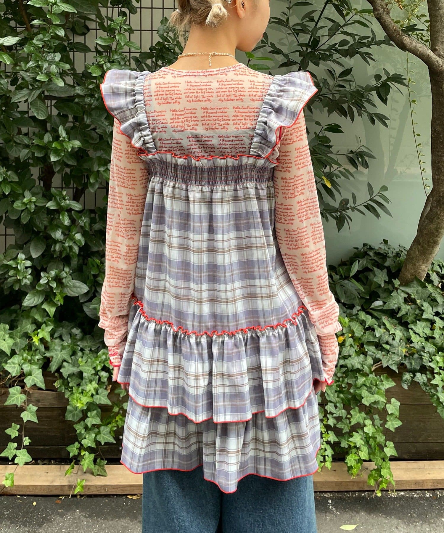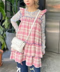 チェック柄をベースに、フリル切替と配色メローを効かせたチュニックワンピース。