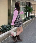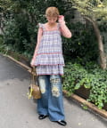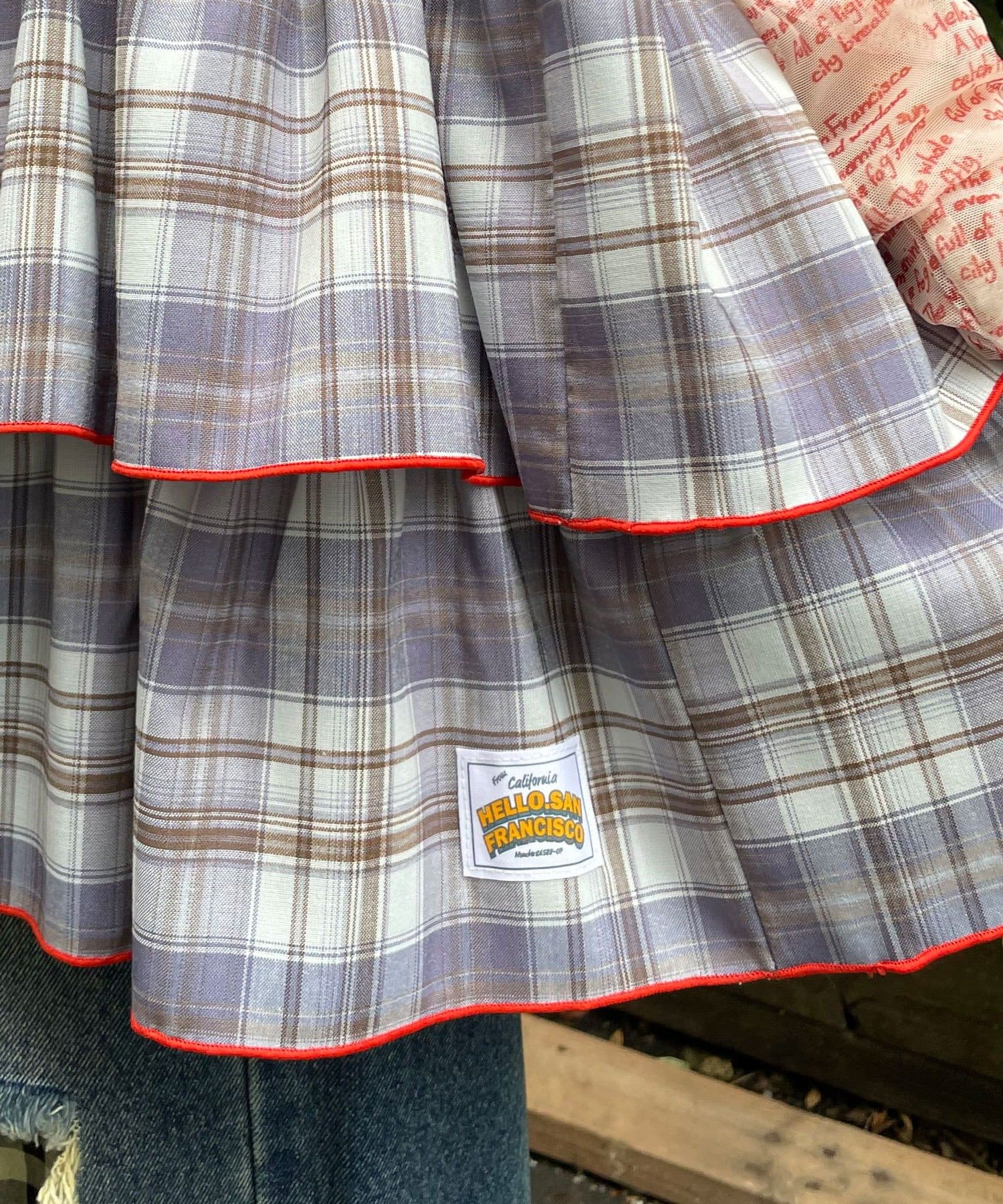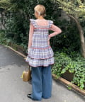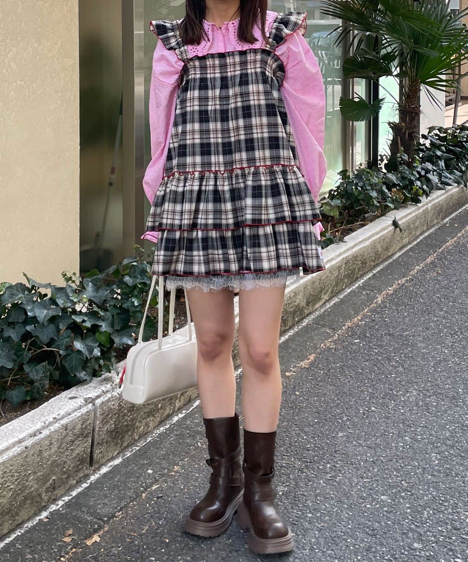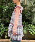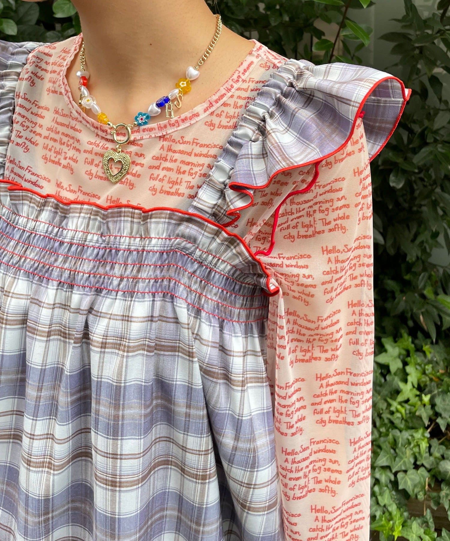 チェック柄をベースに、フリル切替と配色メローを効かせたチュニックワンピース。