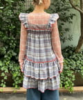 胸元のシャーリングとティアードシルエットで、ゆったりしつつも立体感のある仕上がりに。