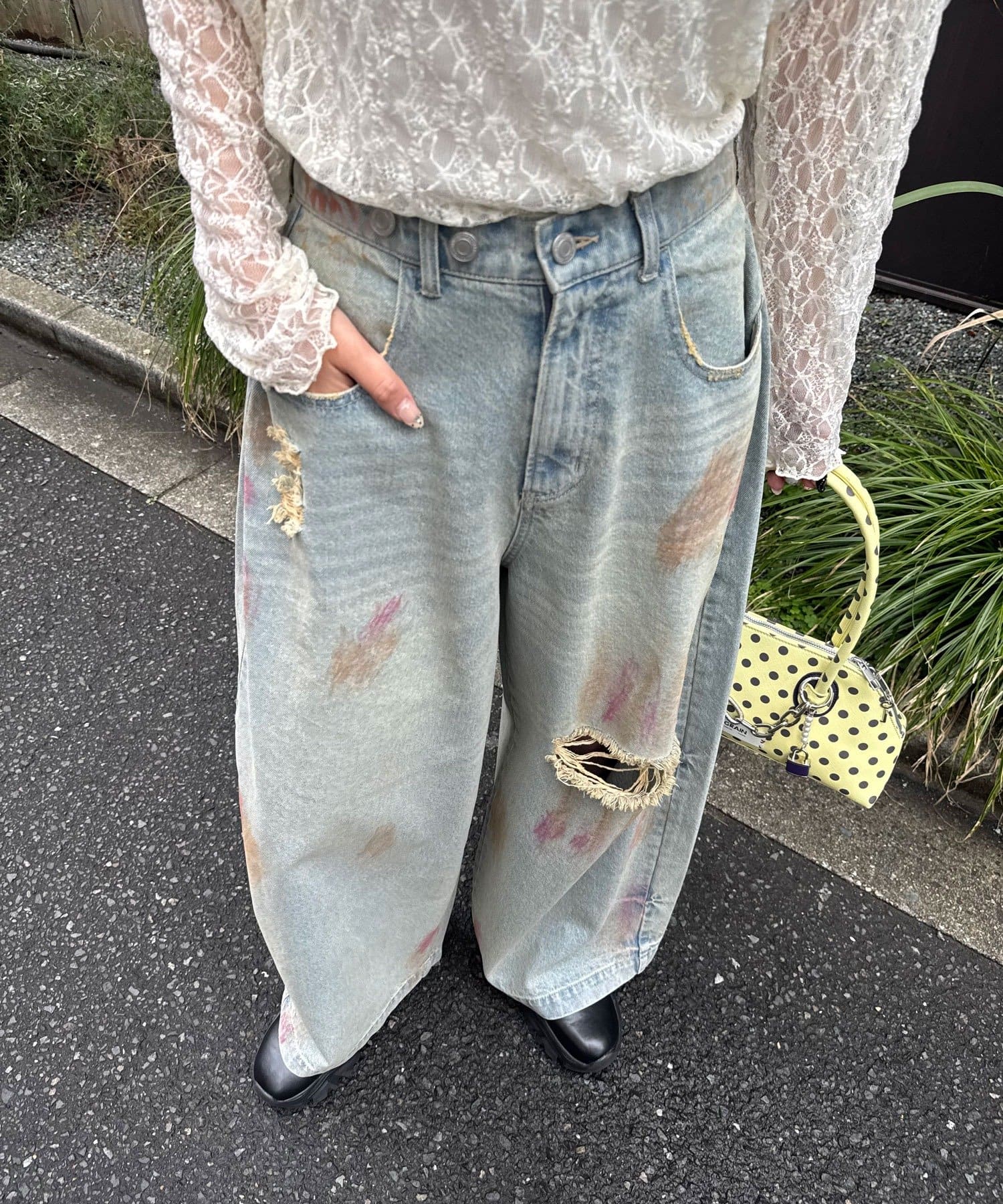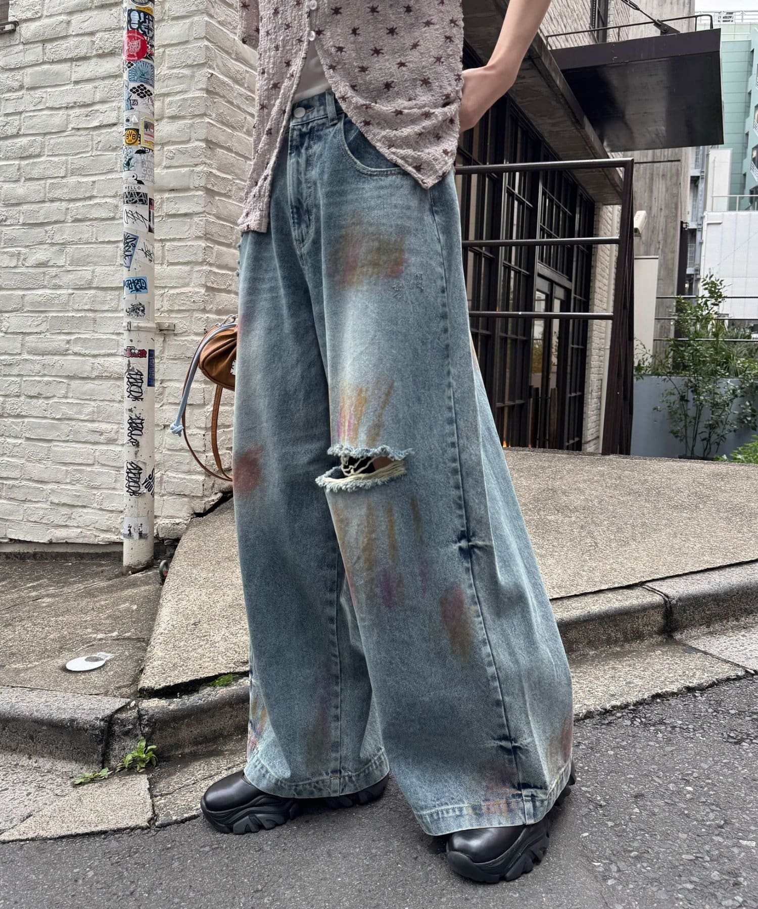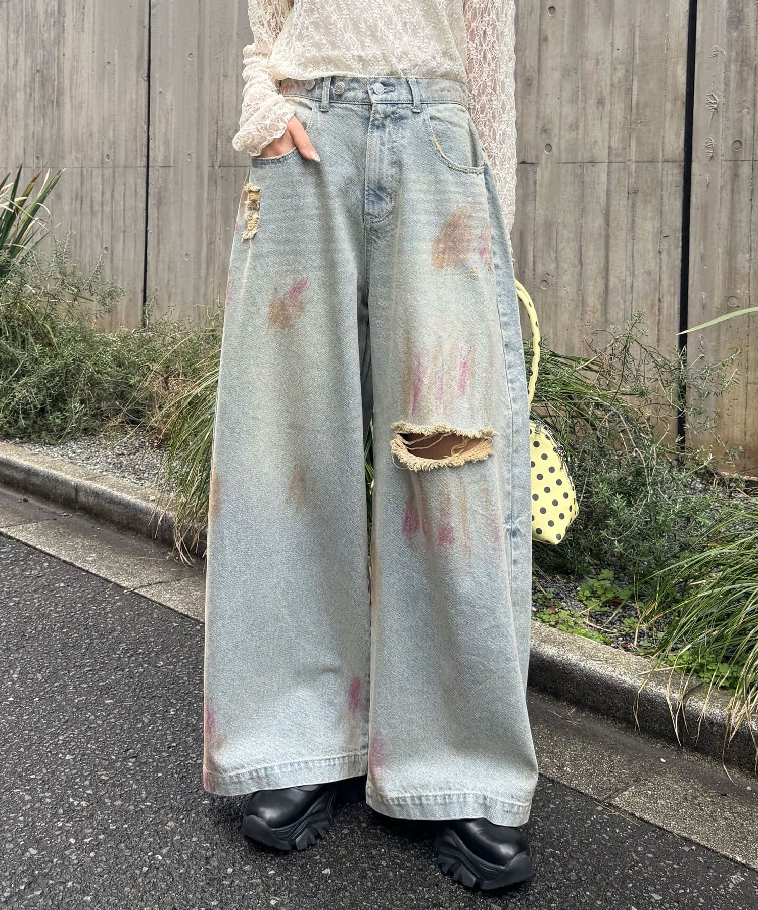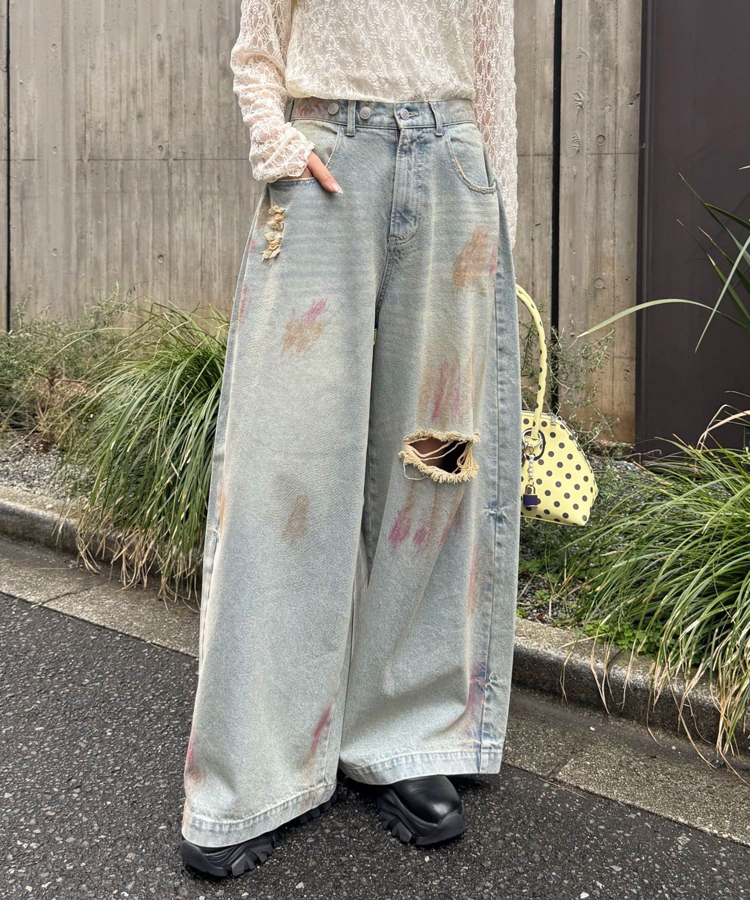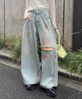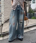 大胆なダメージとスプレー加工が目を惹く、存在感抜群のワイドデニム。