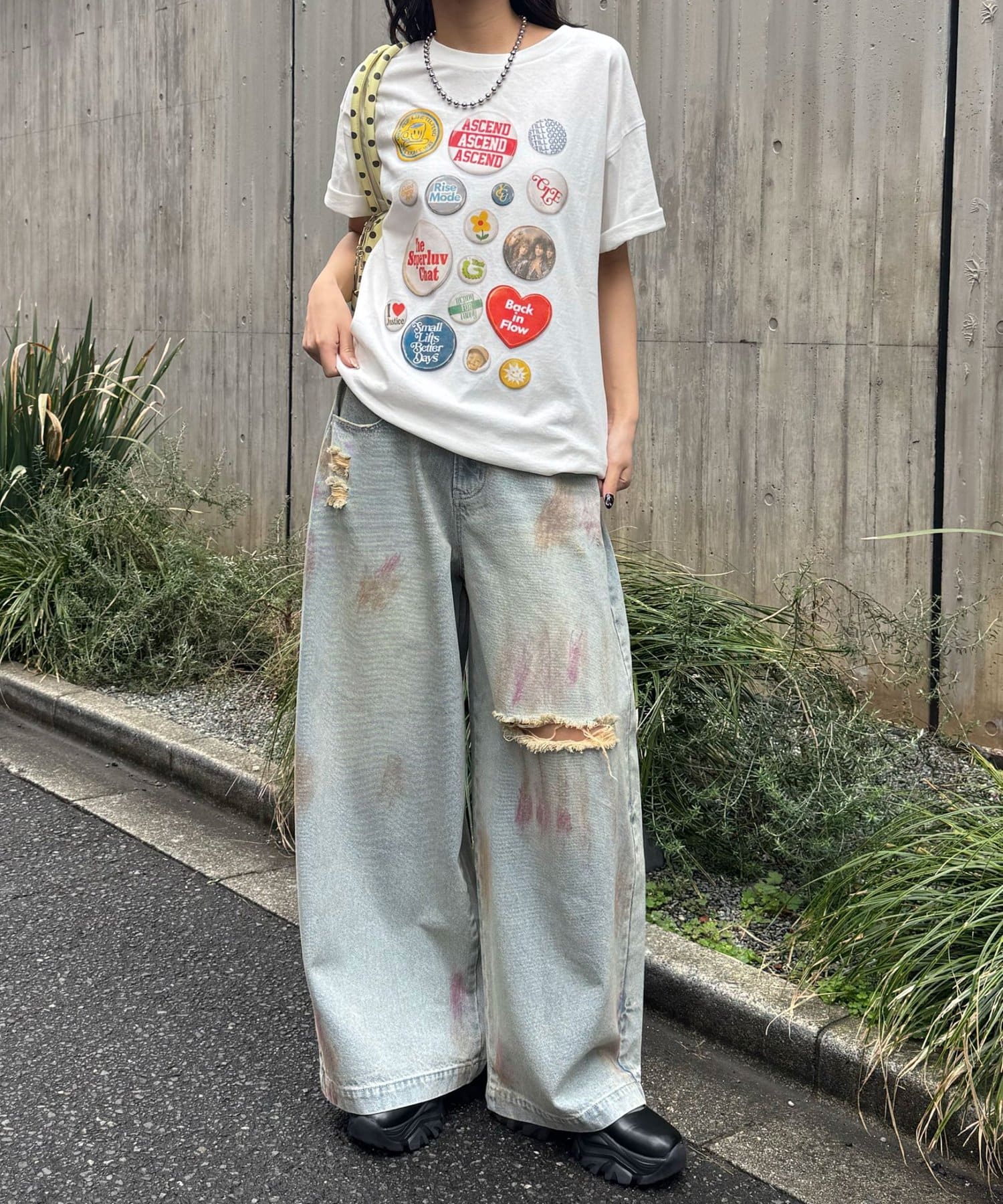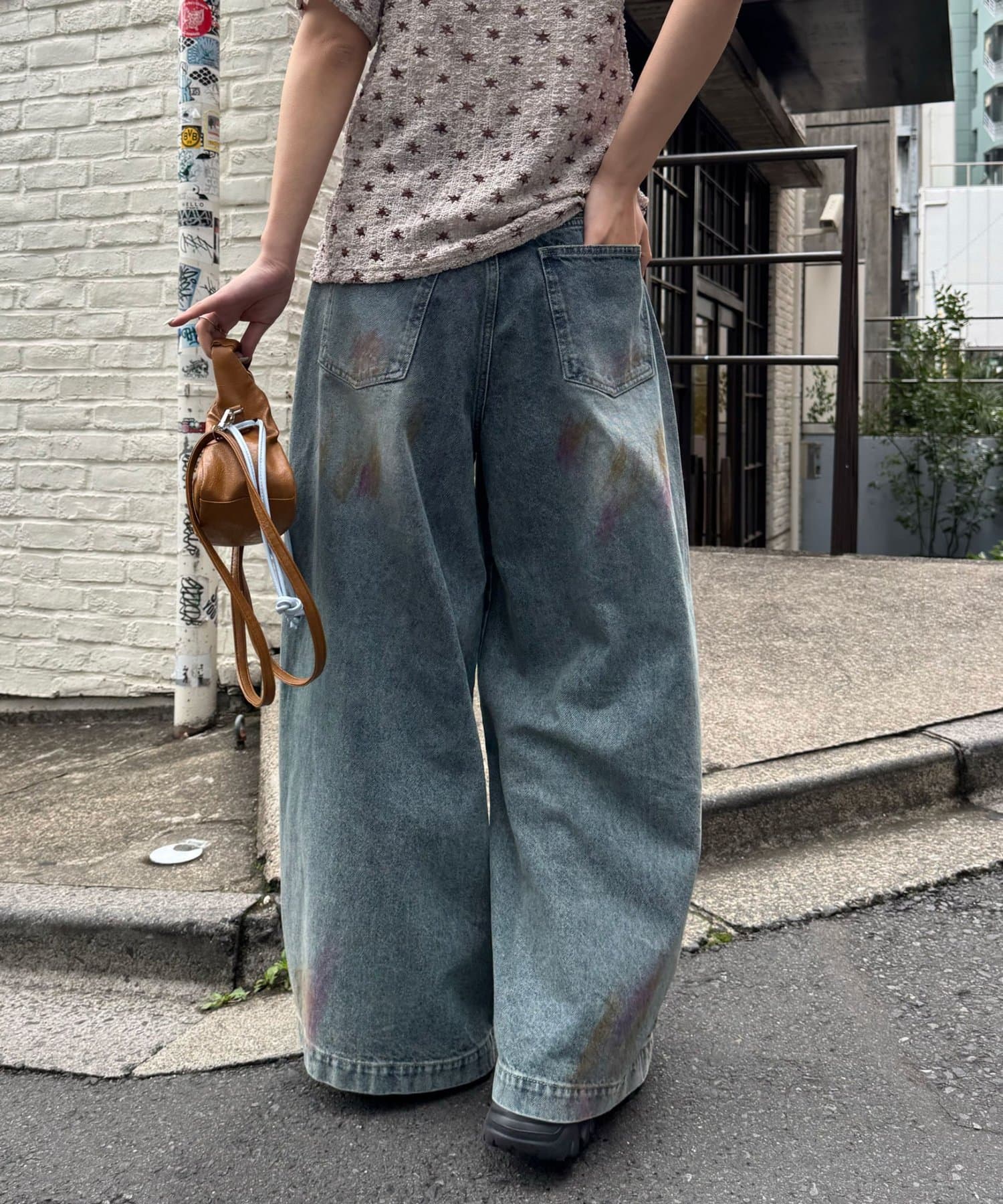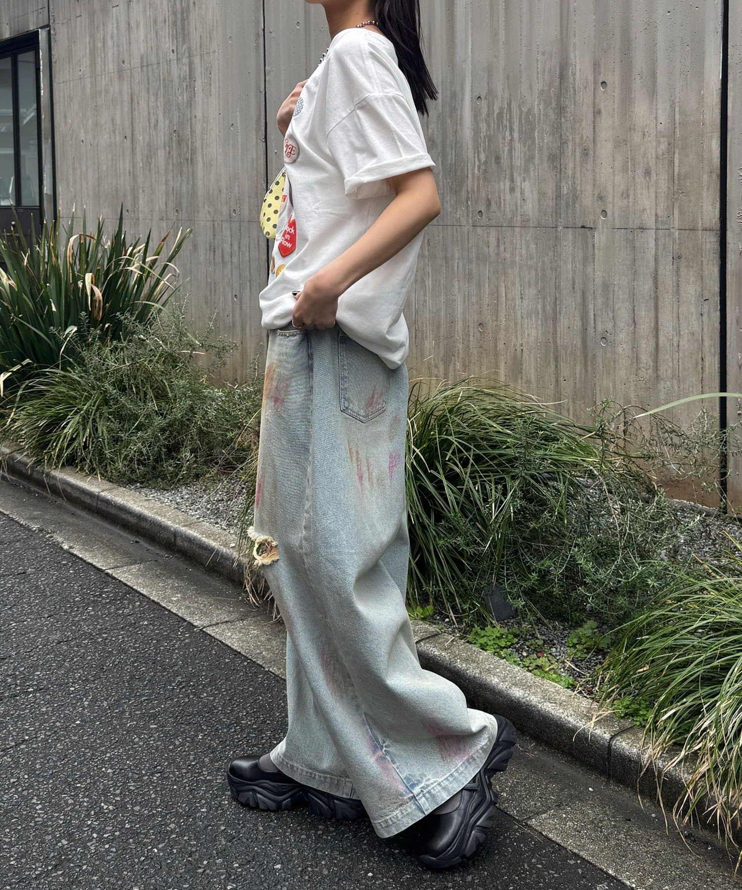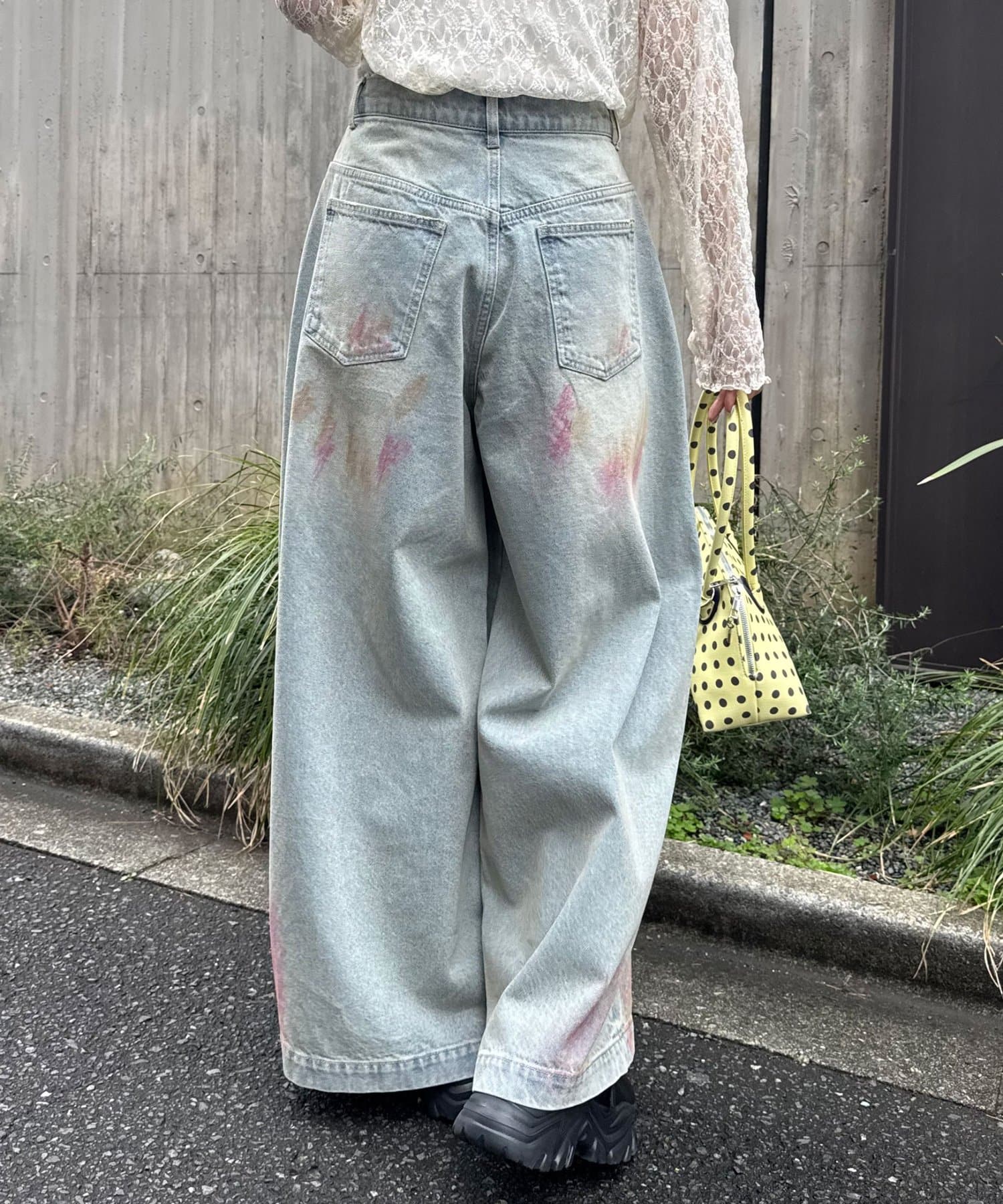 大胆なダメージとスプレー加工が目を惹く、存在感抜群のワイドデニム。