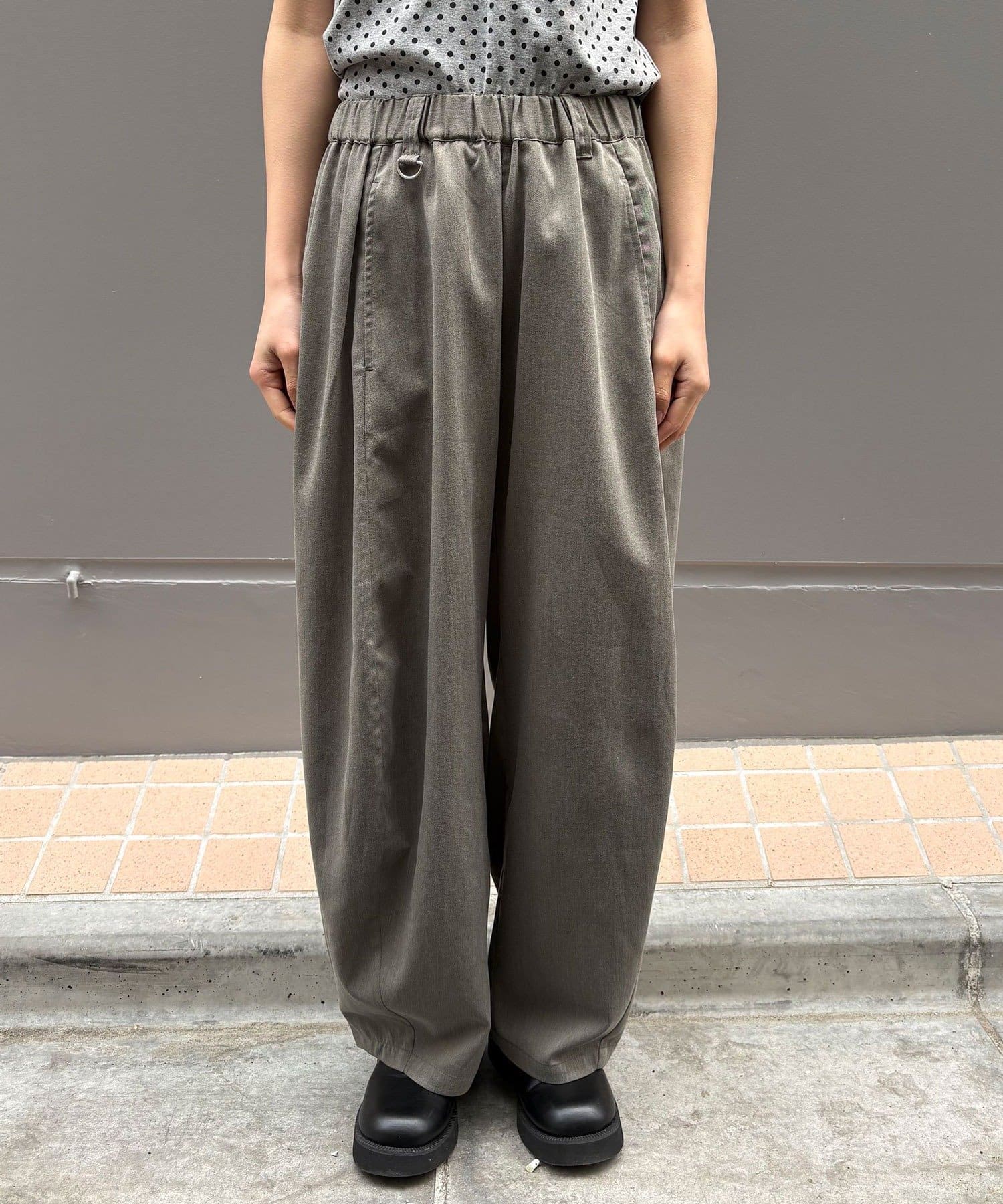 ウエストはゴム仕様で楽な穿き心地ながら、ベルトループやDカンを付けることで、タックインスタイルもすっきりと決まるデザインです。