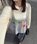 シンプルなロンTやデニムに合わせるだけで、ビスチェのロゴが主役になったカジュアルスタイルに。