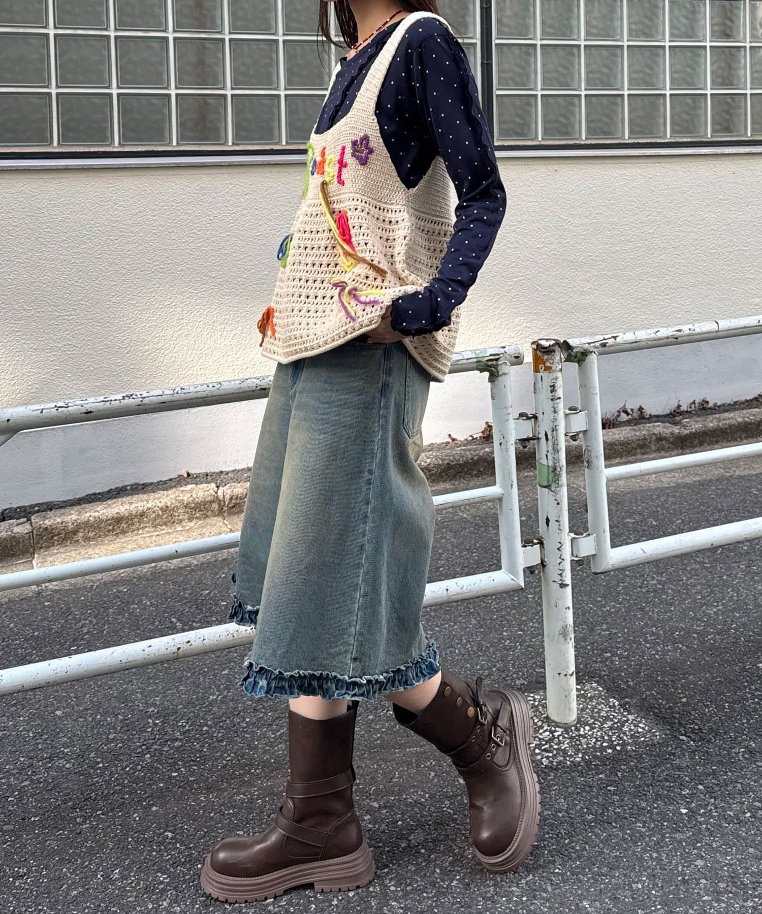 カラフルな毛糸で施された「Boost」のハンドステッチと、ランダムに垂れ下がるフリンジが遊び心たっぷりのニットビスチェ。
