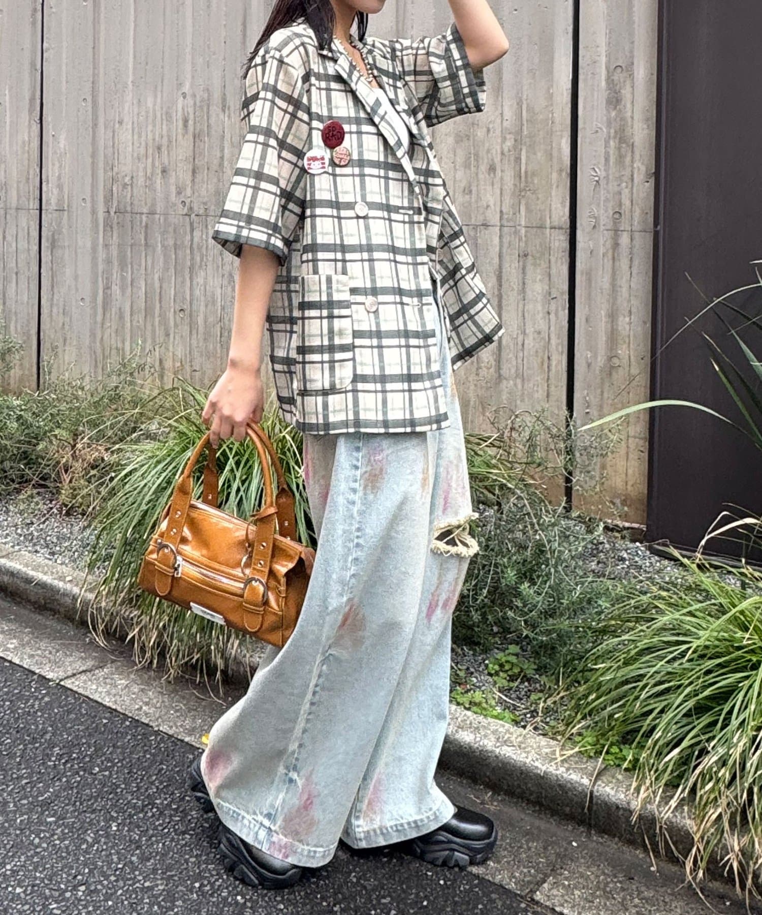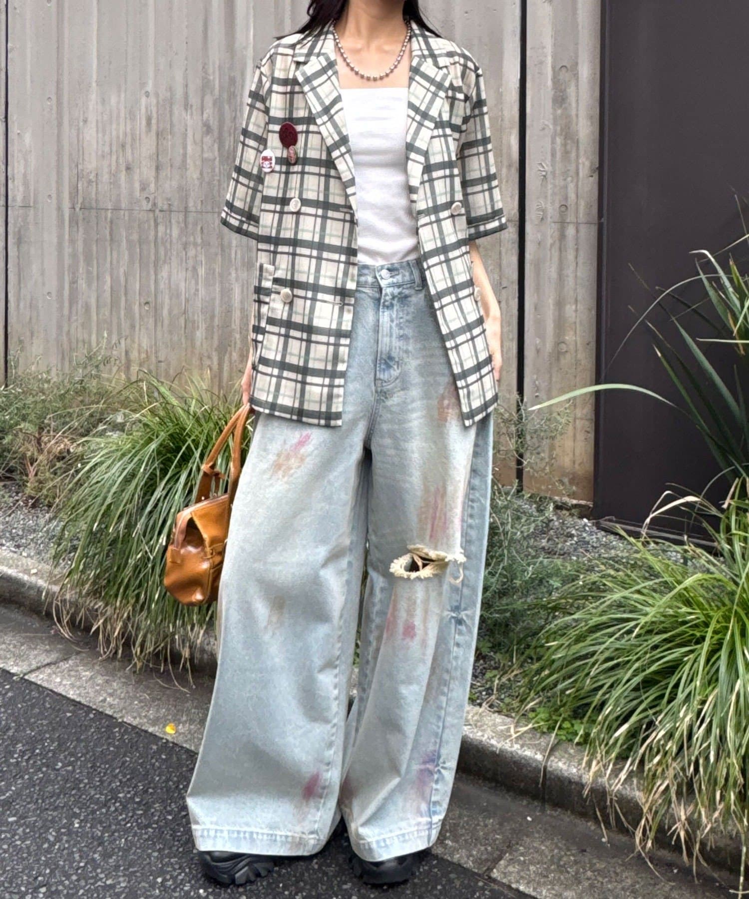 ロゴTシャツやクラッシュデニムを合わせた、カジュアルなスタイルが相性抜群。