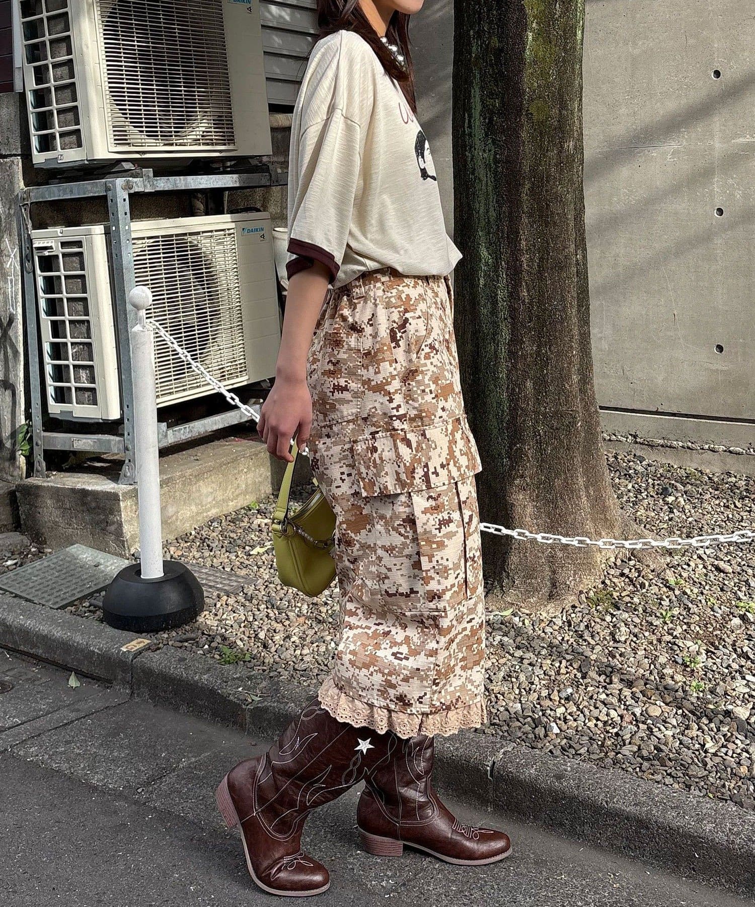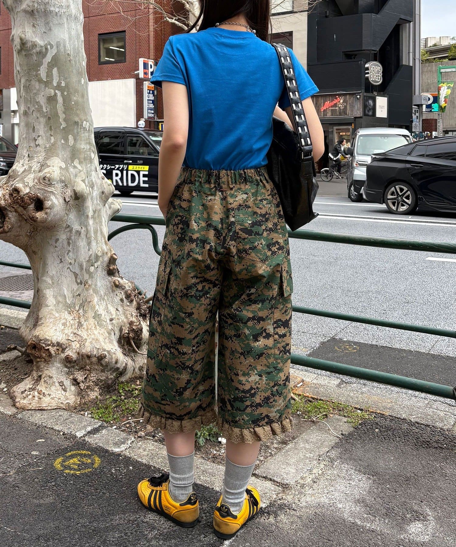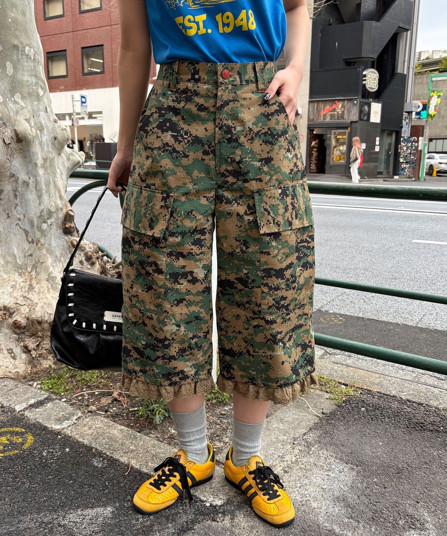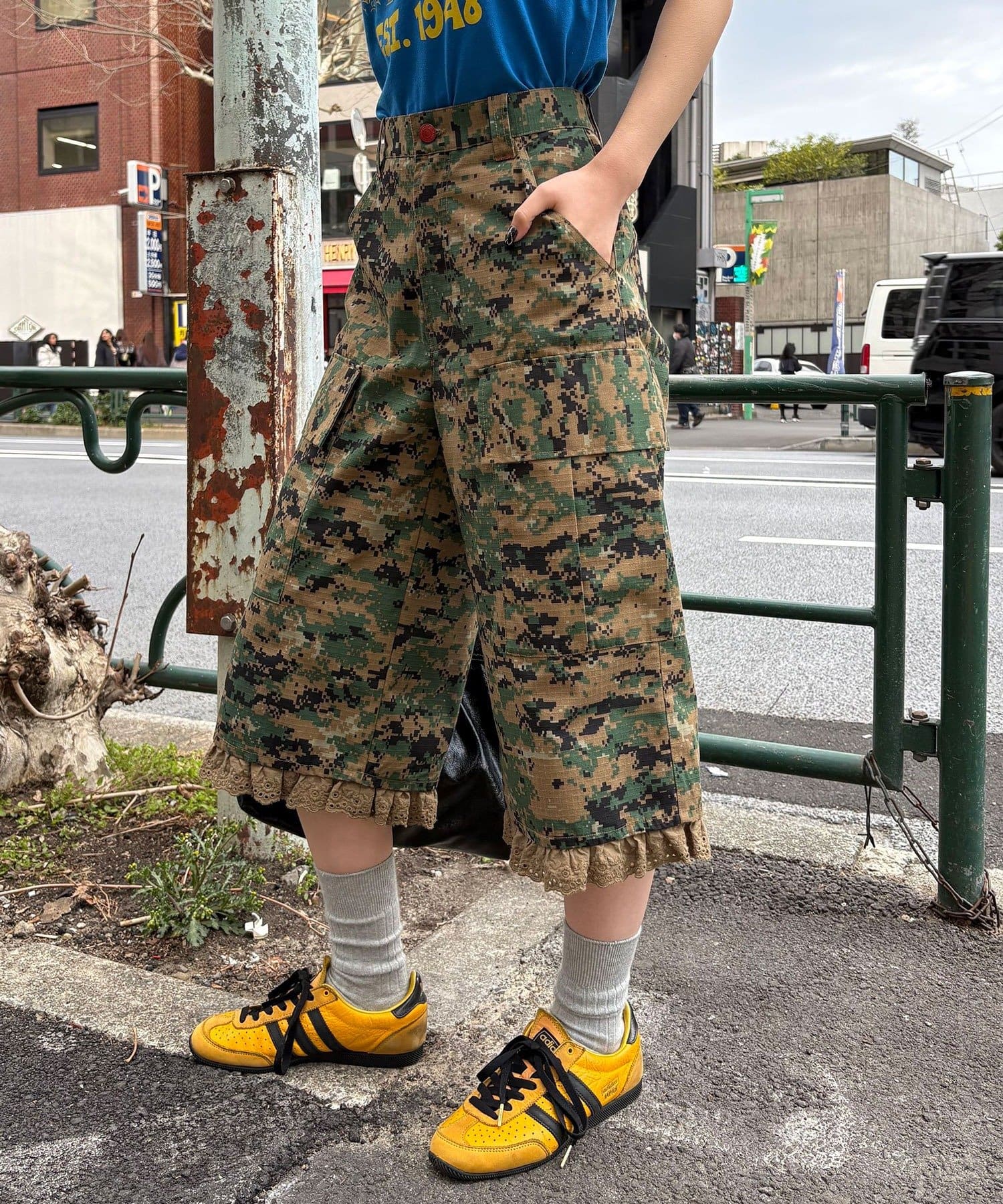 裾フリルが映えるデジカモカーゴパンツ