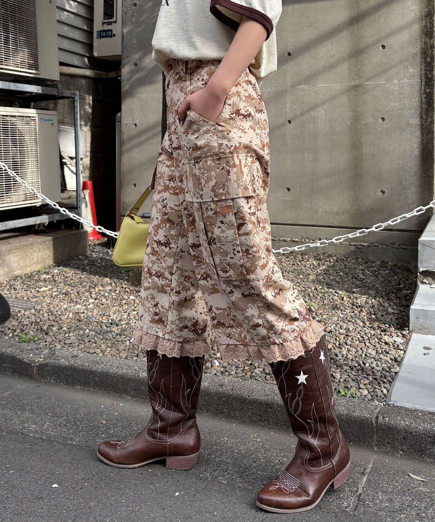 サイドには大きめのポケットを配し、ミリタリーのディテールを取り入れつつ、裾にレースのフリルをあしらうことで甘さをプラスしました。