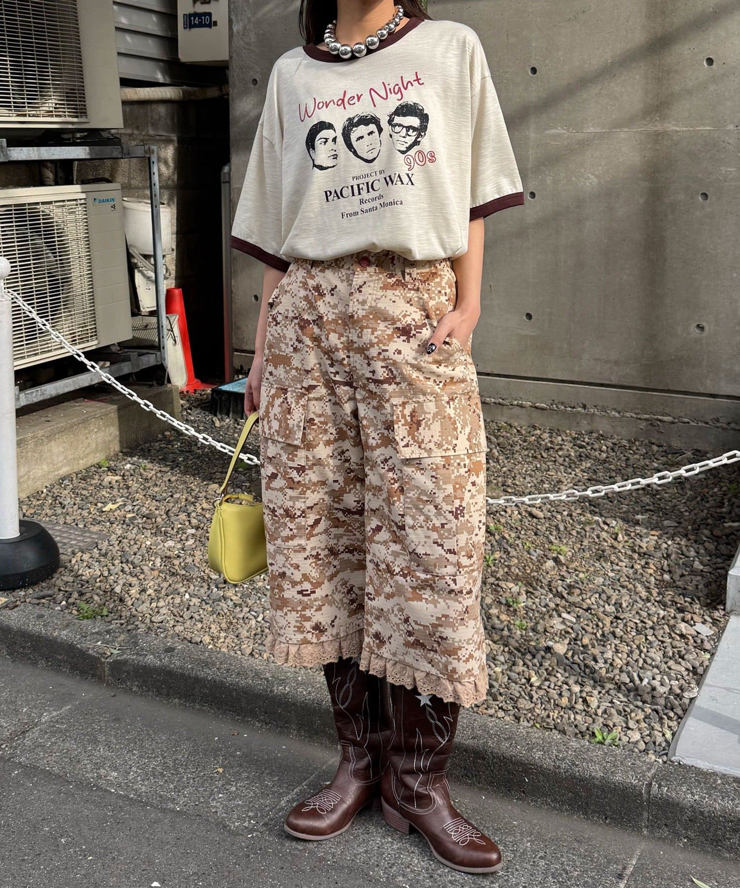 コンパクトなTシャツやタンクトップを合わせて、ボトムの甘辛いディテールを際立たせるのがおすすめ。