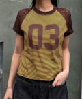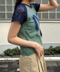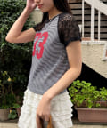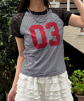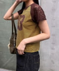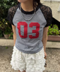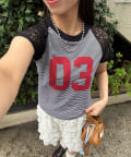 スポーティーなナンバリングロゴに、透け感のあるレースを組み合わせたリメイクライクTシャツ。